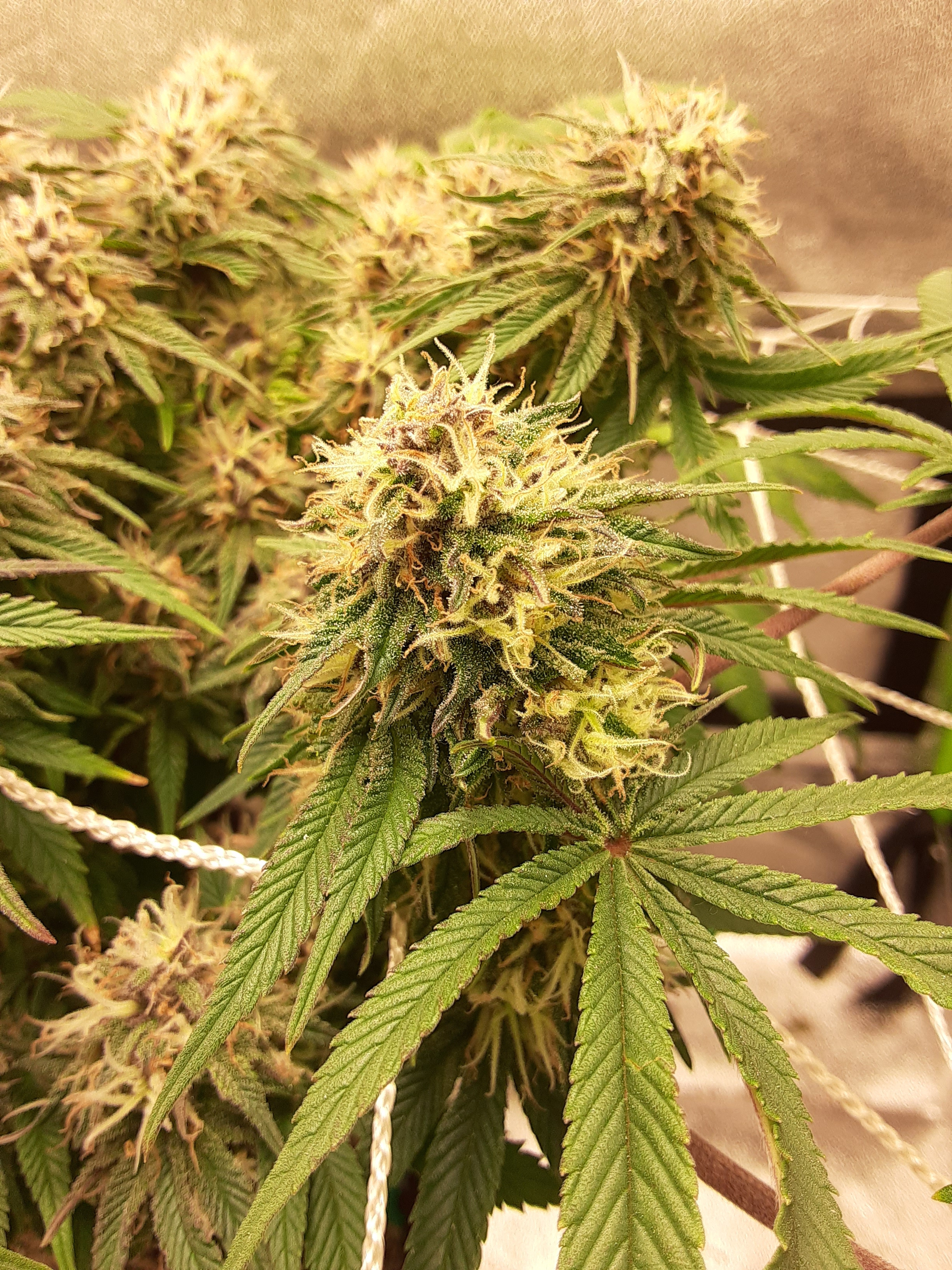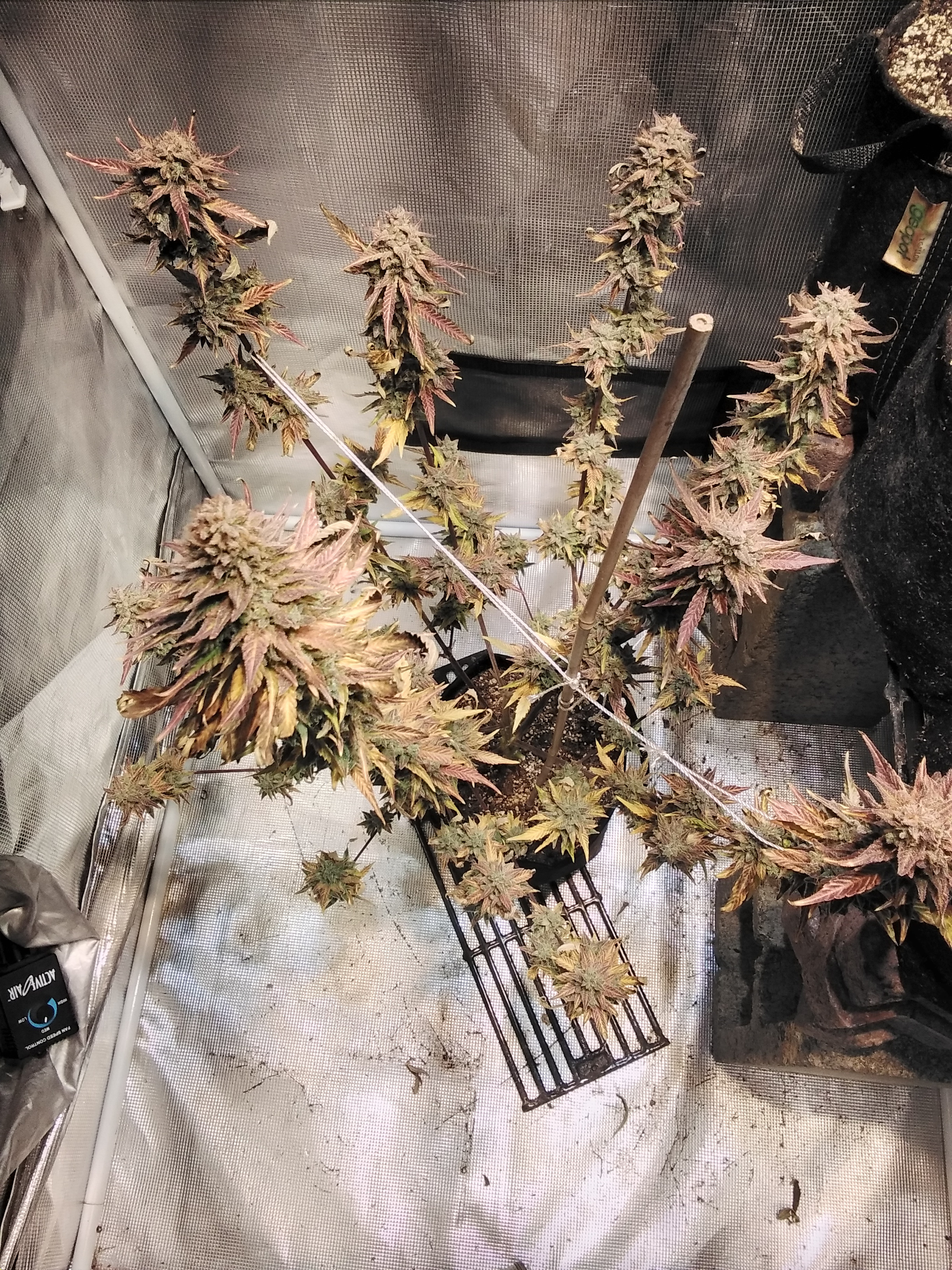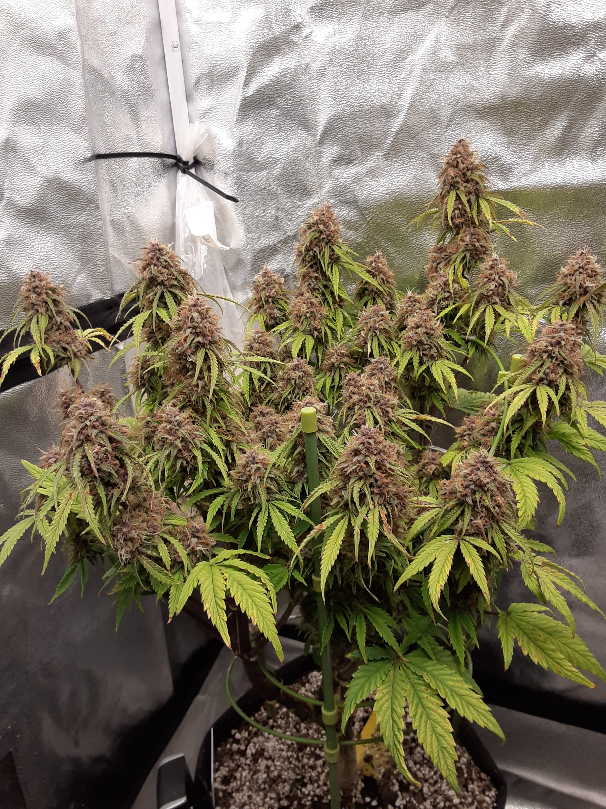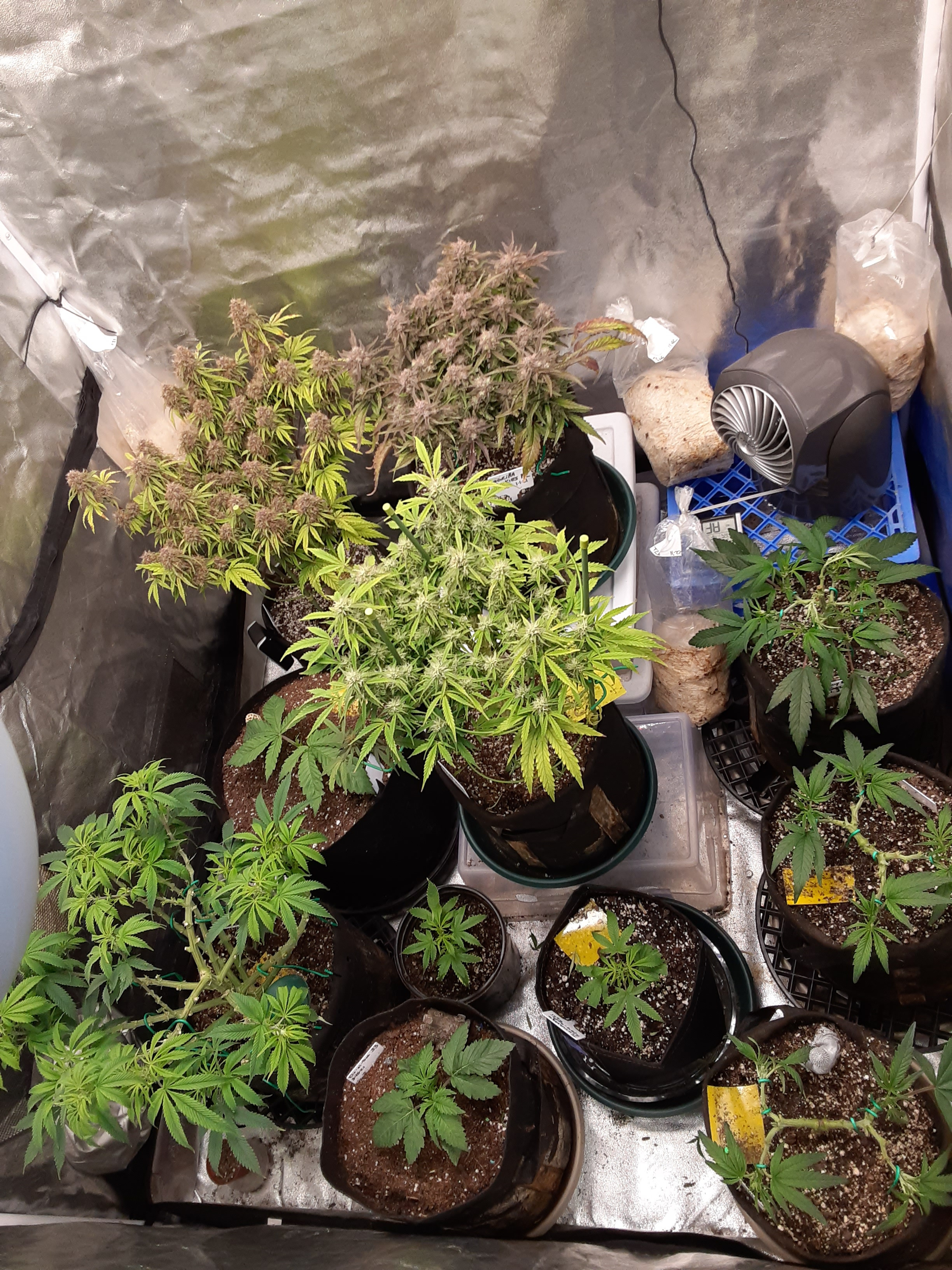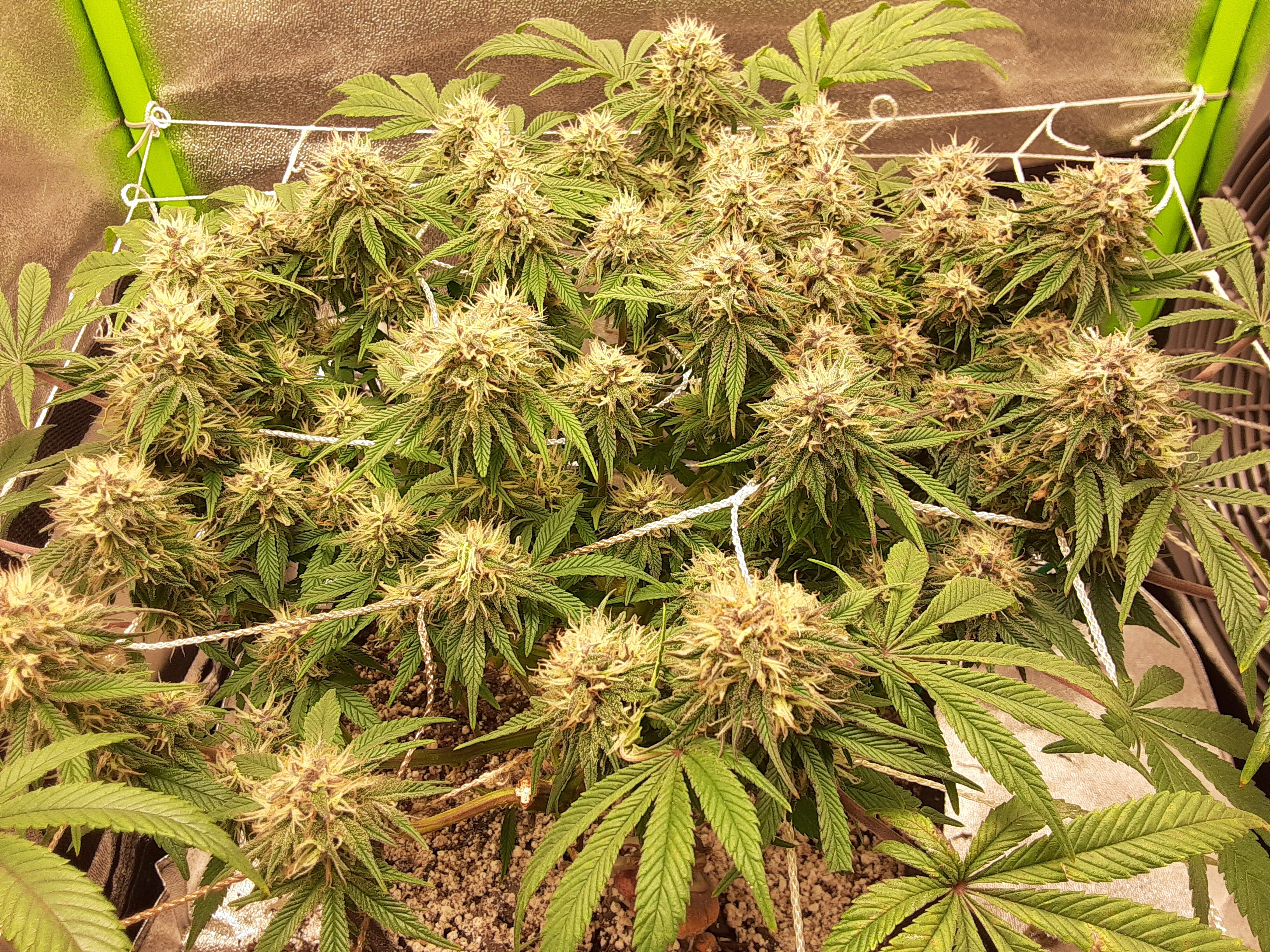 It's a 4x4 grow tent with 7 autos, I cut most of the bottom growth off to help stimulate the flowering. I also had a huge humidity problem for the last 2 weeks as the ambient RH in my house is about 50%, inside the tent it was 65-70%. Finally fixed my setup to lower it to 45% inside the tent but I think the flowers are a bit too stunted now.