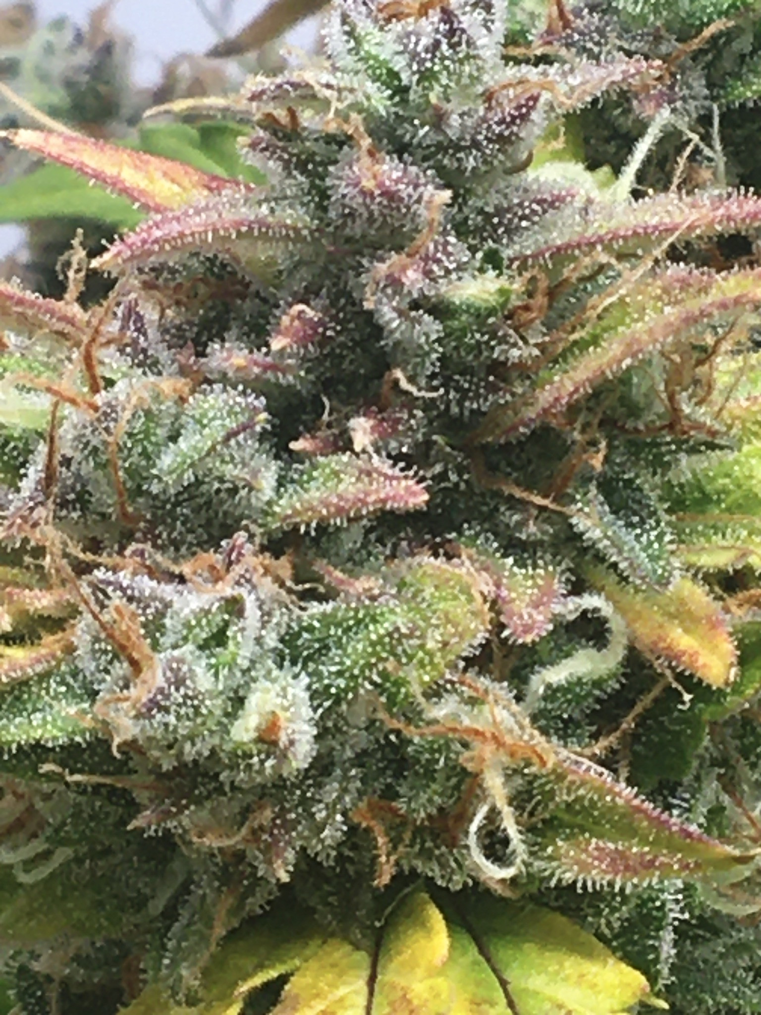 Purple Punch by Barney's Farms also Cheese by Seedsman. There are some trichromes that are real purple but they are few and I don't have the equipment to photograph them. PP is coming down soon its been flowering for 52 days. The Cheese has some amber at 64 days it will also come down soon.