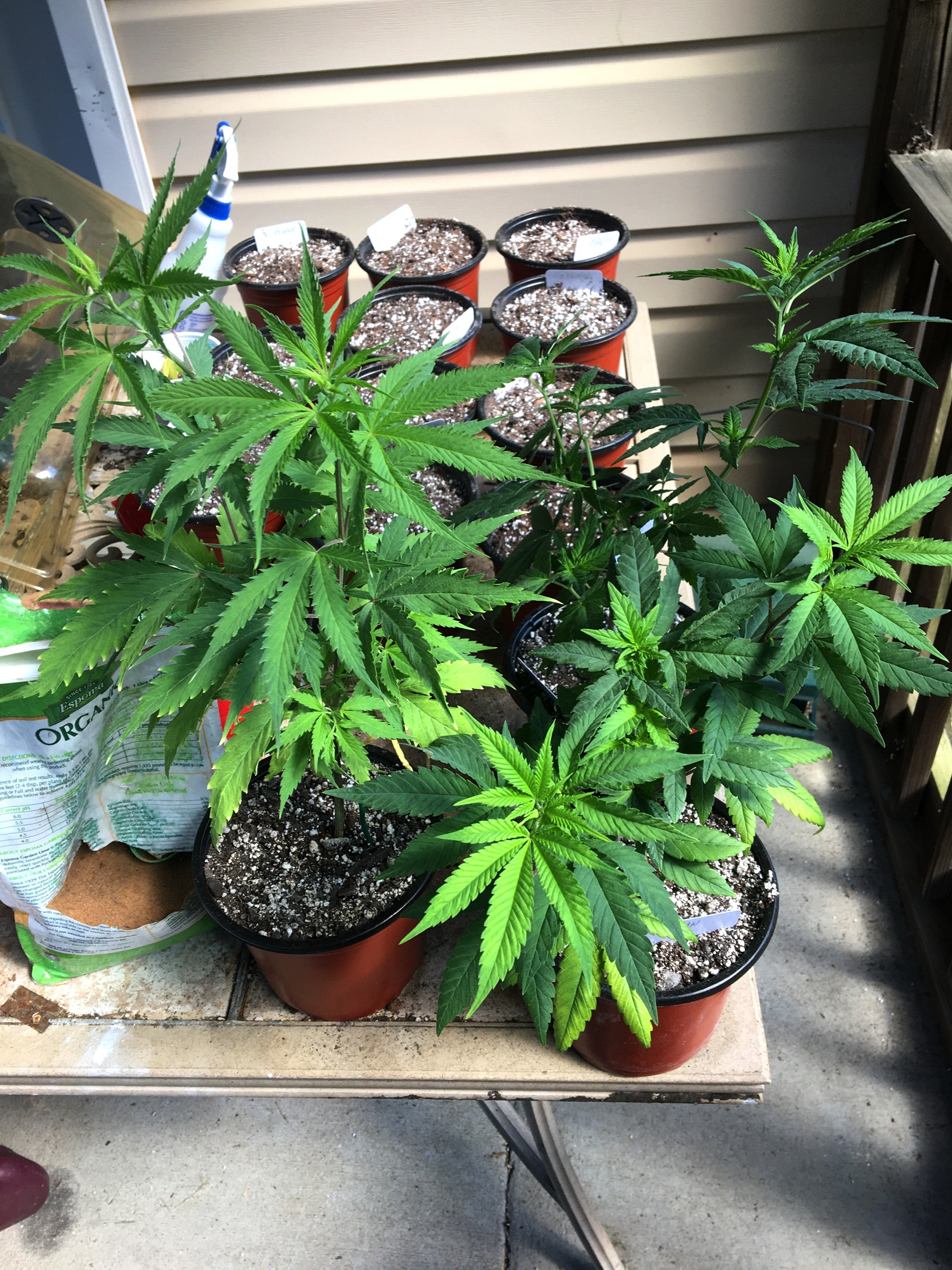 It was transplanting day for the girls ,the photos are in 1 gallon pots ,the 5 autos are in7 gallon ,and then the 4 regulars are up against the wall . I gave them all a root drench of mycorrhiza so i'm expecting them to take off . I'm giving them a few days to make sure they took the transplant well then it will be time to top them and use the tops as clones