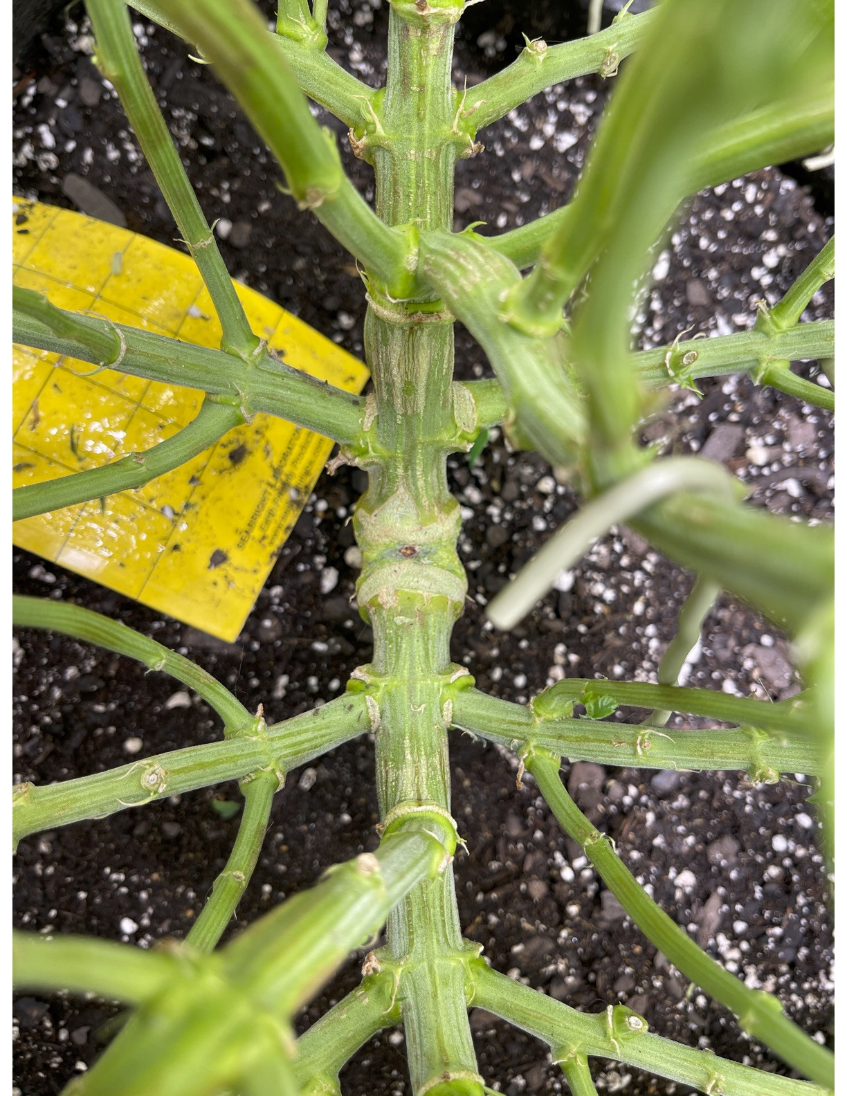 Crap, I broke it off, all I wanted was to bend it down a bit, a little lite training and it snapped off clean. No strings to hold it to try graft it back, so I stuck it in the soil. It will not make it, but, crap!