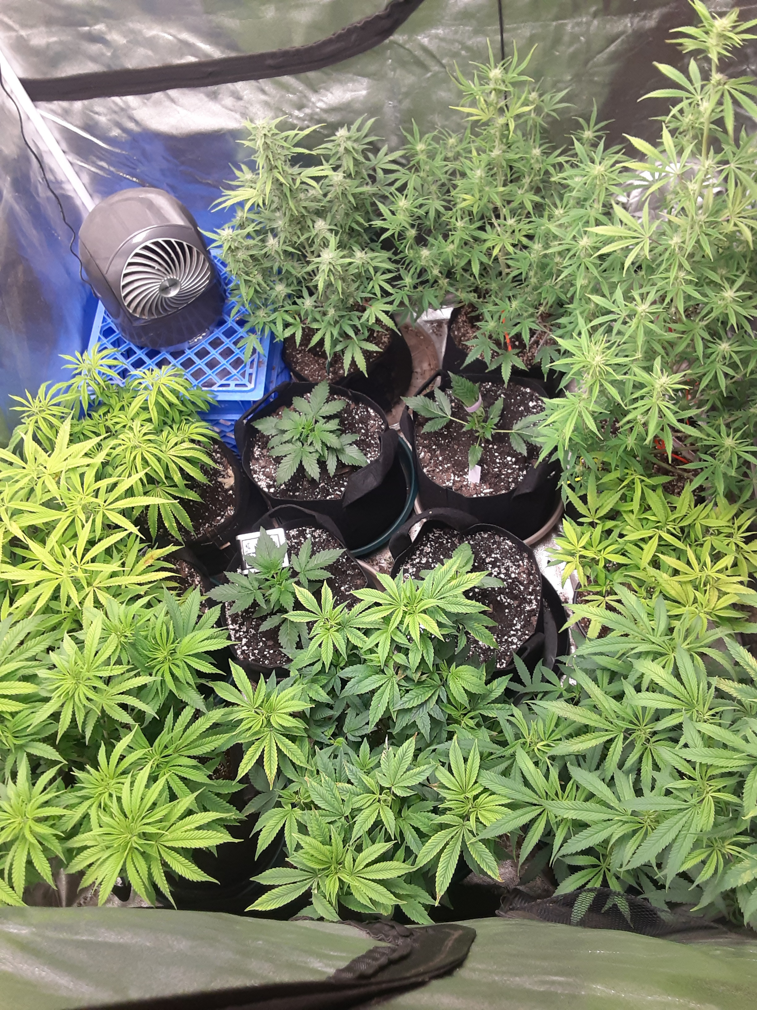 Floopydoop Laugh or cry, I'd rather laugh. I started a Wild Thai seed earlier this month, transplanted it into a 5 gal bag yesterday, it's at node 5 or 6 already. Waiting for it to get used to its new home, looks OK so far today. Using my new vipar light, closet temp has been good so far, at 75% right now, testing the waters.