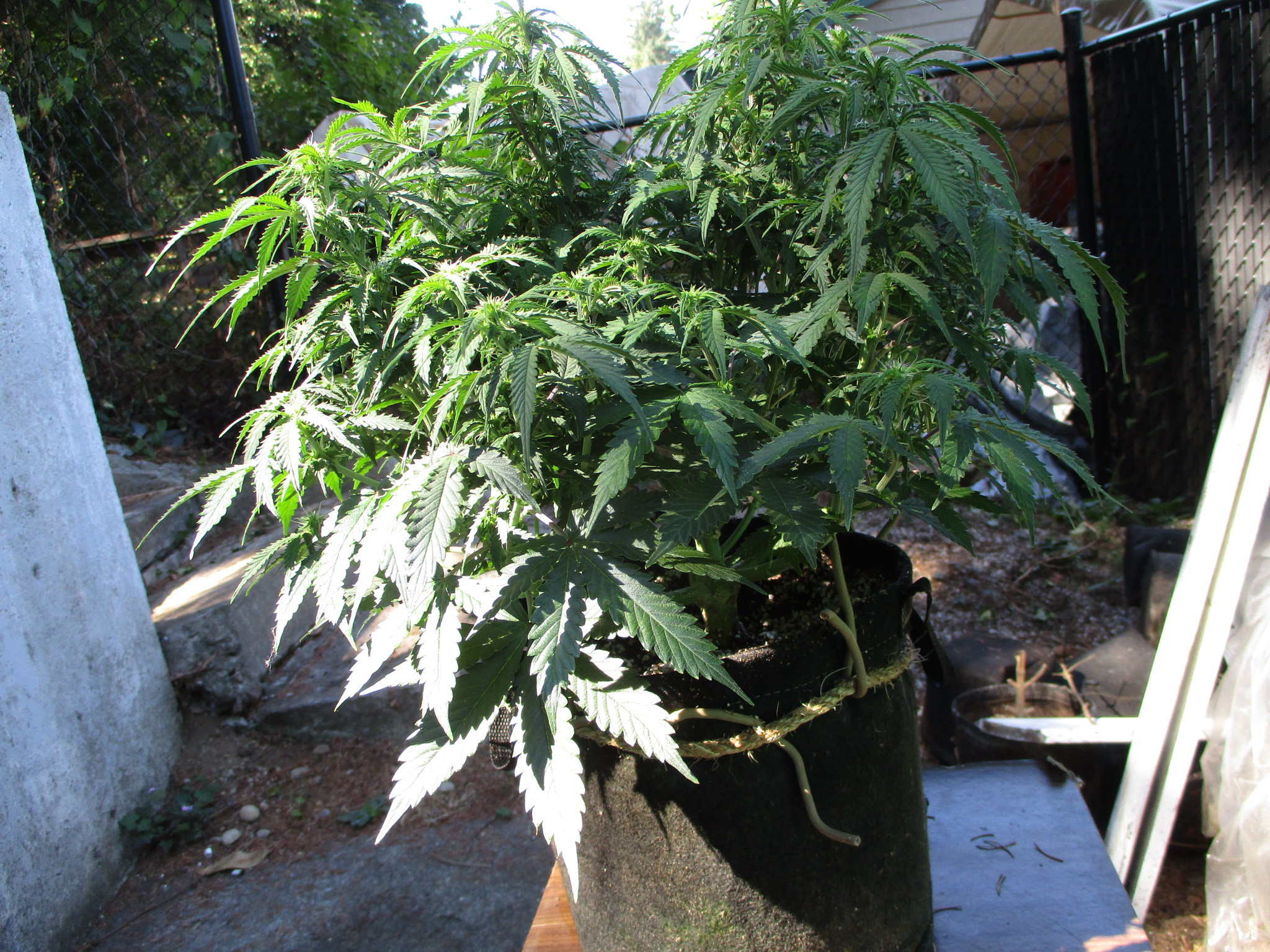 < joy LOL. She's the tallest and i am sure gonna have to break/bend the main tops in order to get her to finish inside my hippy greenhouse. She's a wide gal in a 10gal. pot, other than being 3wks behind the other indica hybreds she's done great just got taller than i expected. So maybe hoping for mid to late Oct.? This strain as in most indicas likes warmer dryer grows, not really suited for where i'm at but i'll give her a real good dry home come time. Smoky this morning, sun is orange.