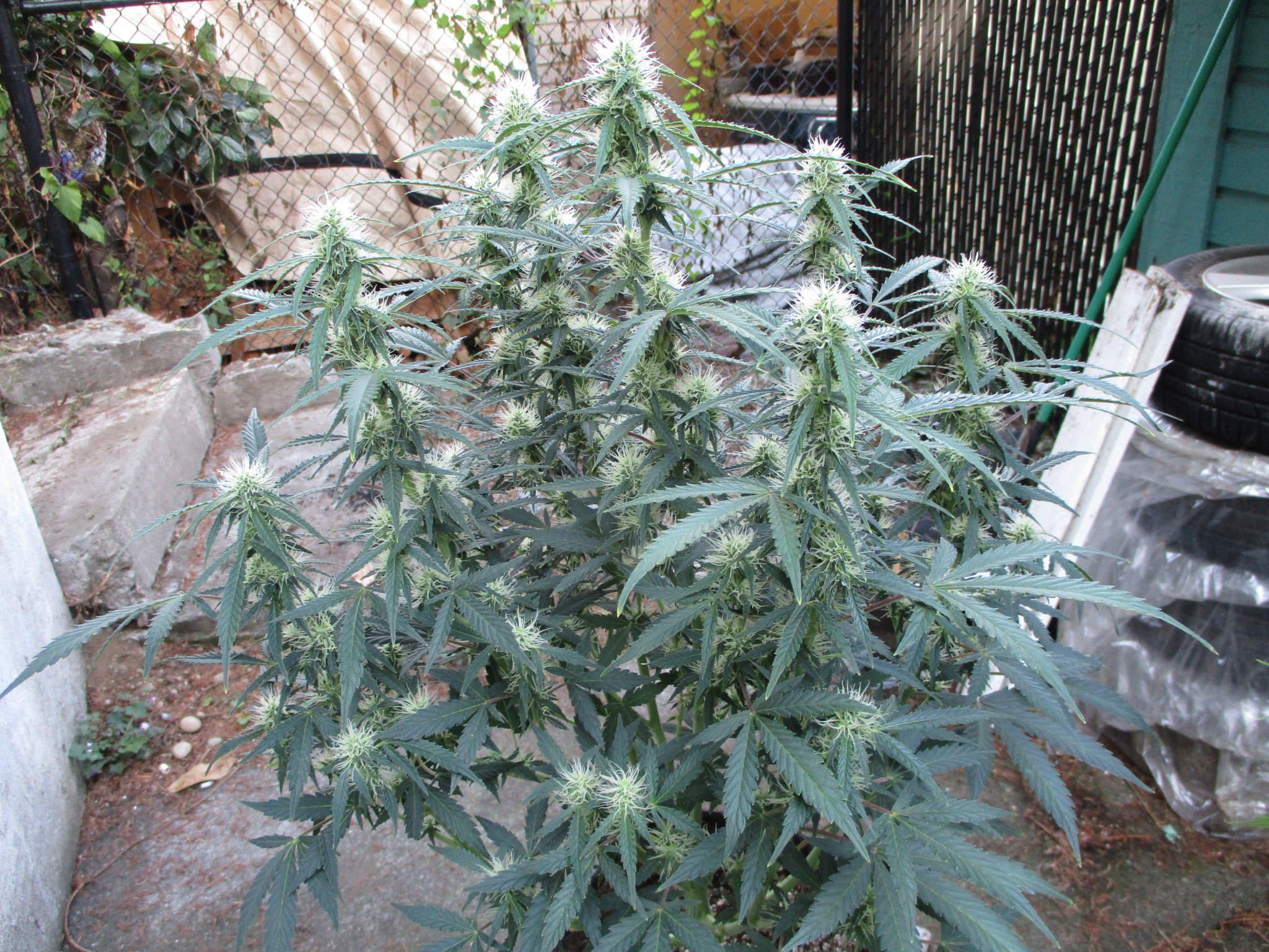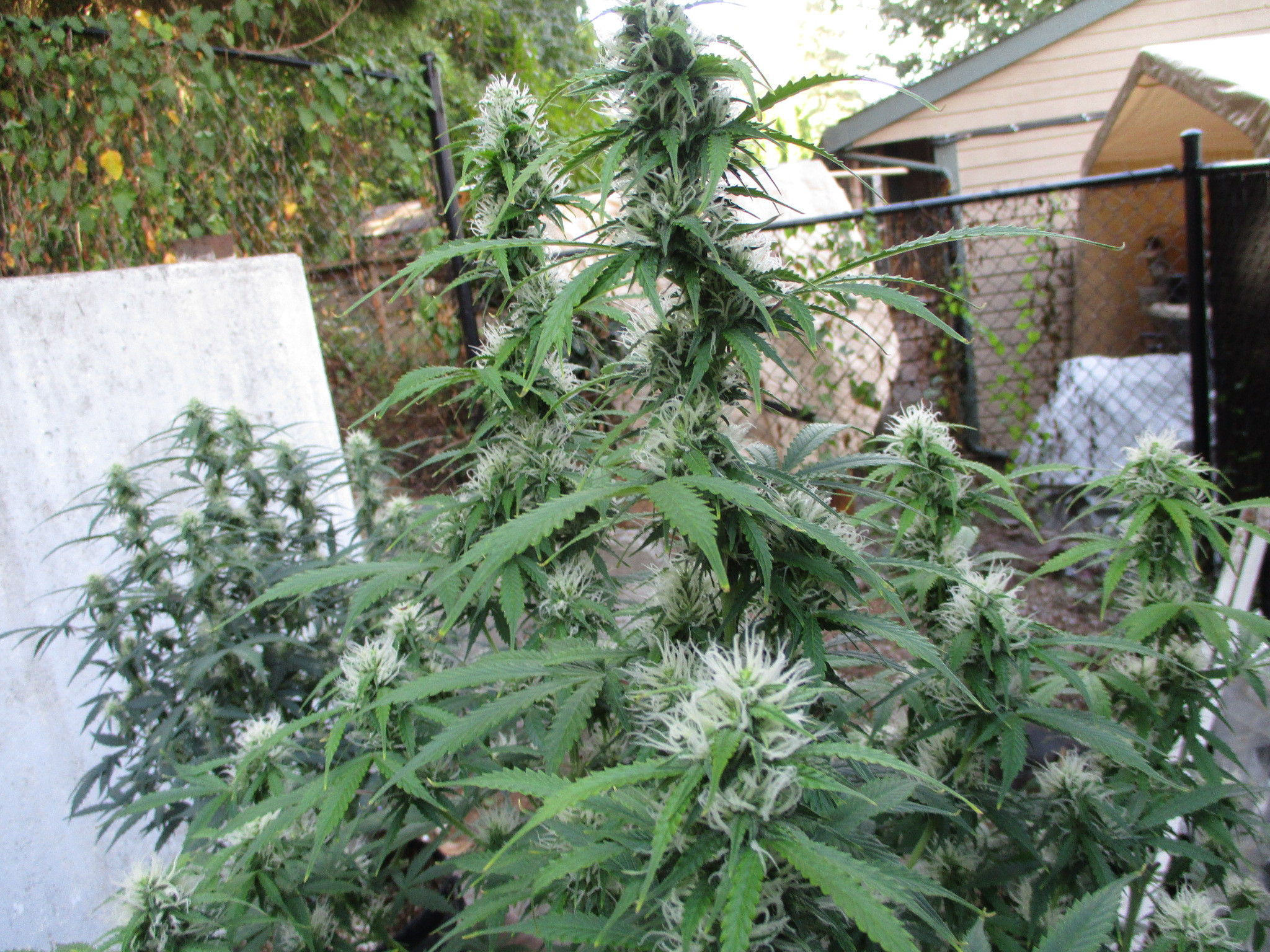 < joy LOL. She's the tallest and i am sure gonna have to break/bend the main tops in order to get her to finish inside my hippy greenhouse. She's a wide gal in a 10gal. pot, other than being 3wks behind the other indica hybreds she's done great just got taller than i expected. So maybe hoping for mid to late Oct.? This strain as in most indicas likes warmer dryer grows, not really suited for where i'm at but i'll give her a real good dry home come time. Smoky this morning, sun is orange.