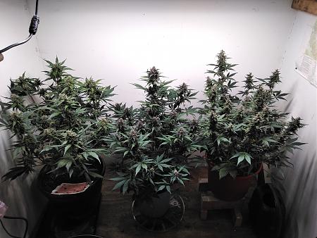 ID:	535906 my first auto run and my first indoor run. wanted purple weed since ive never actually seen any in the flesh just heard rumors. hey im old and out of touch. three bloody skunks. three different phenos. one on right had very tight node spacing and stacking buds. reddish in color and smells like lavender. middle went purple and had typical arrowhead shaped buds and smells like grape bubblegum. right was a mutation. never ghad a normal leaf. green with red hues and smells more like earth. 10 oz off of them. Click image for larger version