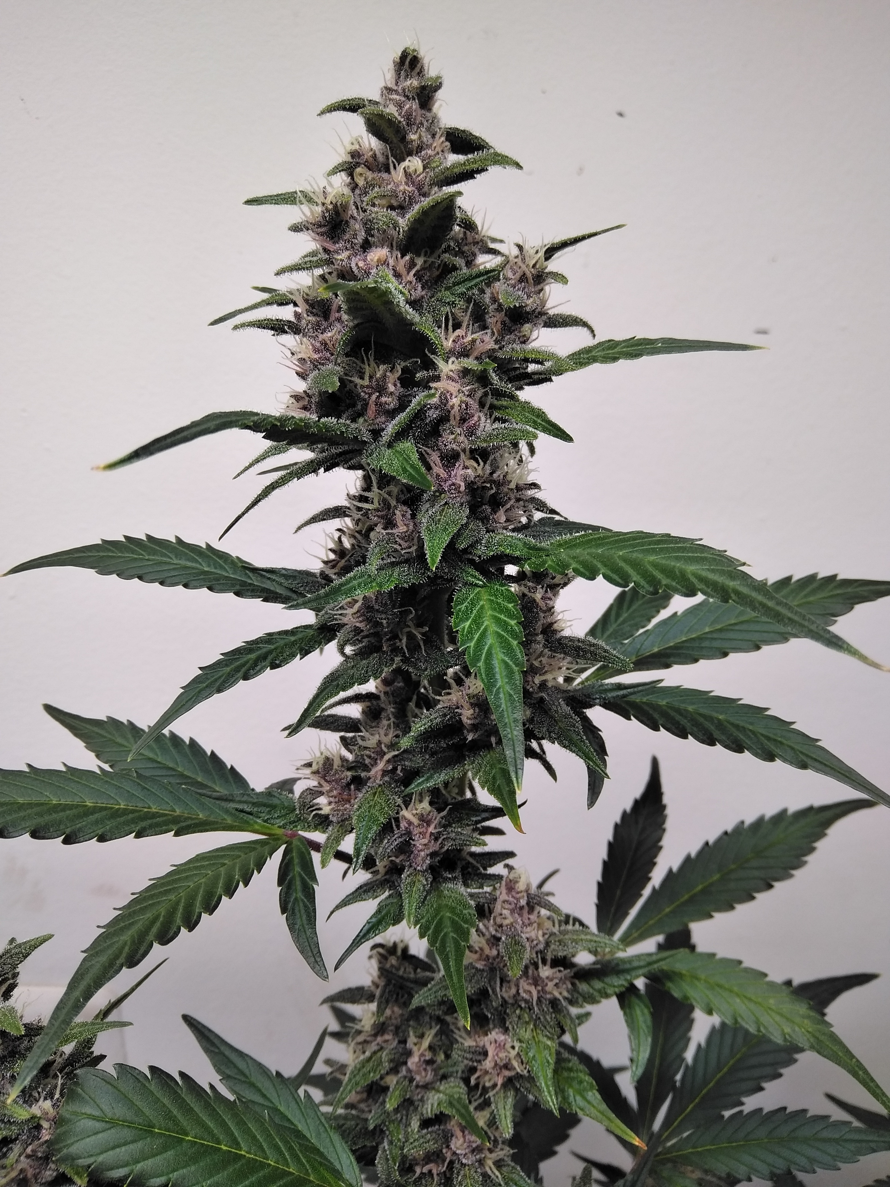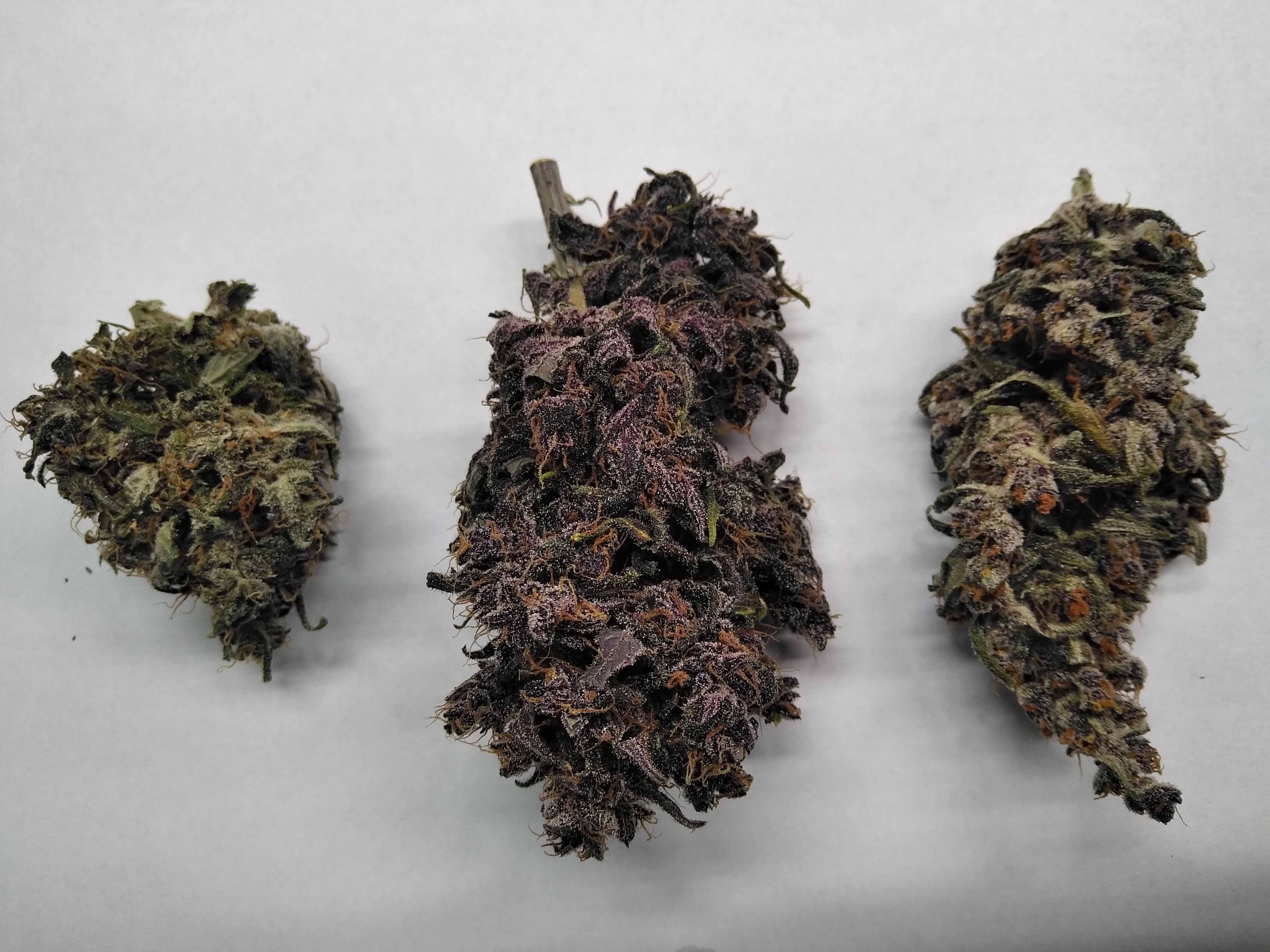 ID:	535906 my first auto run and my first indoor run. wanted purple weed since ive never actually seen any in the flesh just heard rumors. hey im old and out of touch. three bloody skunks. three different phenos. one on right had very tight node spacing and stacking buds. reddish in color and smells like lavender. middle went purple and had typical arrowhead shaped buds and smells like grape bubblegum. right was a mutation. never ghad a normal leaf. green with red hues and smells more like earth. 10 oz off of them. Click image for larger version