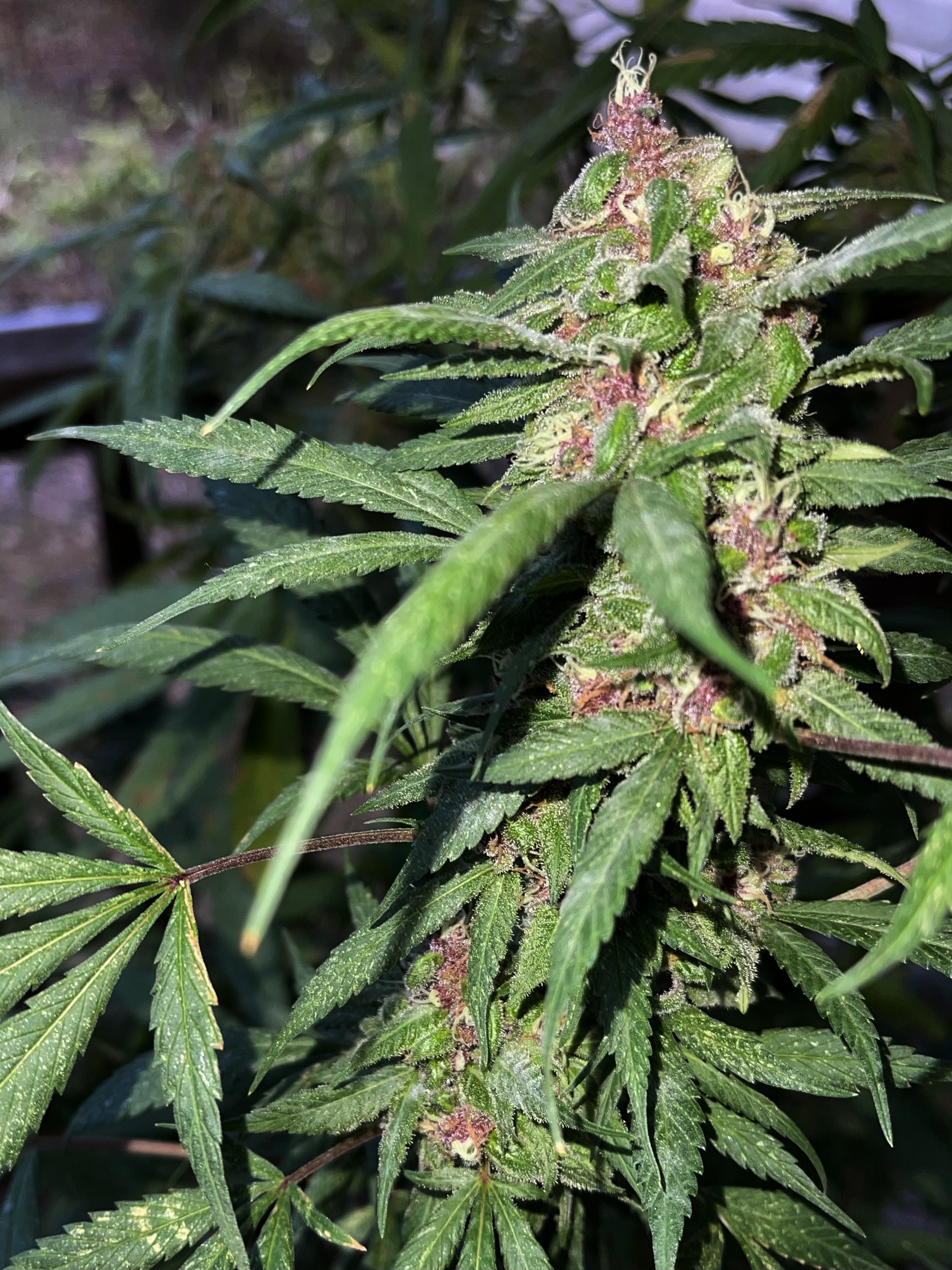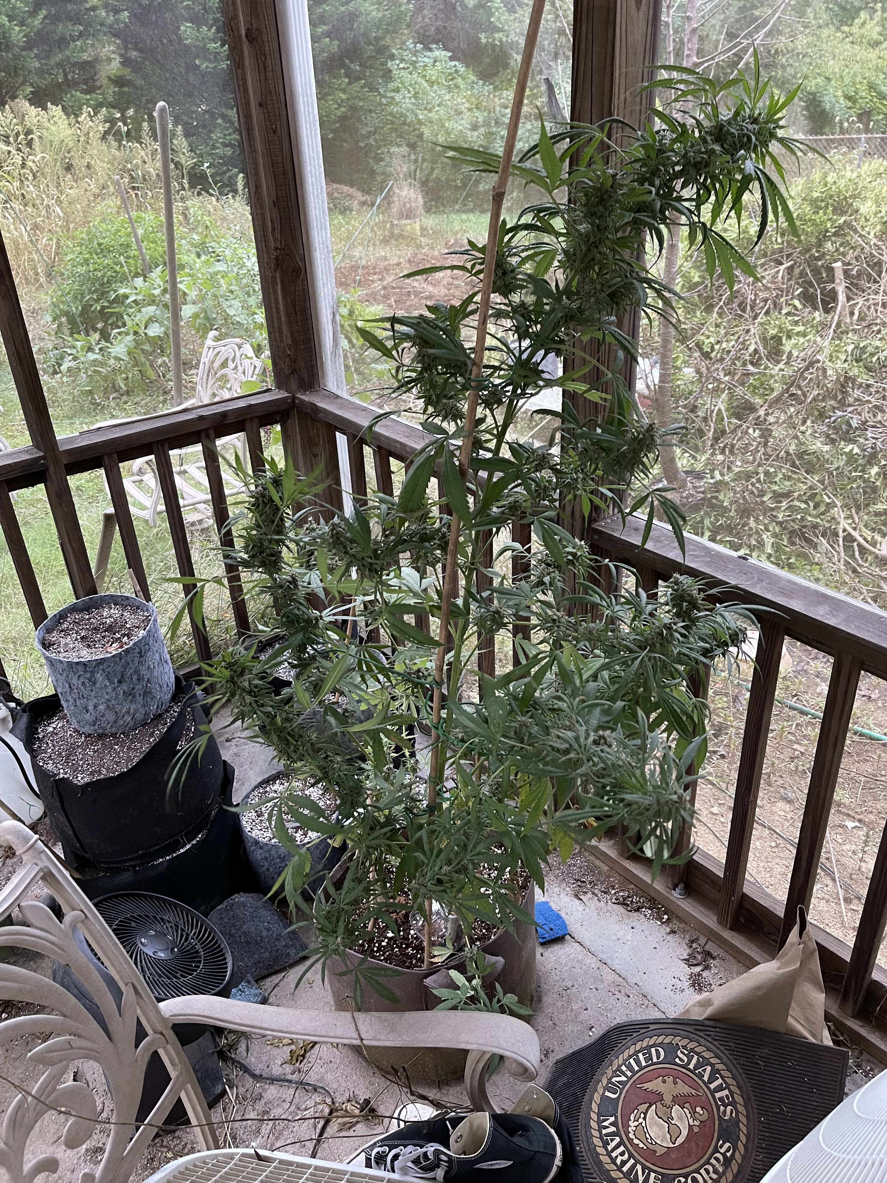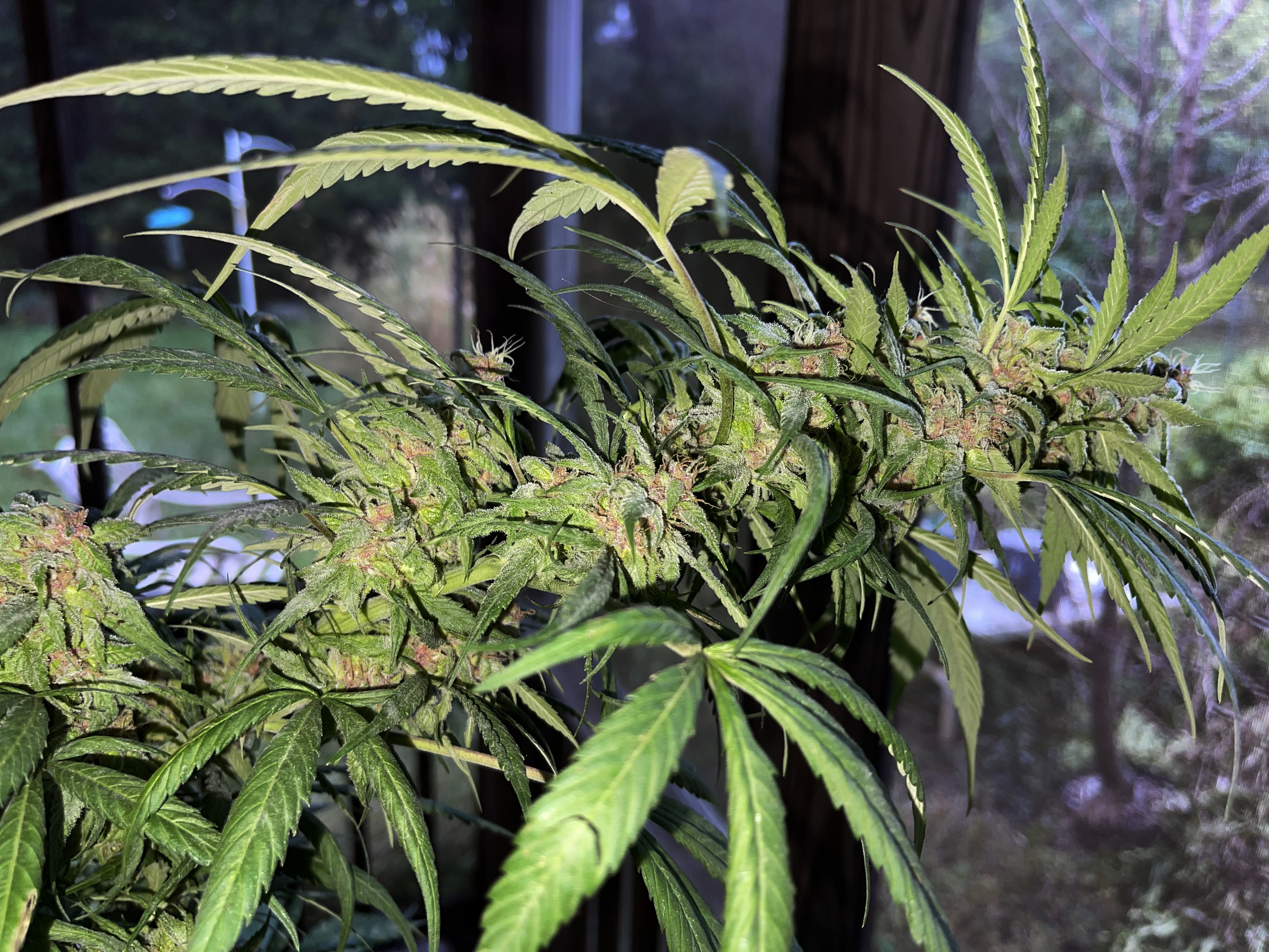 I brought 3 plants into an indoor grow room, and this 'Plumberry Kush' onto the patio so fans could blow on it constantly. She's not ready but it's close.