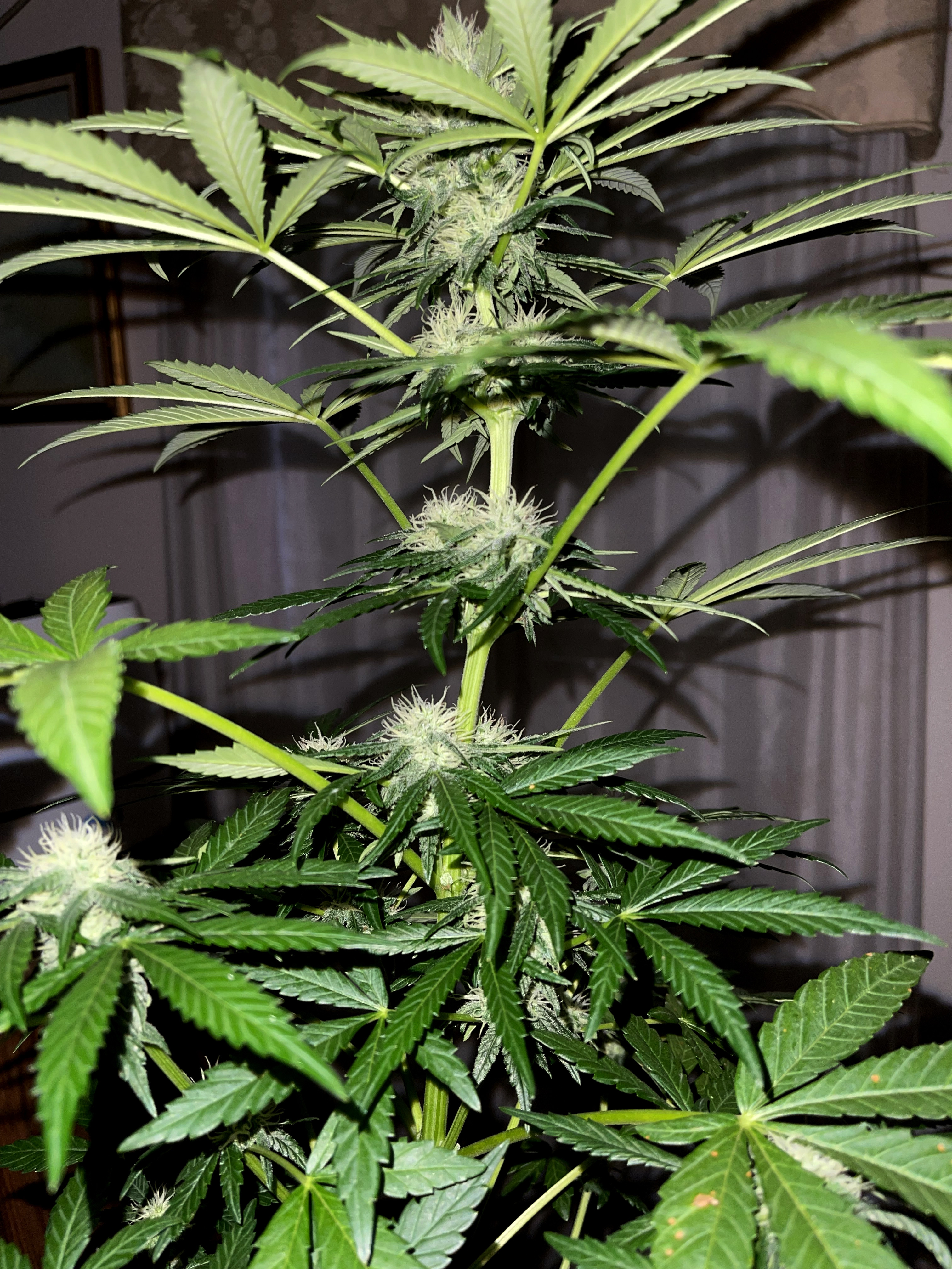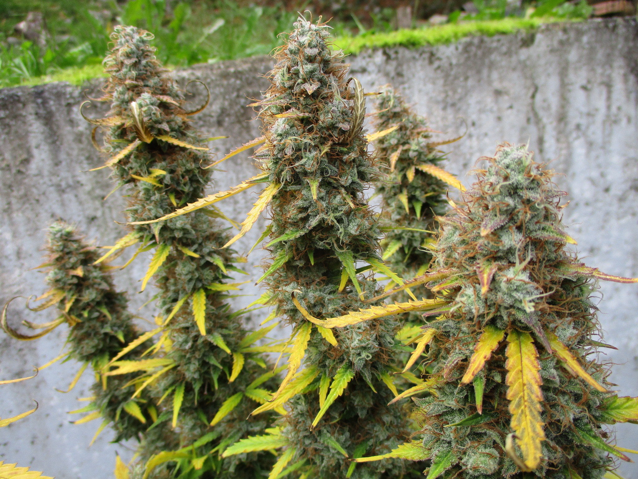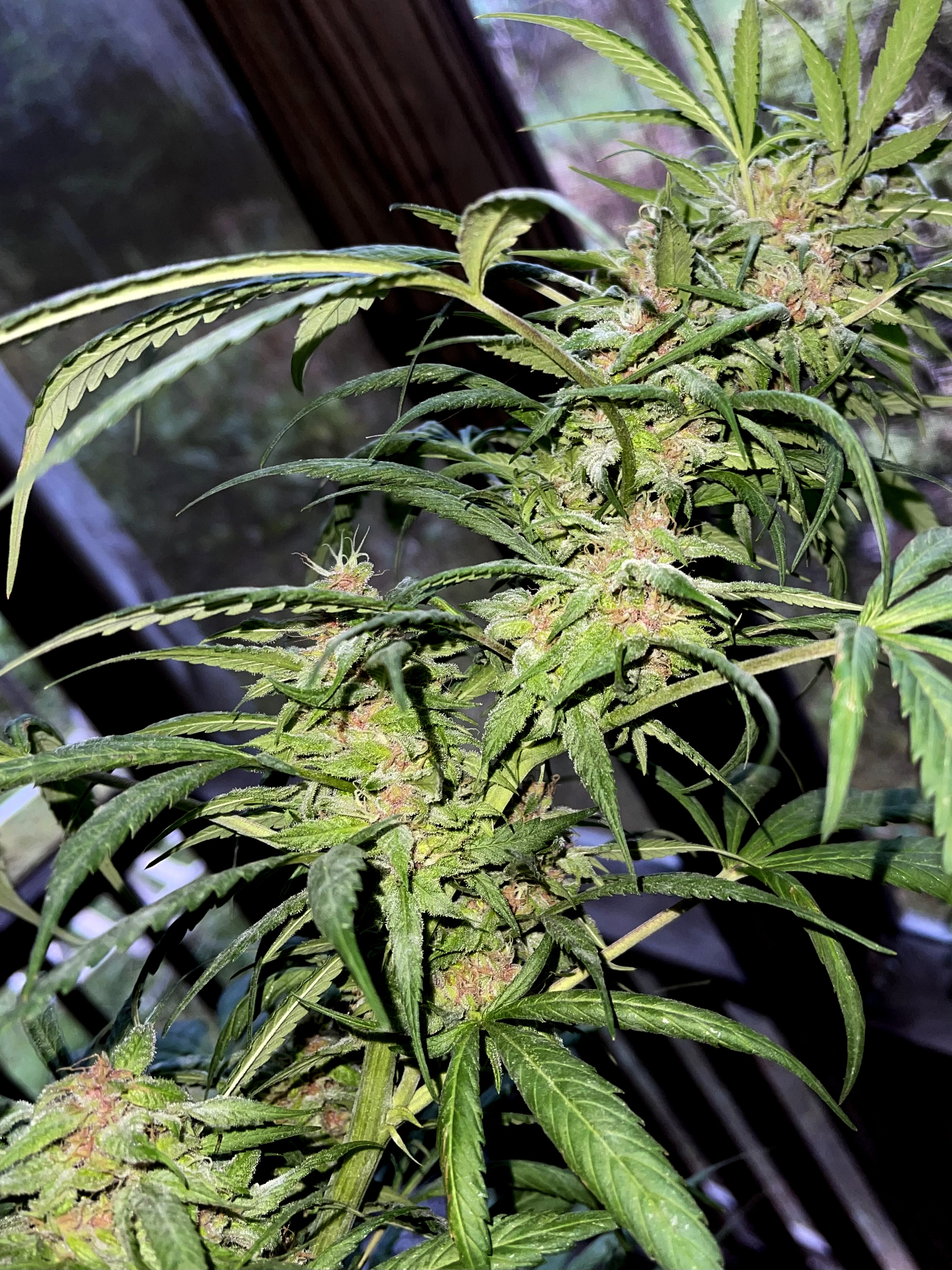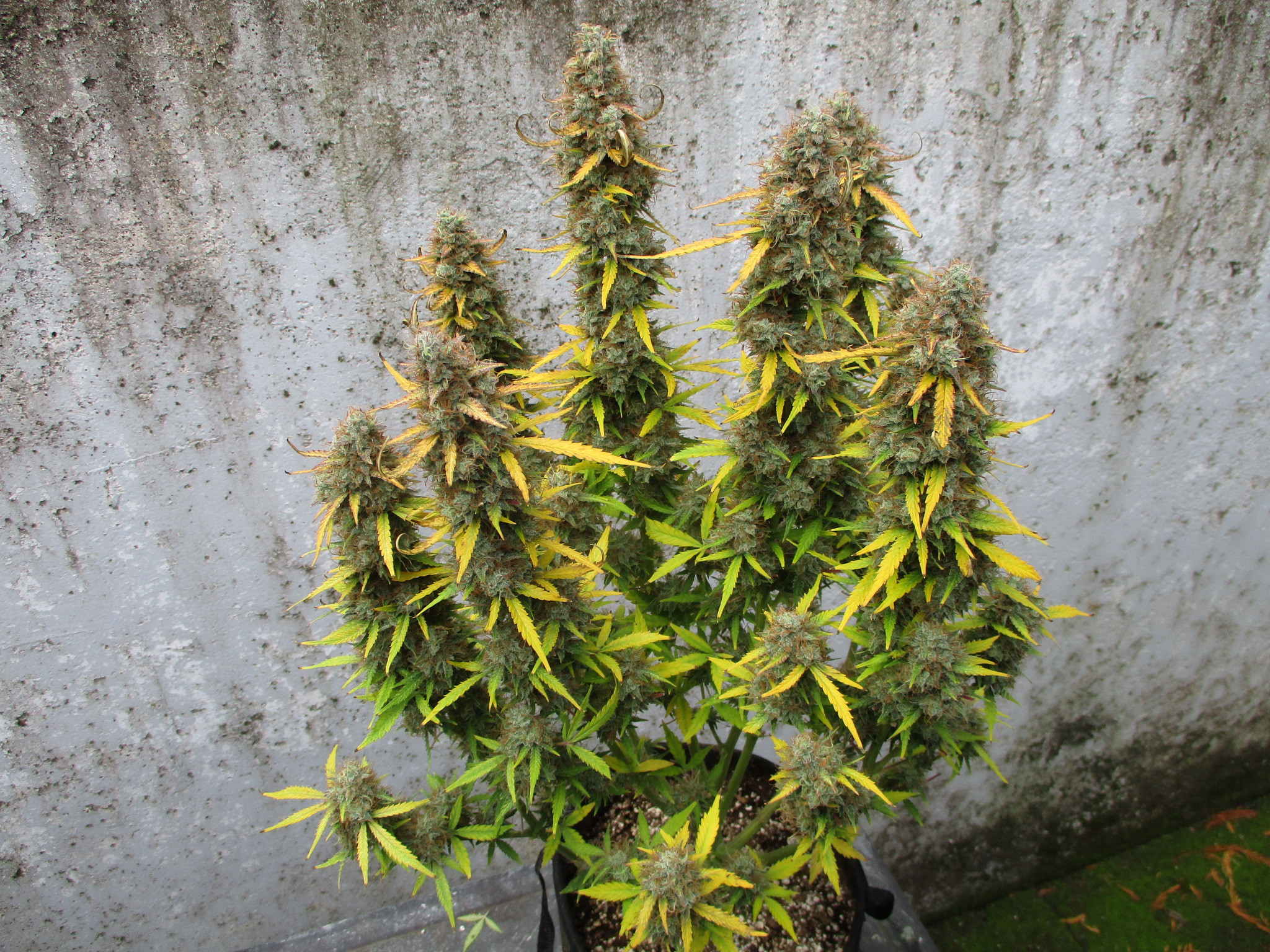 I brought 3 plants into an indoor grow room, and this 'Plumberry Kush' onto the patio so fans could blow on it constantly. She's not ready but it's close.