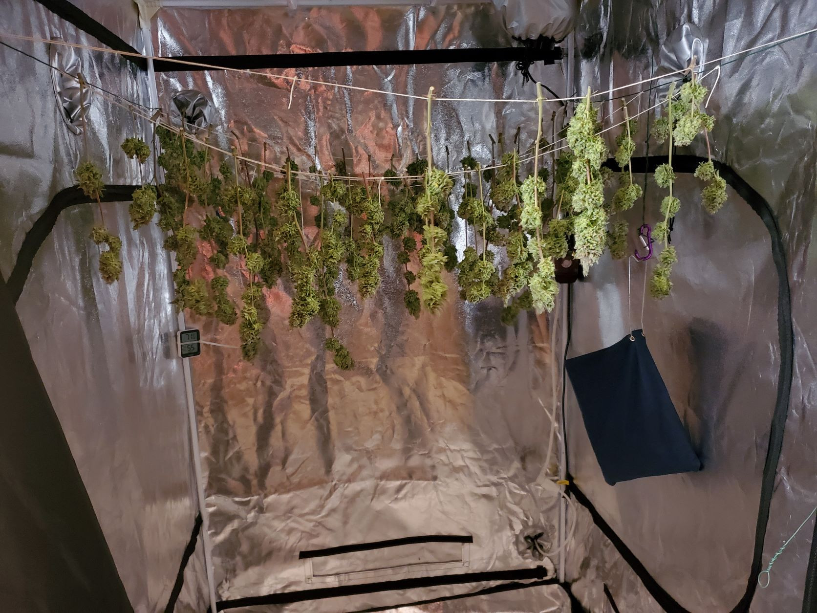 Well not much to show so far this is just 1/2 of the peanut butter breath photo from outdoors. I hang them in a bedroom the stings are 6ft long and so far she's taken up 3 rows. Got some little ones drying on a screen an in a brown paper sack.
