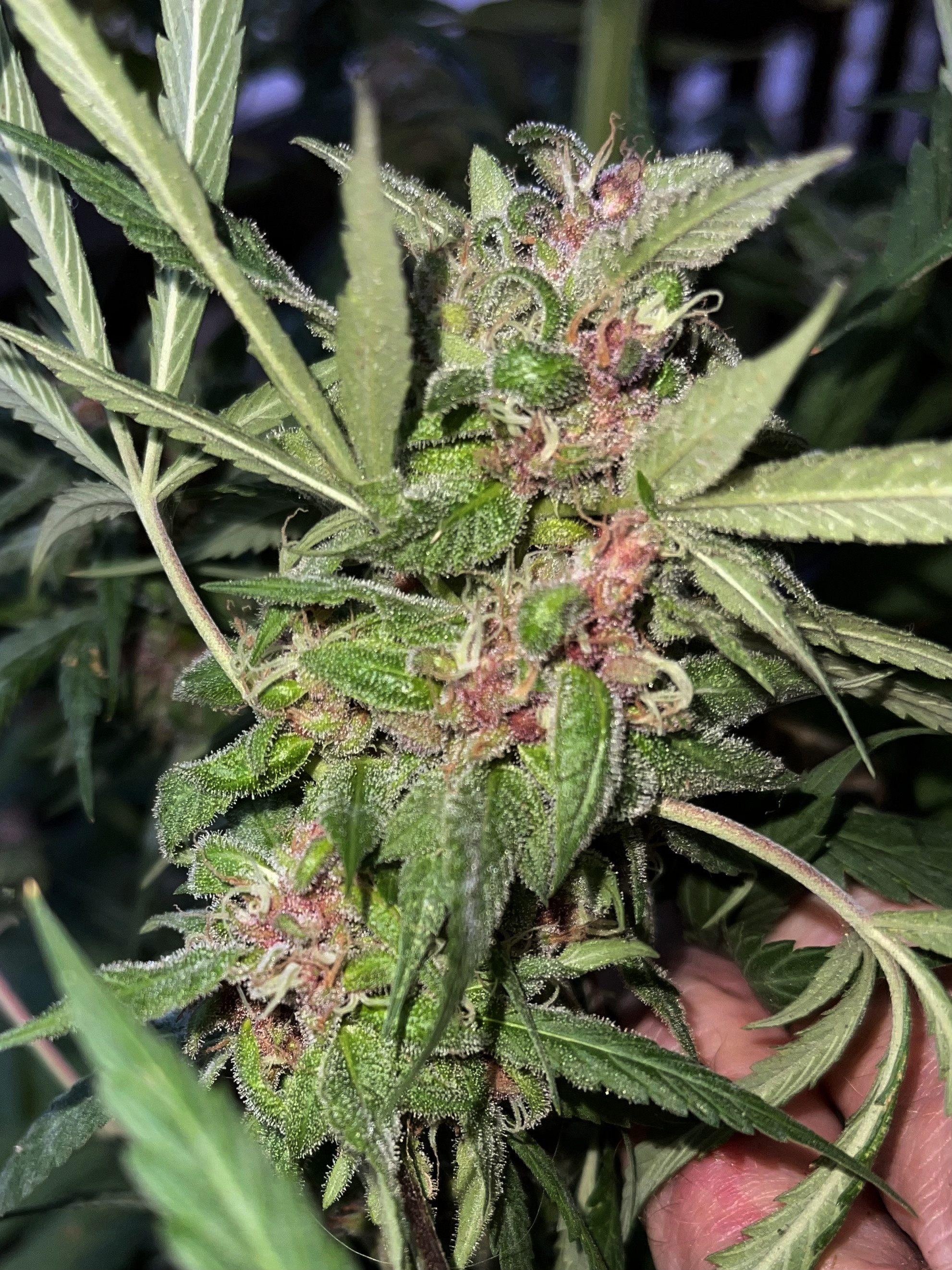 Like desertdan he too had been hit hard by bud worms. This one just attracted them more than any of the others. Now they maybe there in the others but i've not seen the damage like this strain had. I wet trim the plant and break it into sections. It's just more time consumming, i forget how sore my shoulders get and my eyes get blurry so only can do 1/2 a day. My others are gonna go the distance they'll be taken indoors in a screened patio just to become dryed in the pots. I'm pre trim/defoliating 2 more today.