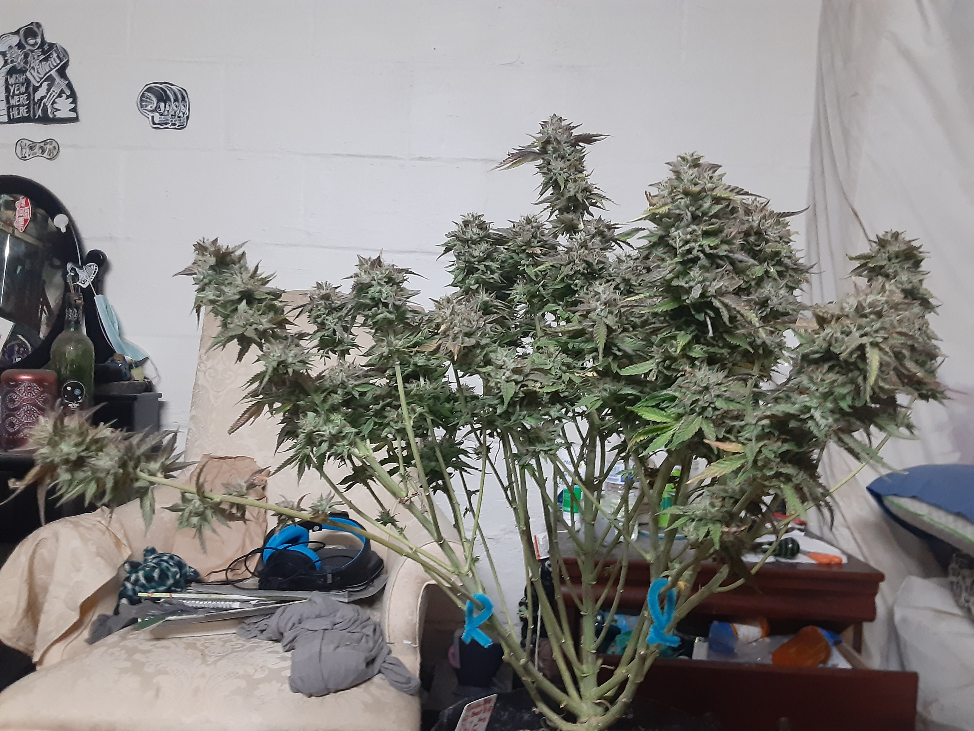 My awkward 4th grow,Sure didnt go as planed. Dont even know why the tiny one is still in there. I did take 4 clones from the right two thats still alive. 3 from the other two.