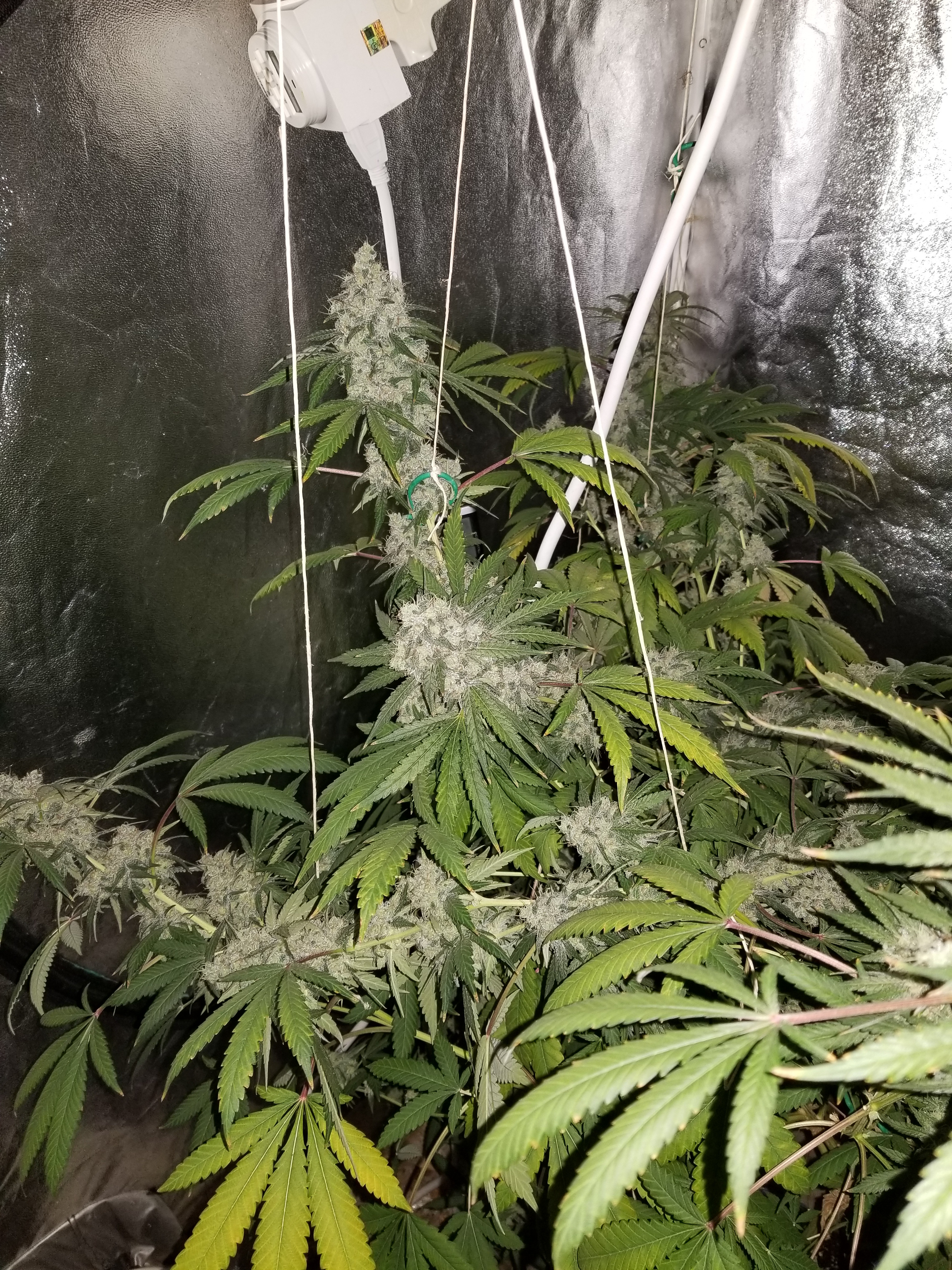 Week 6 of Veg, probably flip 12/12 this weekend. Keeping a pretty tight LST on the girls so i have no height issues down the road. I've been waiting on the stumpy little strawberry banana to spread her wings and stretch out....nope, shes doing her own thing and i 'm not waiting any longer. I did HEAVY a pre flip defol 2 nights ago(big fans and any sucker stems) so they could rebound before light change. They really didnt like that...LOL! Two days later, canopy is still good and their prepped and ready for flower.