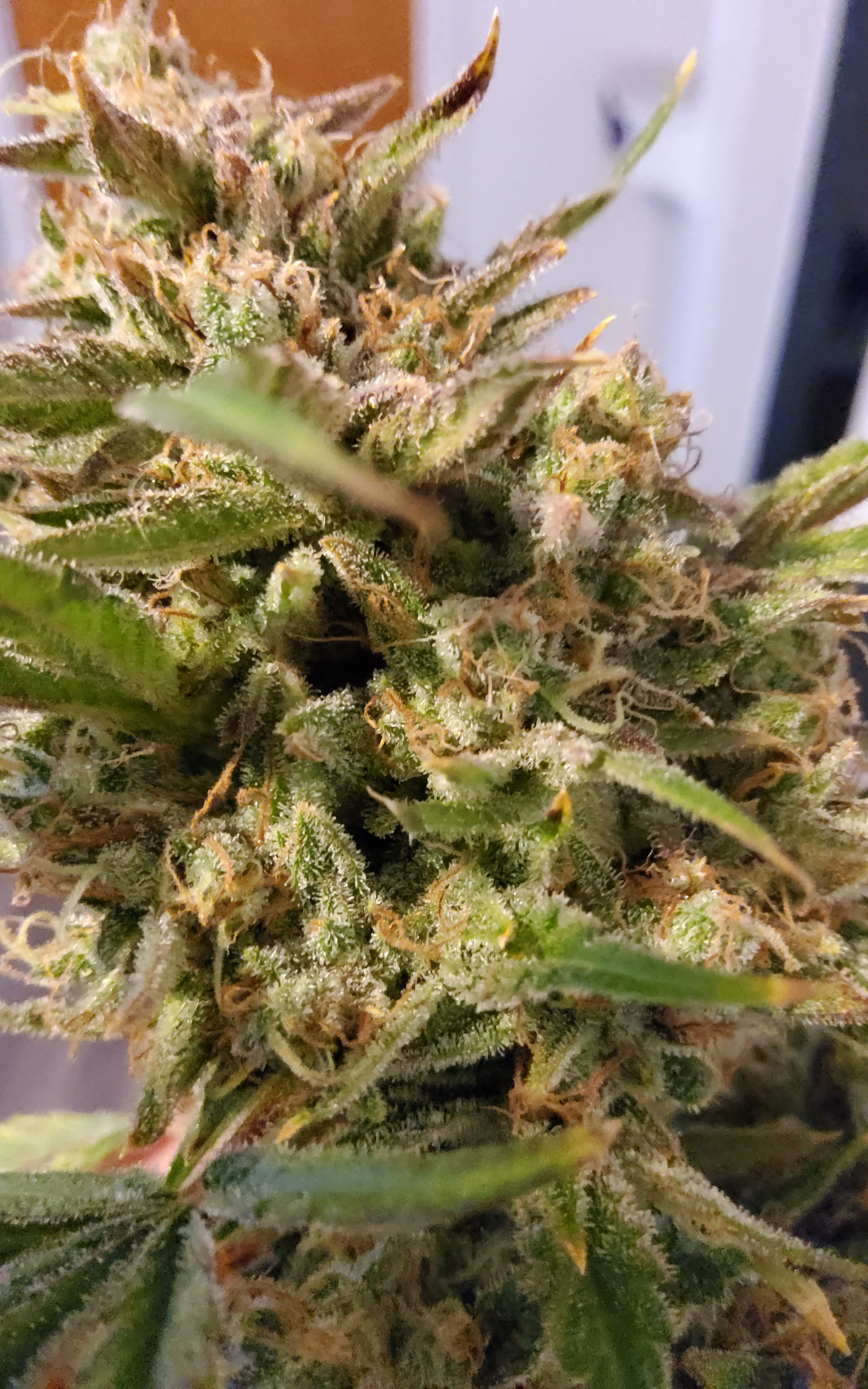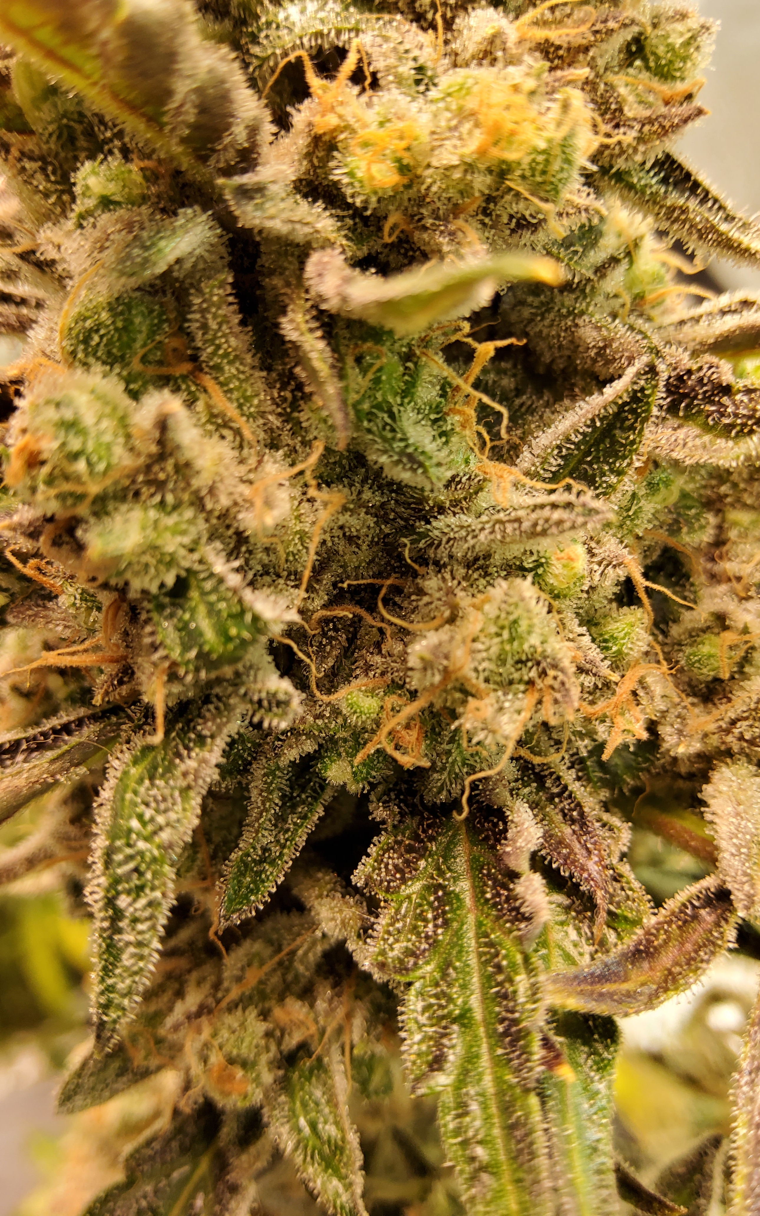 My sole surviver Blue Dreams about 4-5 weeks into bloom. Pretty proud of her. Starting to get some lovely blue leaves and everything is incredibly frosty. You touch a bud and it wants to stick to your finger. Plenty of new flower growth i just noticed today. In another 30 days she'll be as lovely as ever.