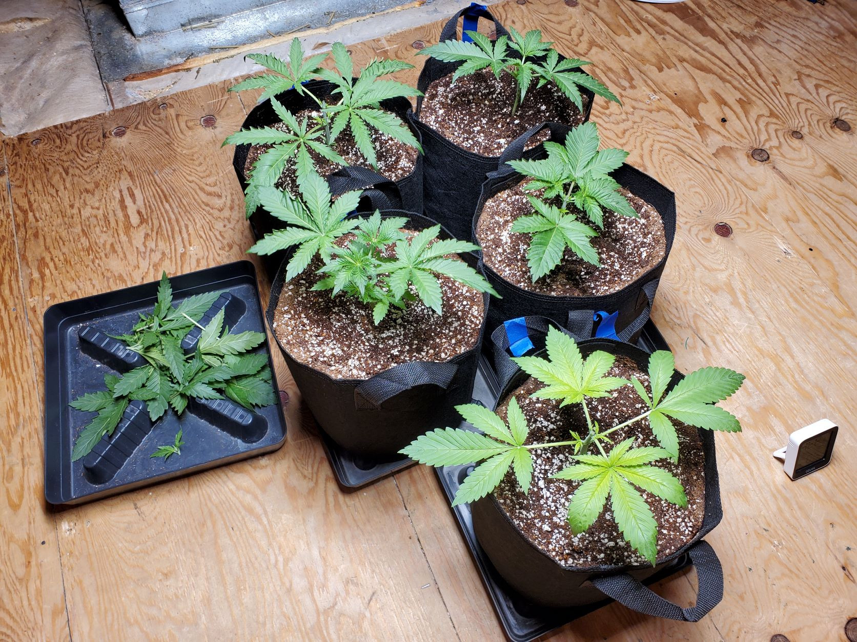 Hey BU2B, just an updated photo. Usual culprit is the one with snow on her face, and old fuddy duddy decided to come outside for a pic cause the weather was nice that day. lol. And she's not old..3yrs, just a princess that doesn't like to get her feet dirty. Weirdo! And Yes on the big fat leaves! Im tempted to trim some. Watering tonight so i'll try some more bondage and see if i can spread um. The clones in the tan colored bags are a indica dominant cross between Super Skunk and OG Kush. So the grow is still leaning on the indica side.
