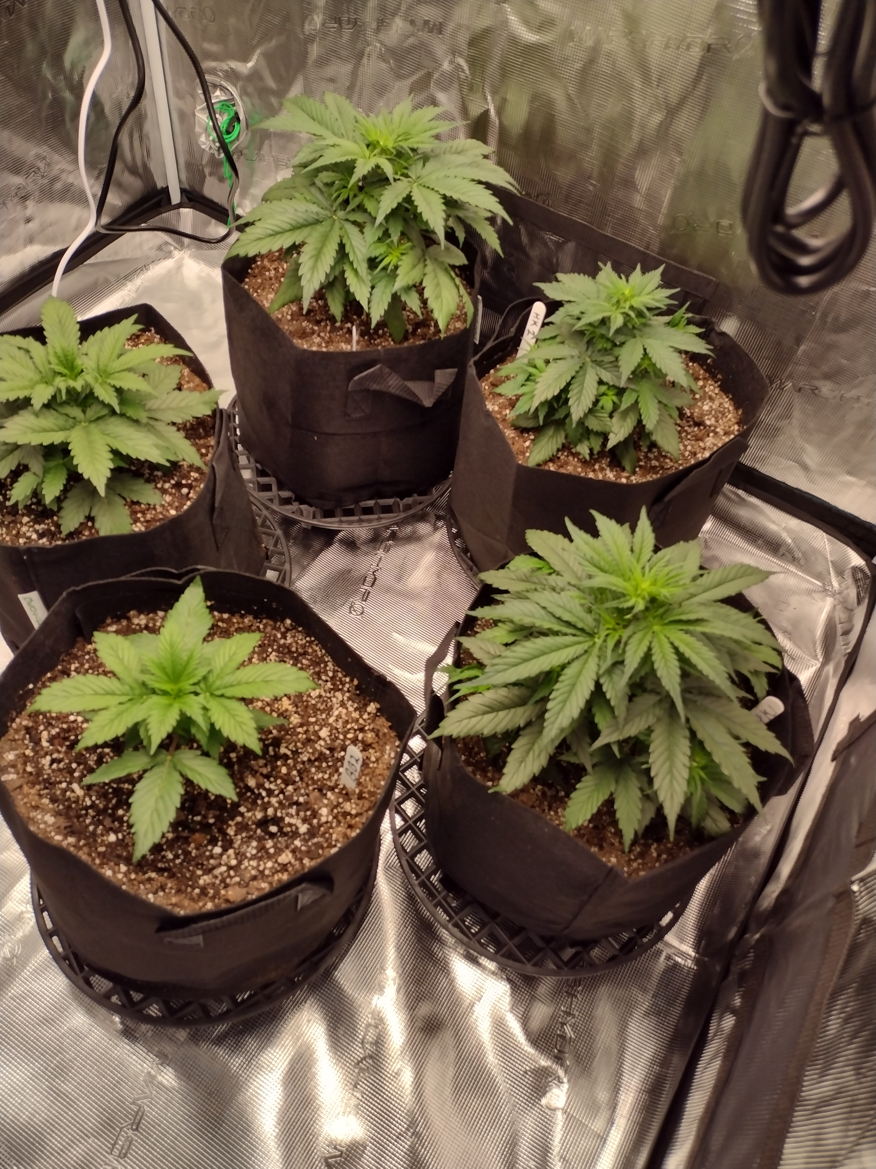 Little update on the latest grow.. 3 weeks in now from seedlings. Both are really stout and thick. So, i was out shoveling snow a couple of weeks ago,and my buddy down the street does a drive by on his way to the farm. The inside of his pick-up was full of clones..lol WTF! Hands me two babies and off he goes into the snowstorm. I just stood there kinda stunned for a few seconds with a few of the neighbours standing there watching!(he texted me and thought that was hilarious) so i hurried the Grandpas Stash girls into the house for the tent party. They were hungry for some nutes but came around after 2 feedings. Only doing LST. Everyone is tied down hard for the next week or so.4 PhotosShappel S3000 3.5x6x6' ice hut