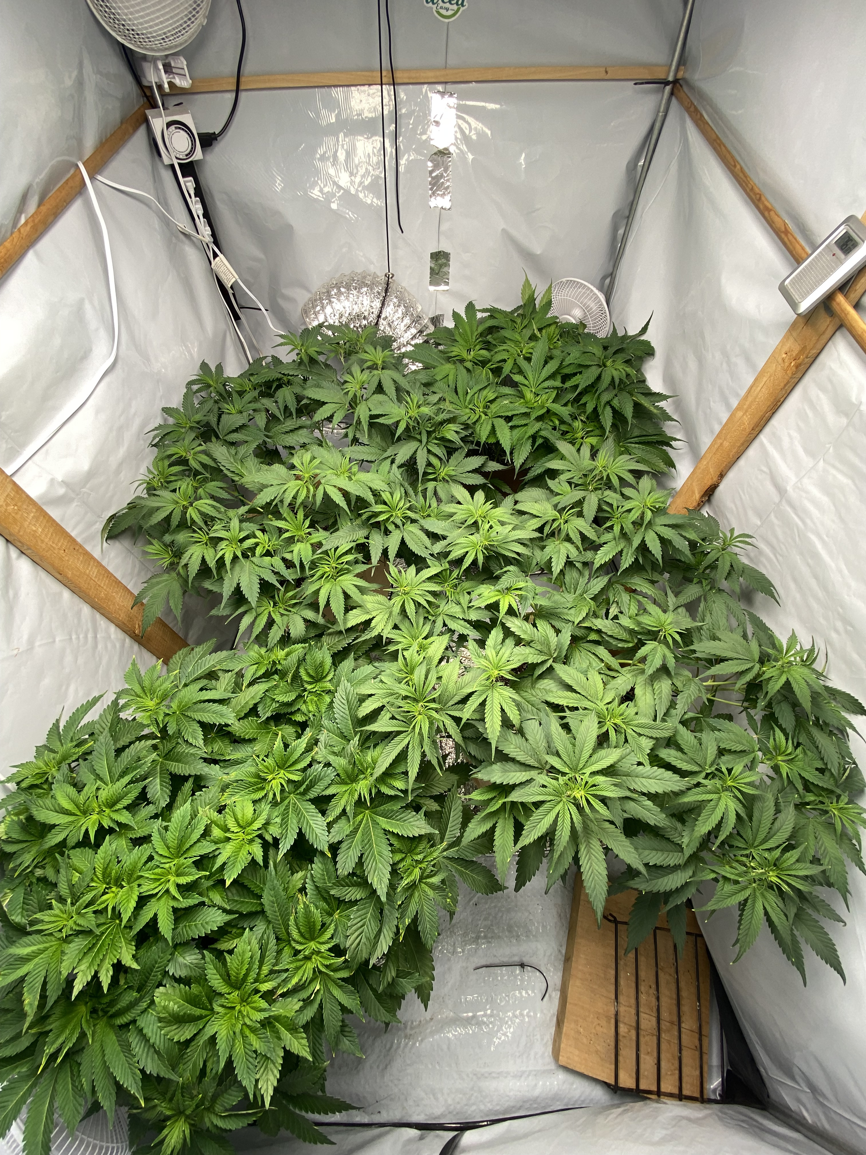 . Think i'll flip the ladies this weekend. The clones have been real easy to train and lst, but the plants grown from seed are stubborn as hell. Main stems put up a fight every day, and their much fuller and thicker than the clones. They have a nice flat canopy at the moment..one more trim before 12/12 and the stretch. Shappel S3000 3.5x6x6' ice hut