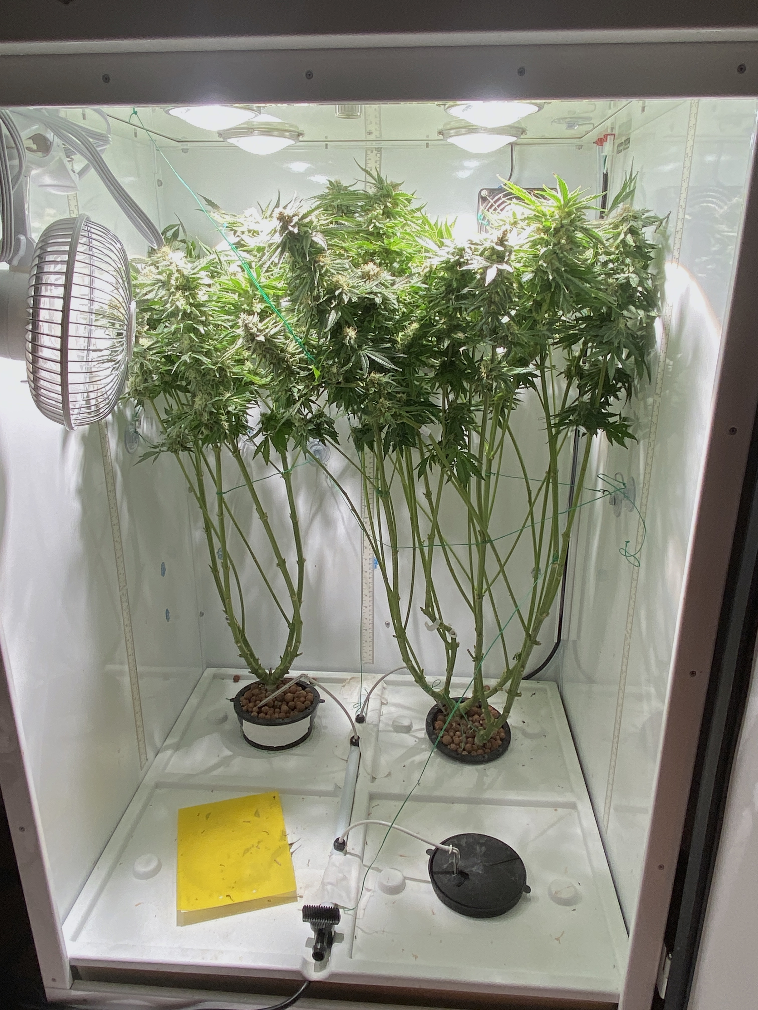 Mainlining a small sativa, it doesn't want to grow fast despite being dwc. I think that's because our newly installed water softener is throwing off my nutrient balance. Regardless it's almost in the desired shape, I had to install a cut-down tomato cage to the top of the bucket with some command clips to get it to even out.