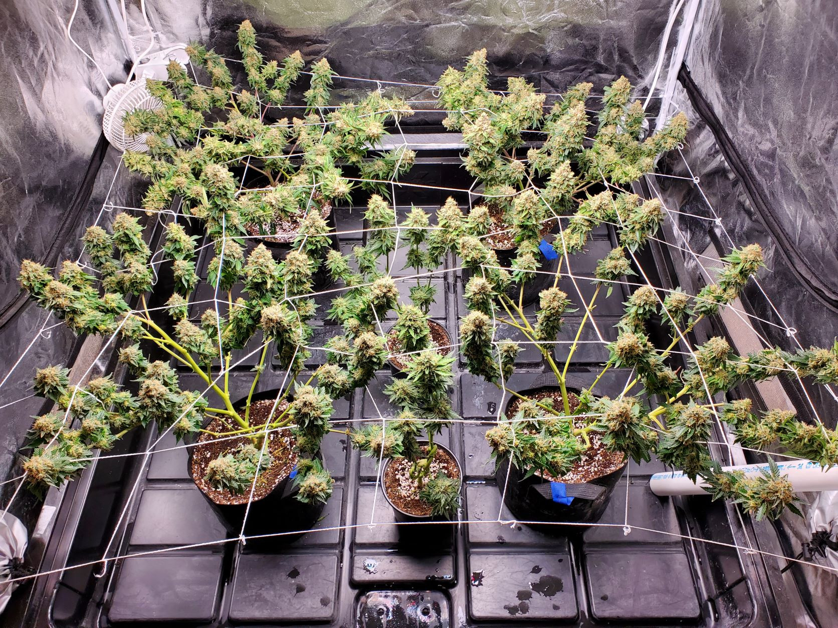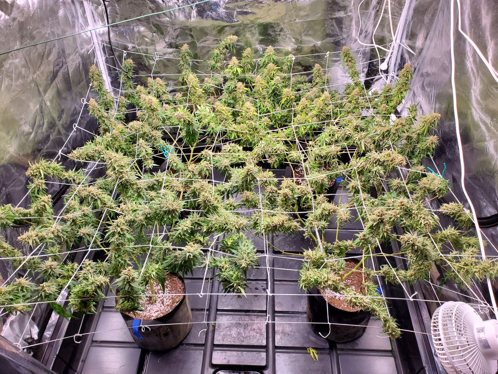 First scrog attempt, end of week 6 since flip. Out of tent pics taken a few days previous but show better angles