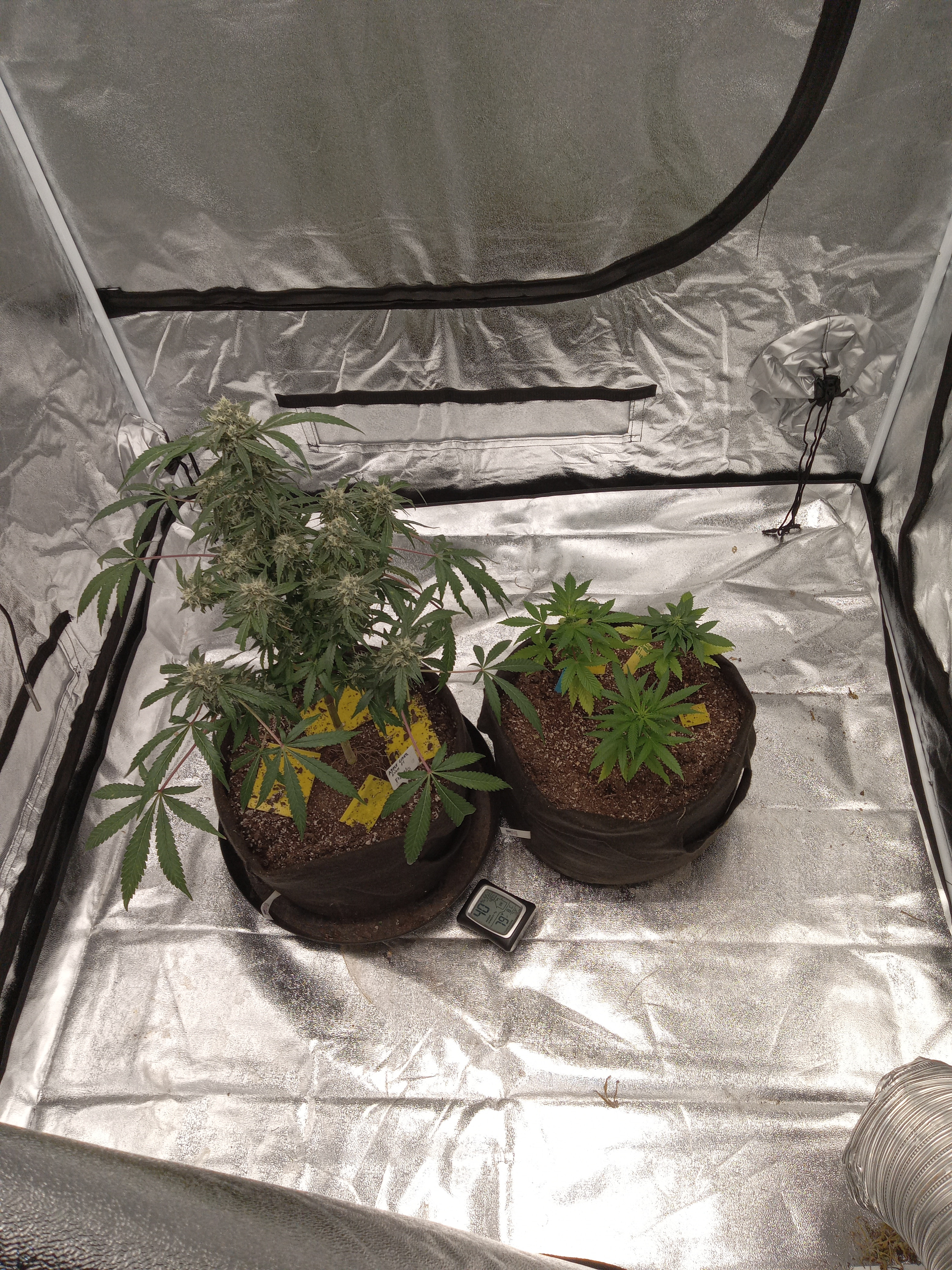 These two ladies vegged for a little too long while i was waiting on clone cuttings...i usually grow 4 plants in this tent lol. Mango Merengue is the monster. The other is White Widow. Right around 5 weeks in flower, in need of a defol very soon. Mango is still growing upward.. already too close to the lights,haven't super copped yet, just bending branches. Happy growing!