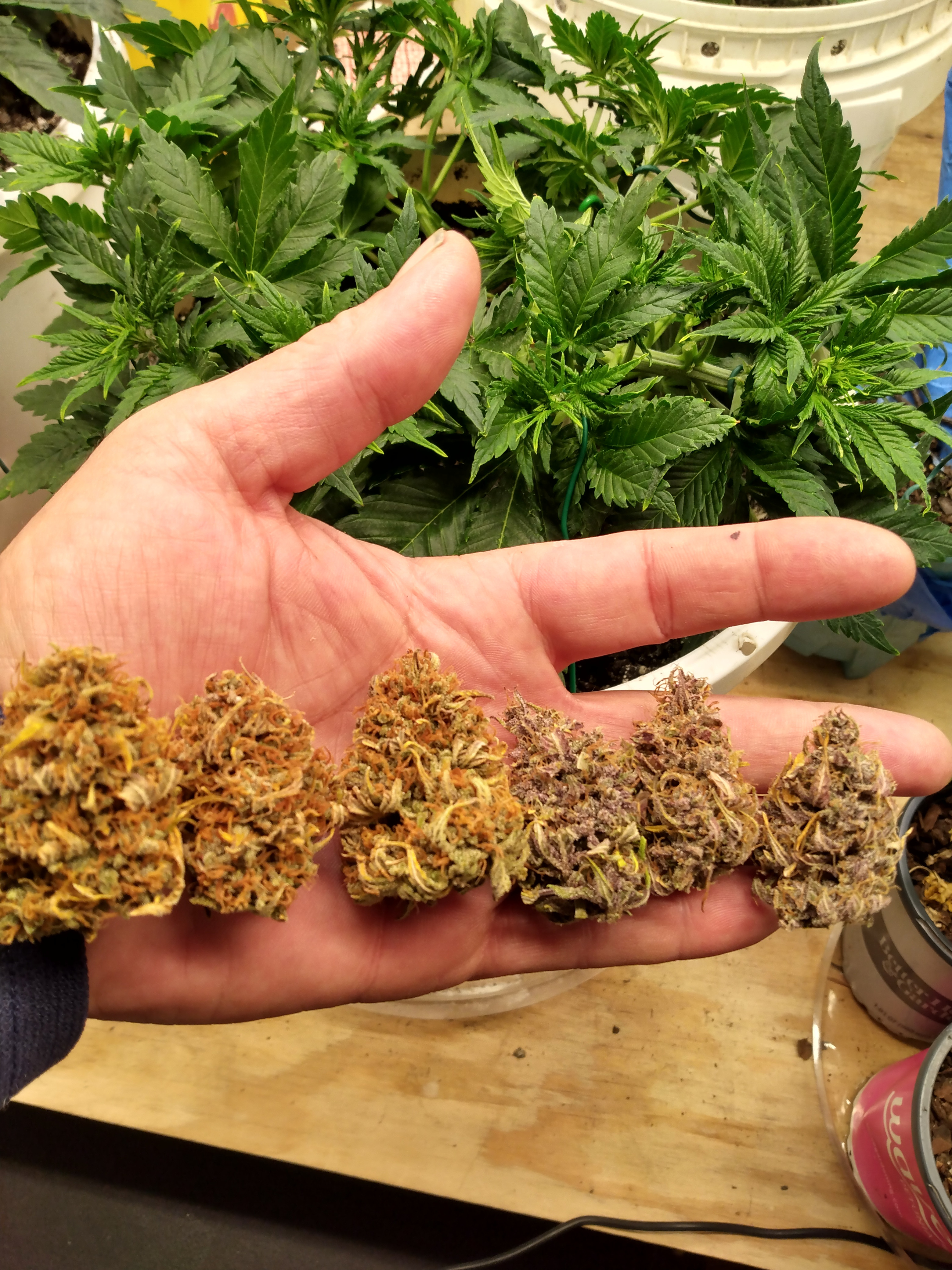 This was my first attempt at an outdoor grow, gorilla glue #2, just over 6 ft tall grown in 5 gal mesh pot with strawberry hills soil. Just over 30 oz each plant! Click image for larger version