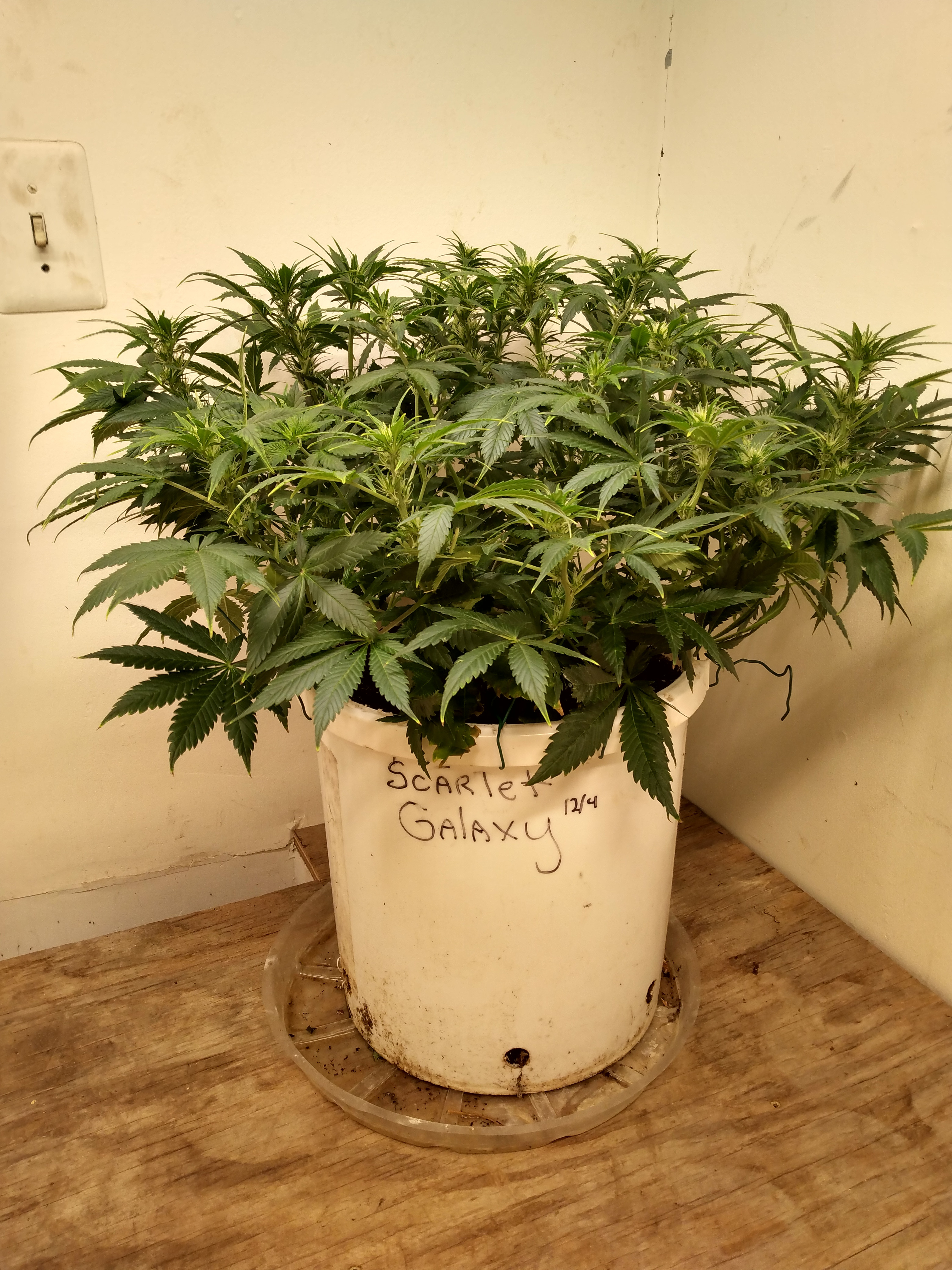 Flower Room: 11' x 7' x 7.5'H, 480w AC, 13gal/day dehumidifier, 1.5gal ultrasonic humidifier, 60gal (27gal usable) nute tank, 16" pedestal fan & 18" wall fan. Lighting and climate automated. Hand watering.