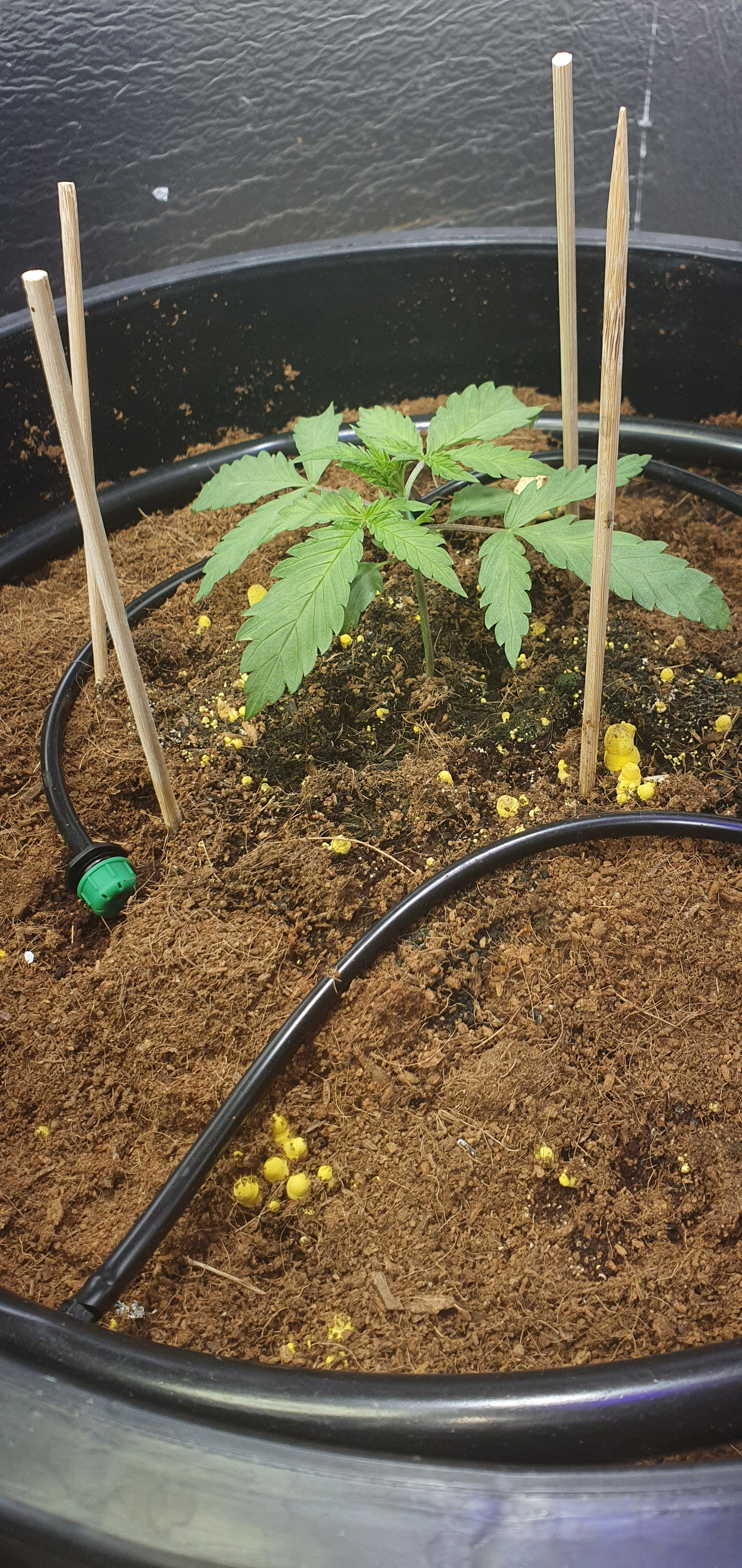 Seven pots, at least 3 different strains inc a random seed sprouting, must have planted last crop and it remained dormant, survived tilling and washing the used coco, in the pot with twins, both only just surviving, the other 6 doing well and 10 times their size.