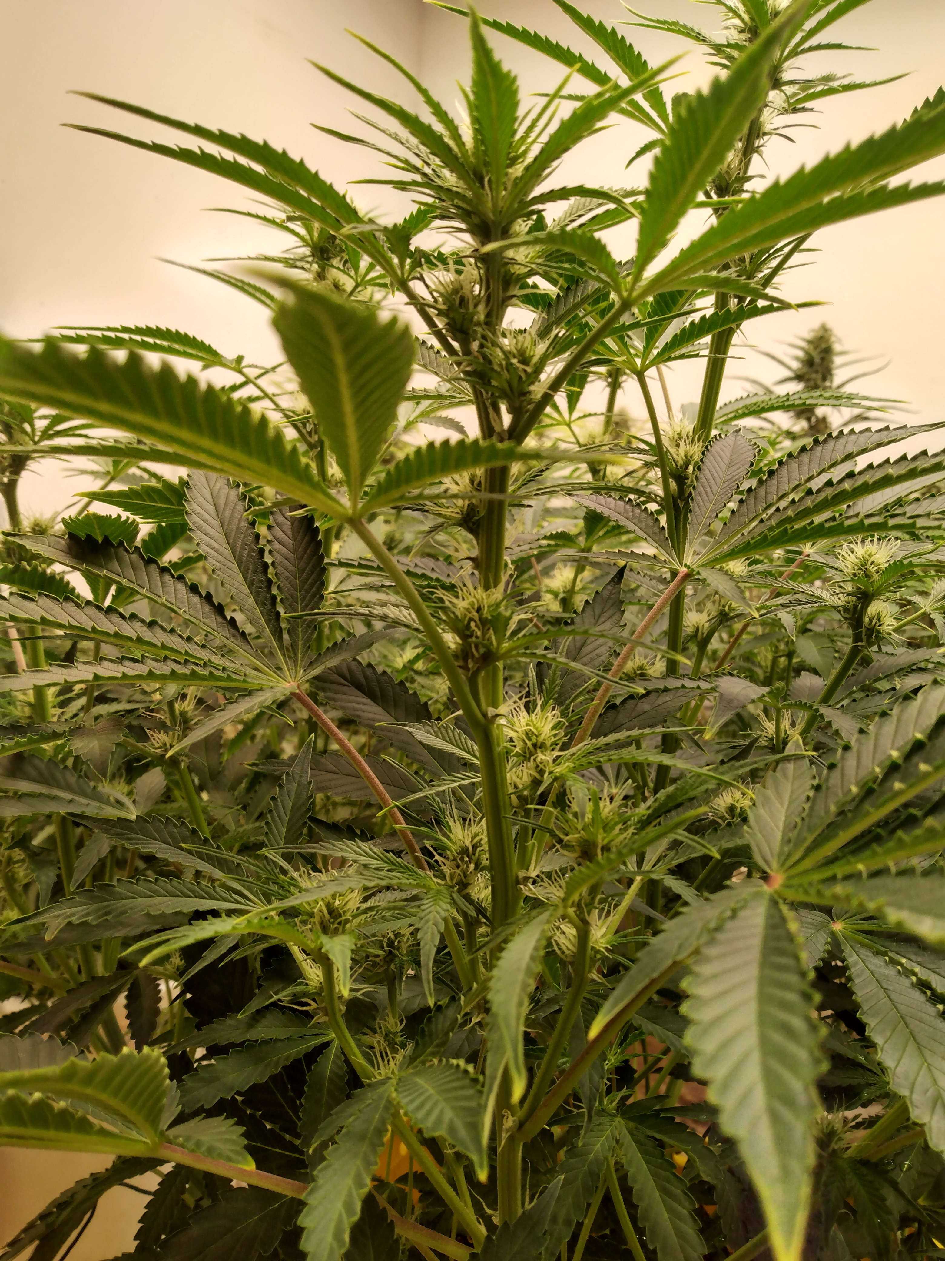 Here's my all auto winter grow. L to R is Blue Dream, Jack Herer, and Granddaddy Purple. All are being grown in 5 gal. smart pots, ProMix HP, Botanicare Cal/Mag/Grow/Bloom. Jack Herer has 2 plants in her pot. The larger one was the first sprout and in the beginning she looked very odd and stunted, so I started a second as a back up. The 2nd plant grew and started flower very quickly. The 1st plant was very slow to flower, but it's now super bushy and still a long ways from being done. In hind sight, I'm not sure which one (if either) I should have culled. Blue Dream grew the fastest, flowered the fastest and is at most a couple weeks from chopping. GDP was also pretty slow to really start flowering and is also super bushy and maybe a month out. I think it will work better for trimming having them staggered. Autos are kind of unpredictable. All these plants are about 60 days above ground.6 Photos