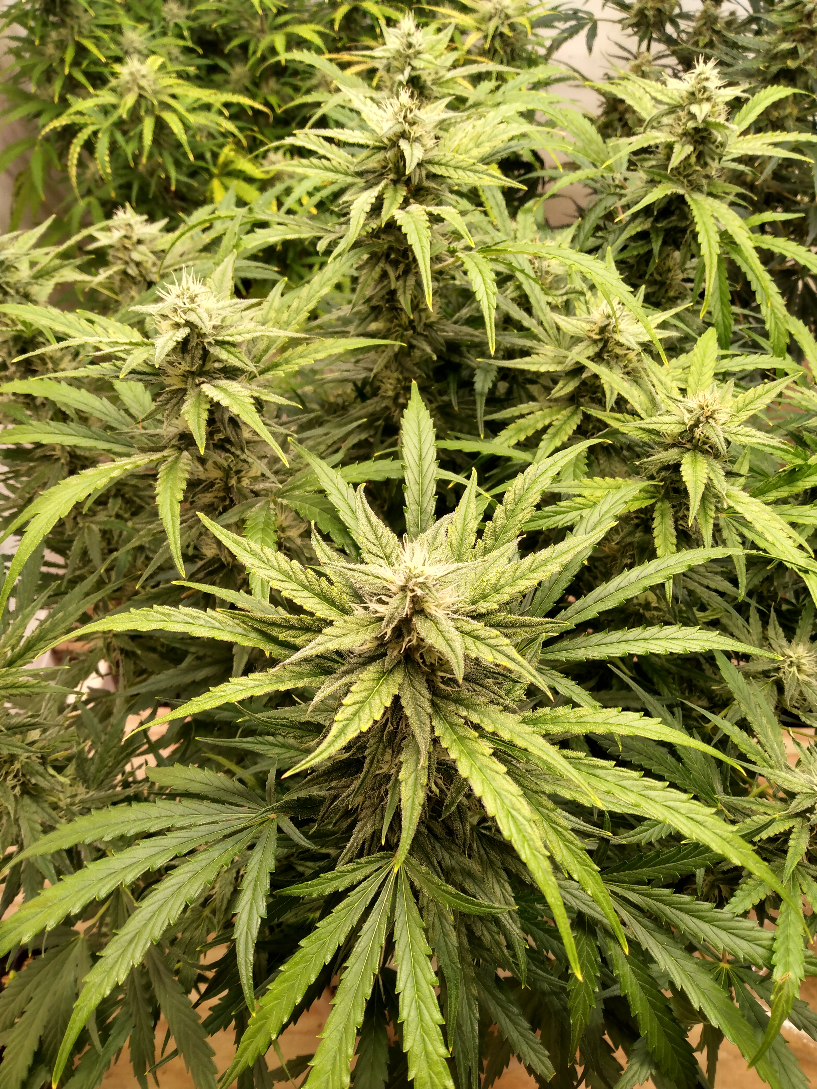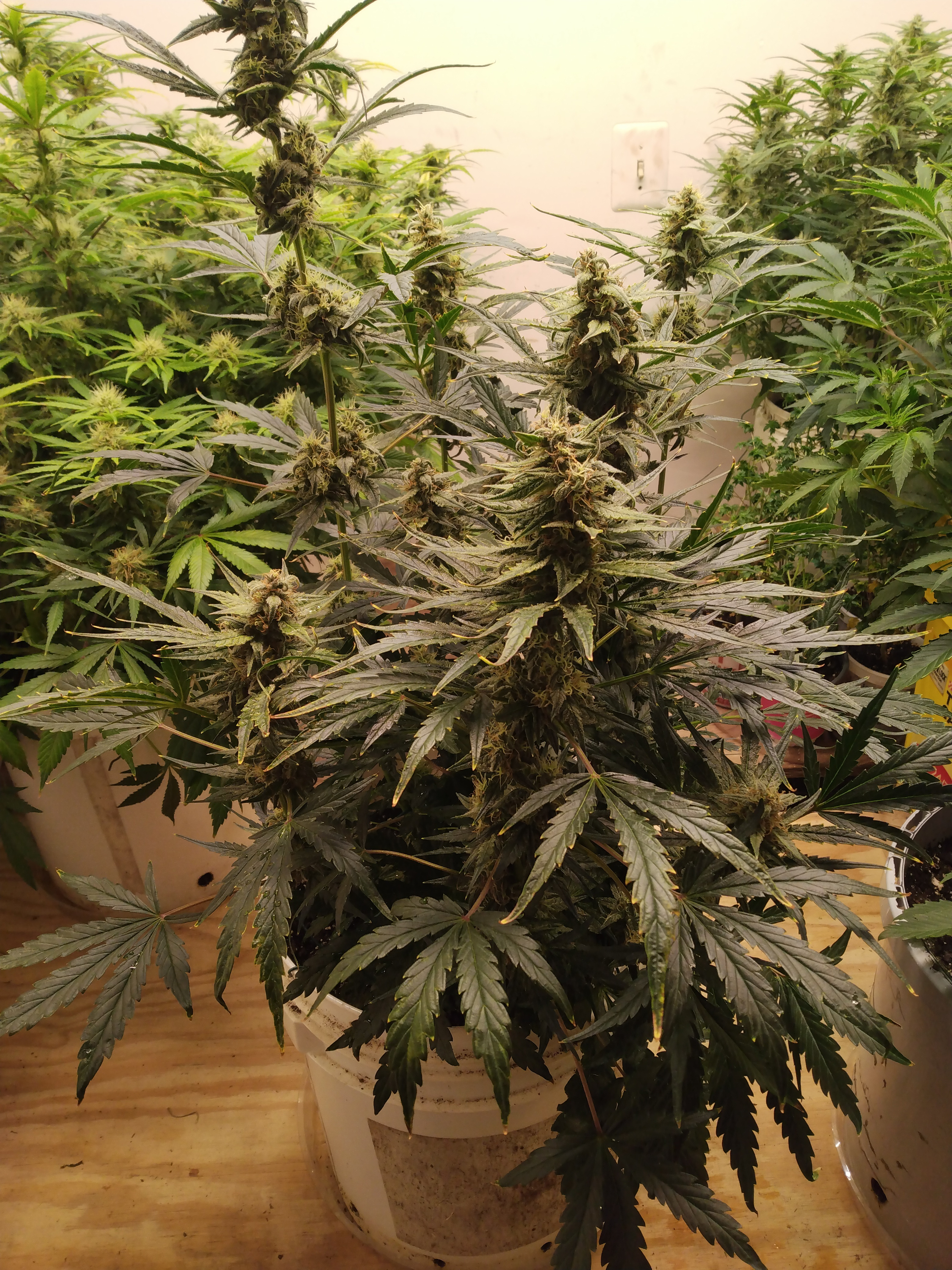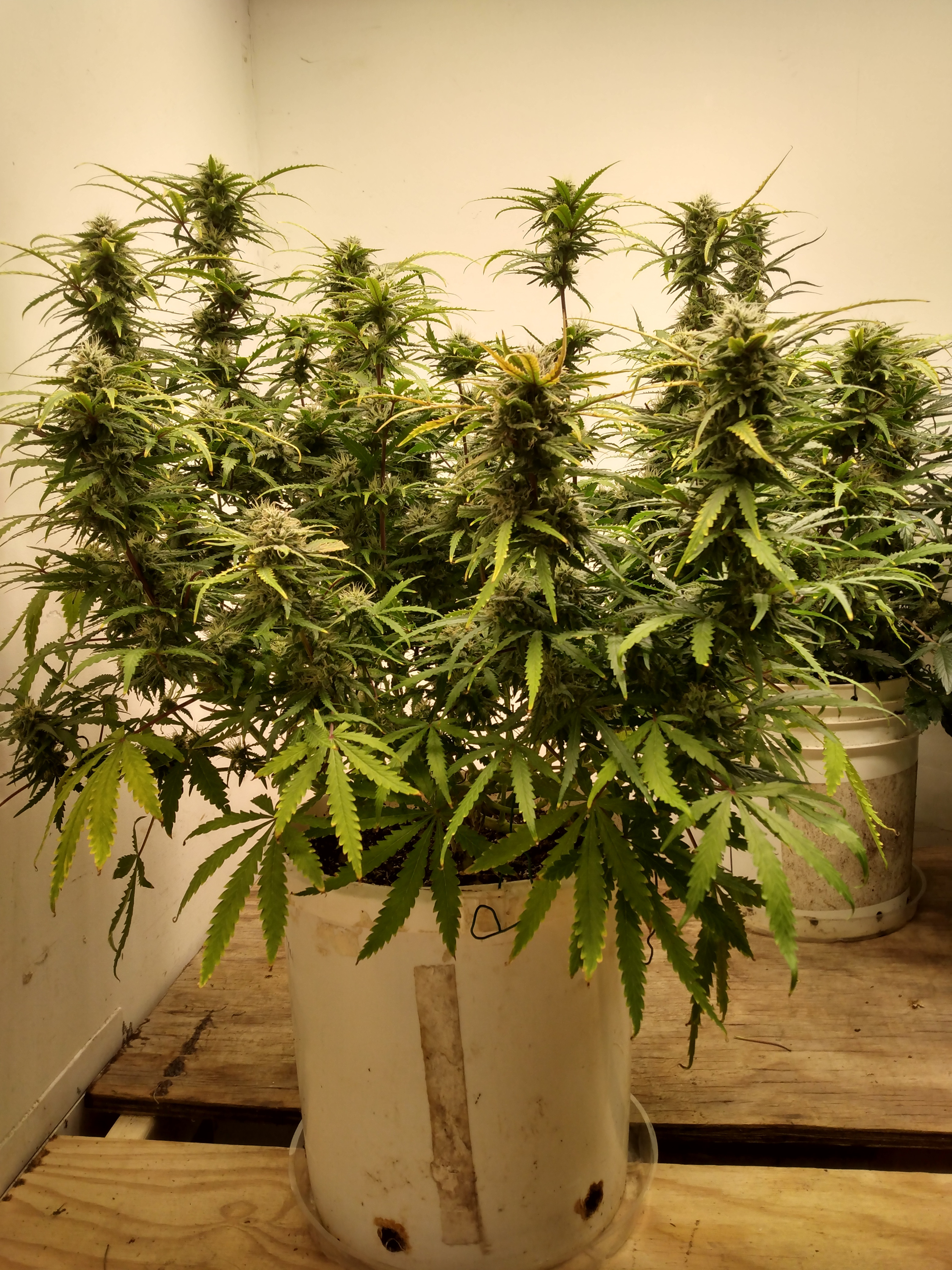 Here's my all auto winter grow. L to R is Blue Dream, Jack Herer, and Granddaddy Purple. All are being grown in 5 gal. smart pots, ProMix HP, Botanicare Cal/Mag/Grow/Bloom. Jack Herer has 2 plants in her pot. The larger one was the first sprout and in the beginning she looked very odd and stunted, so I started a second as a back up. The 2nd plant grew and started flower very quickly. The 1st plant was very slow to flower, but it's now super bushy and still a long ways from being done. In hind sight, I'm not sure which one (if either) I should have culled. Blue Dream grew the fastest, flowered the fastest and is at most a couple weeks from chopping. GDP was also pretty slow to really start flowering and is also super bushy and maybe a month out. I think it will work better for trimming having them staggered. Autos are kind of unpredictable. All these plants are about 60 days above ground.6 Photos