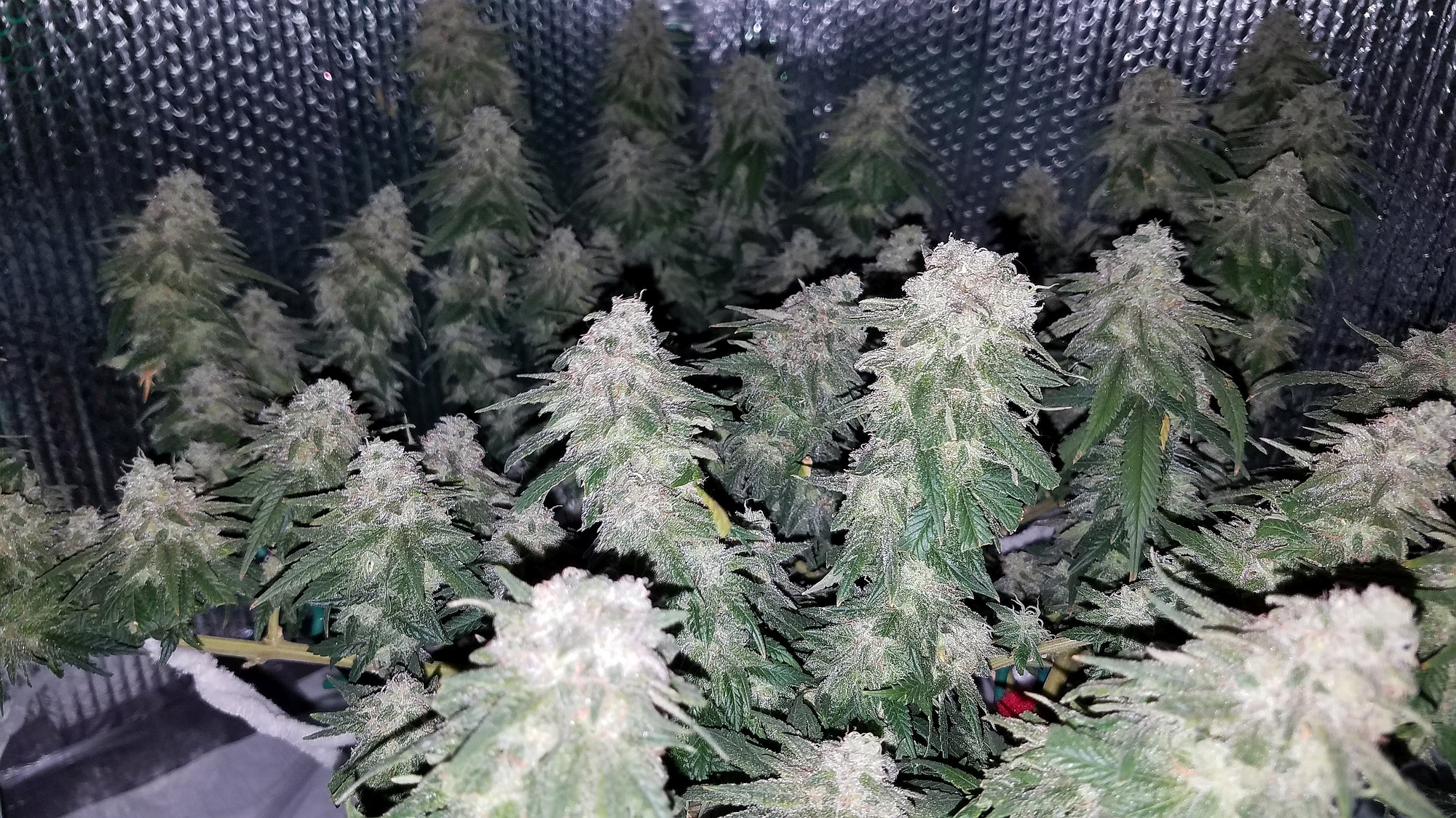 Here's my all auto winter grow. L to R is Blue Dream, Jack Herer, and Granddaddy Purple. All are being grown in 5 gal. smart pots, ProMix HP, Botanicare Cal/Mag/Grow/Bloom. Jack Herer has 2 plants in her pot. The larger one was the first sprout and in the beginning she looked very odd and stunted, so I started a second as a back up. The 2nd plant grew and started flower very quickly. The 1st plant was very slow to flower, but it's now super bushy and still a long ways from being done. In hind sight, I'm not sure which one (if either) I should have culled. Blue Dream grew the fastest, flowered the fastest and is at most a couple weeks from chopping. GDP was also pretty slow to really start flowering and is also super bushy and maybe a month out. I think it will work better for trimming having them staggered. Autos are kind of unpredictable. All these plants are about 60 days above ground.6 Photos