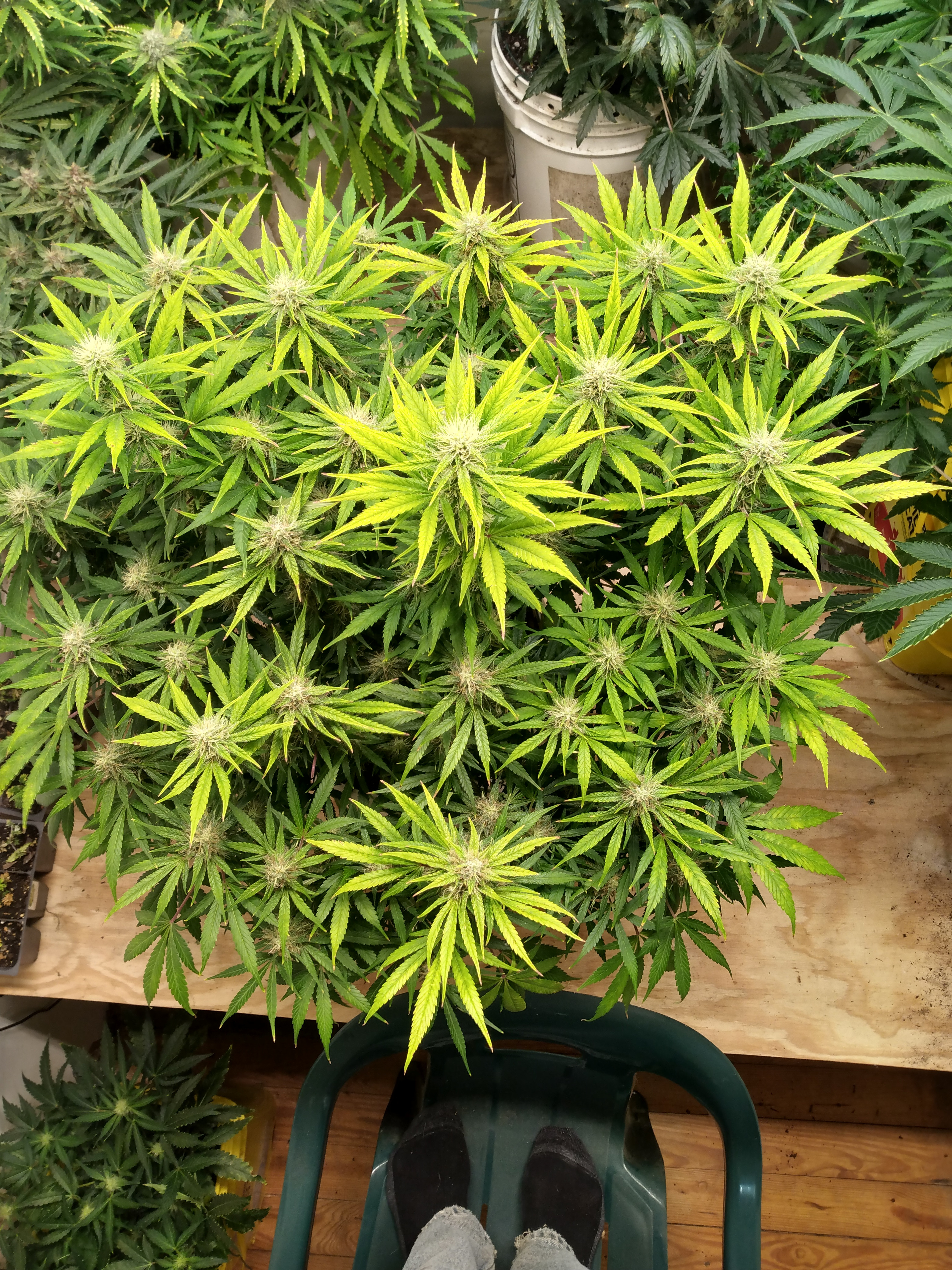 Here's my all auto winter grow. L to R is Blue Dream, Jack Herer, and Granddaddy Purple. All are being grown in 5 gal. smart pots, ProMix HP, Botanicare Cal/Mag/Grow/Bloom. Jack Herer has 2 plants in her pot. The larger one was the first sprout and in the beginning she looked very odd and stunted, so I started a second as a back up. The 2nd plant grew and started flower very quickly. The 1st plant was very slow to flower, but it's now super bushy and still a long ways from being done. In hind sight, I'm not sure which one (if either) I should have culled. Blue Dream grew the fastest, flowered the fastest and is at most a couple weeks from chopping. GDP was also pretty slow to really start flowering and is also super bushy and maybe a month out. I think it will work better for trimming having them staggered. Autos are kind of unpredictable. All these plants are about 60 days above ground.