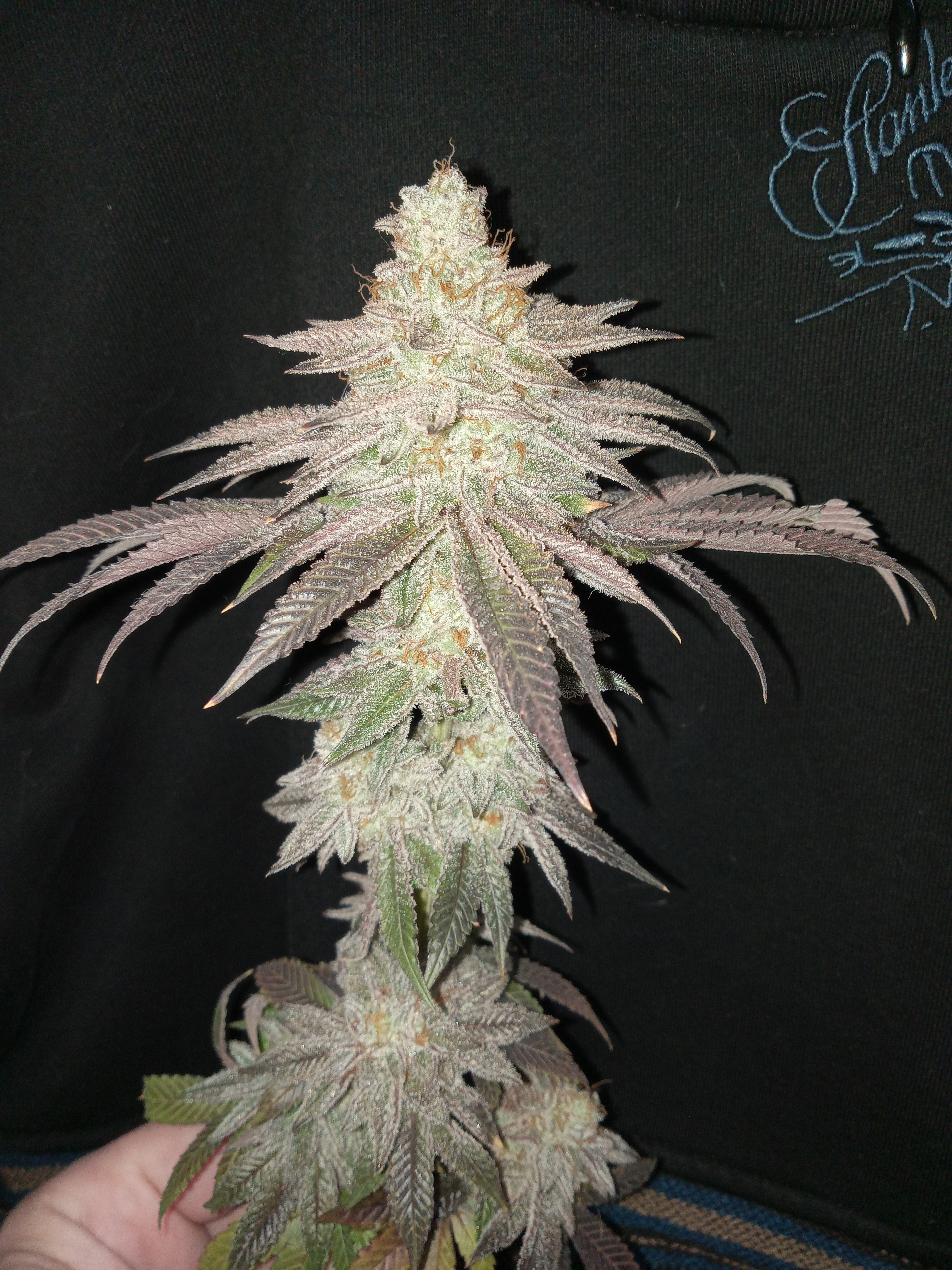 At one point I dosed the Plant a little heavy so nute burn didn't help the overall grow but hey! Them autos lived on a veg table for 81 and 86 days in 2 gallon pots grown under a 420w light dimmed down to 210 watts so not bad for a sideshow. 69 grams off the first plant and I expect about the same from the other, probably would have let them go another week but i need the space. The best thing about real purple weed is real purple keif
