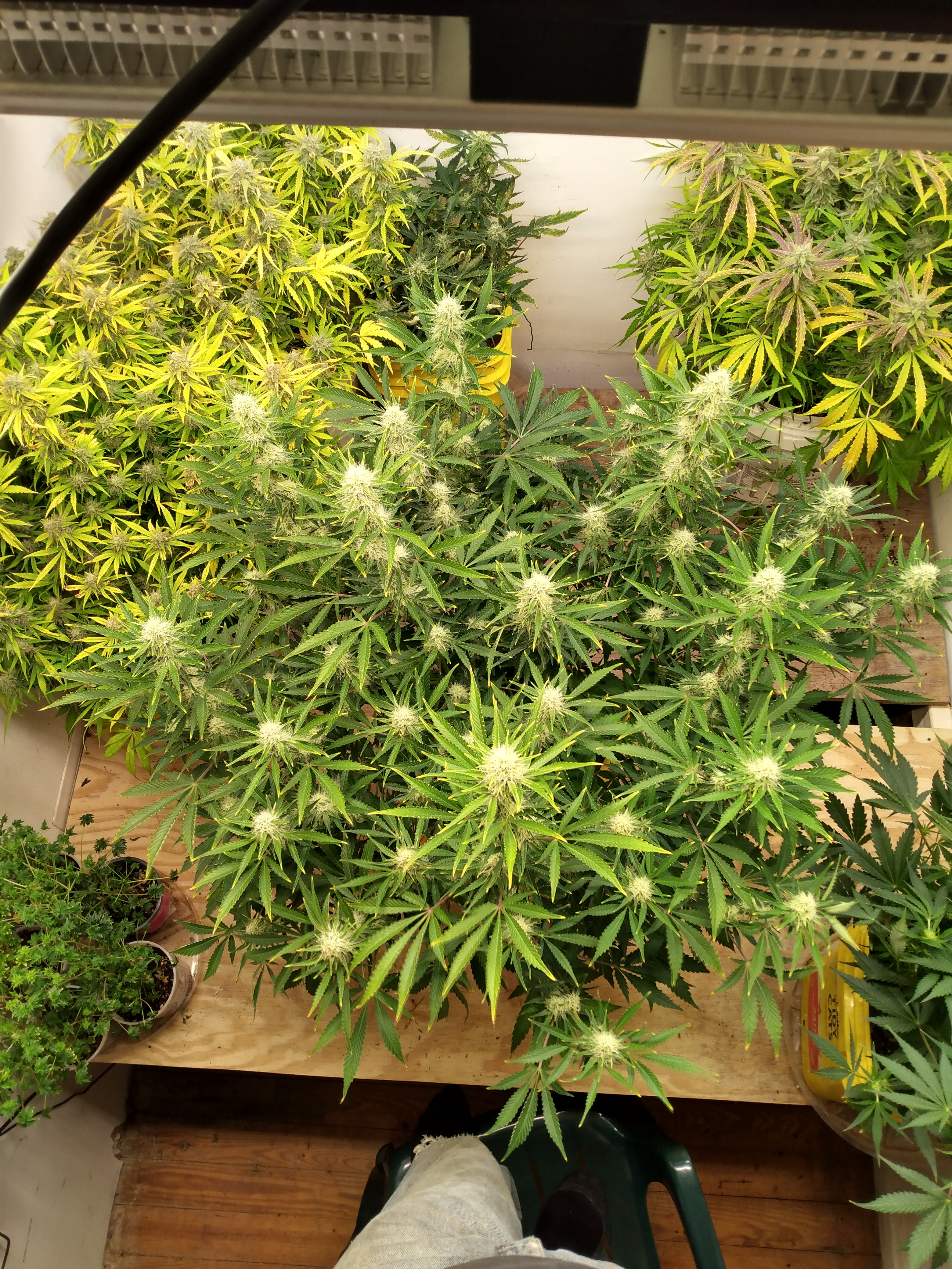 Flower Room: 11' x 7' x 7.5'H, 480w AC, 13gal/day dehumidifier, 1.5gal ultrasonic humidifier, 60gal (27gal usable) nute tank, 16" pedestal fan & 18" wall fan. Lighting and climate automated. Hand watering.