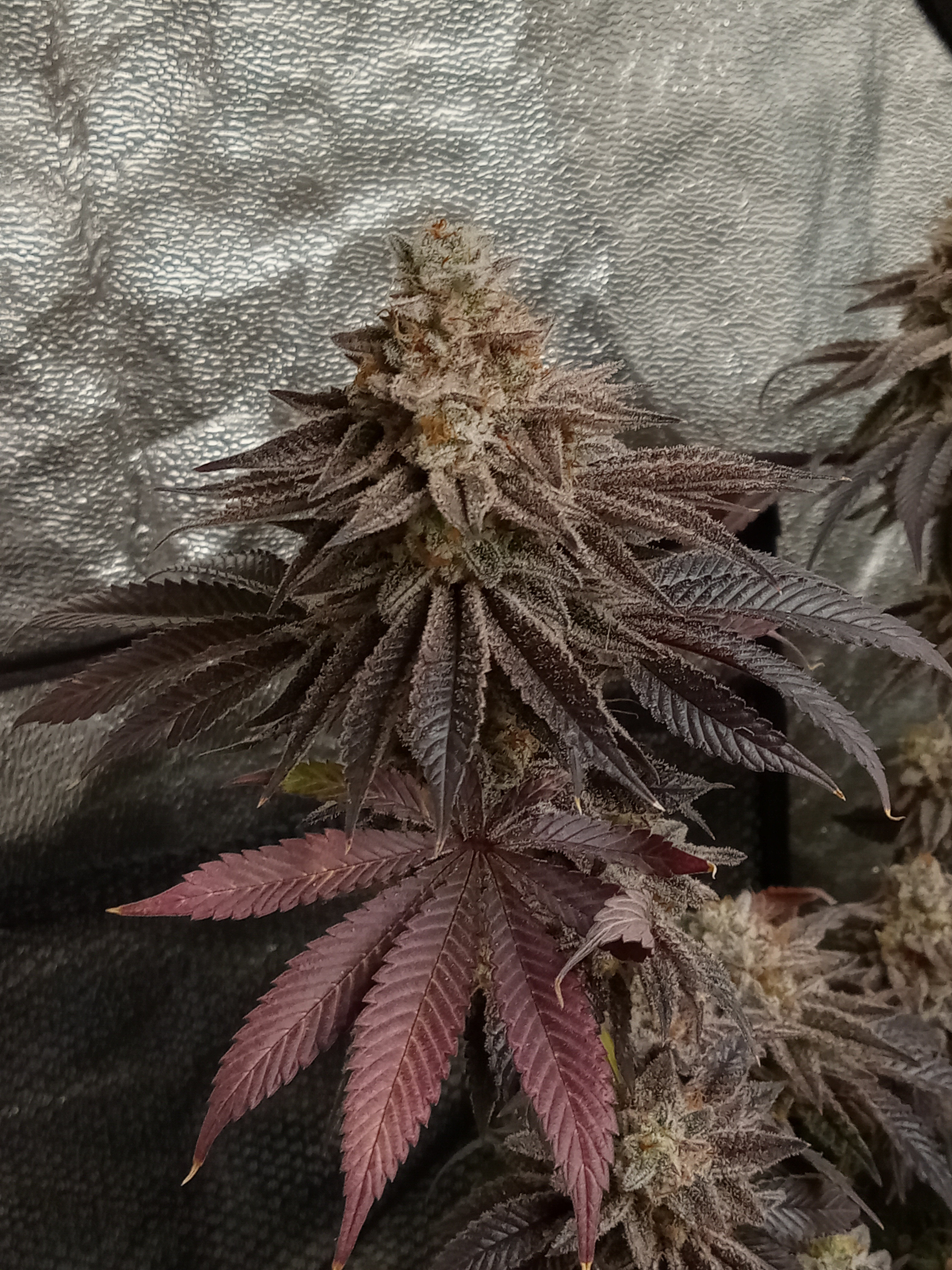 At one point I dosed the Plant a little heavy so nute burn didn't help the overall grow but hey! Them autos lived on a veg table for 81 and 86 days in 2 gallon pots grown under a 420w light dimmed down to 210 watts so not bad for a sideshow. 69 grams off the first plant and I expect about the same from the other, probably would have let them go another week but i need the space. The best thing about real purple weed is real purple keif