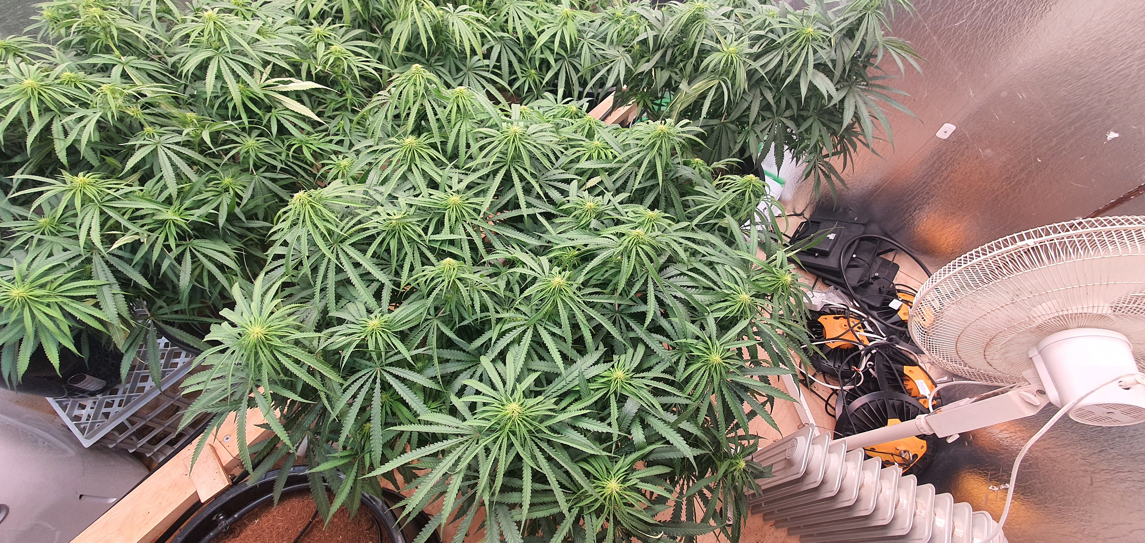 well after the steam pipe replacement I'm ready for the rest of the girls I am running a trial run with all the lights on, exhaust fan to check the heat fluctuations with the lights on and off the way I regulate the heat is to cycle the exhaust fan on and off and I dont want to put the new babys in there without knowing how the temps are the 6 girls in there now have been in the room for 1 week under a 315 lec left on 24/7 I had 1 midnight mass and 2 Banana Kush autos and 3 LSD autos. The Midnight Mass will be transplanted into a 20 gallon pot .