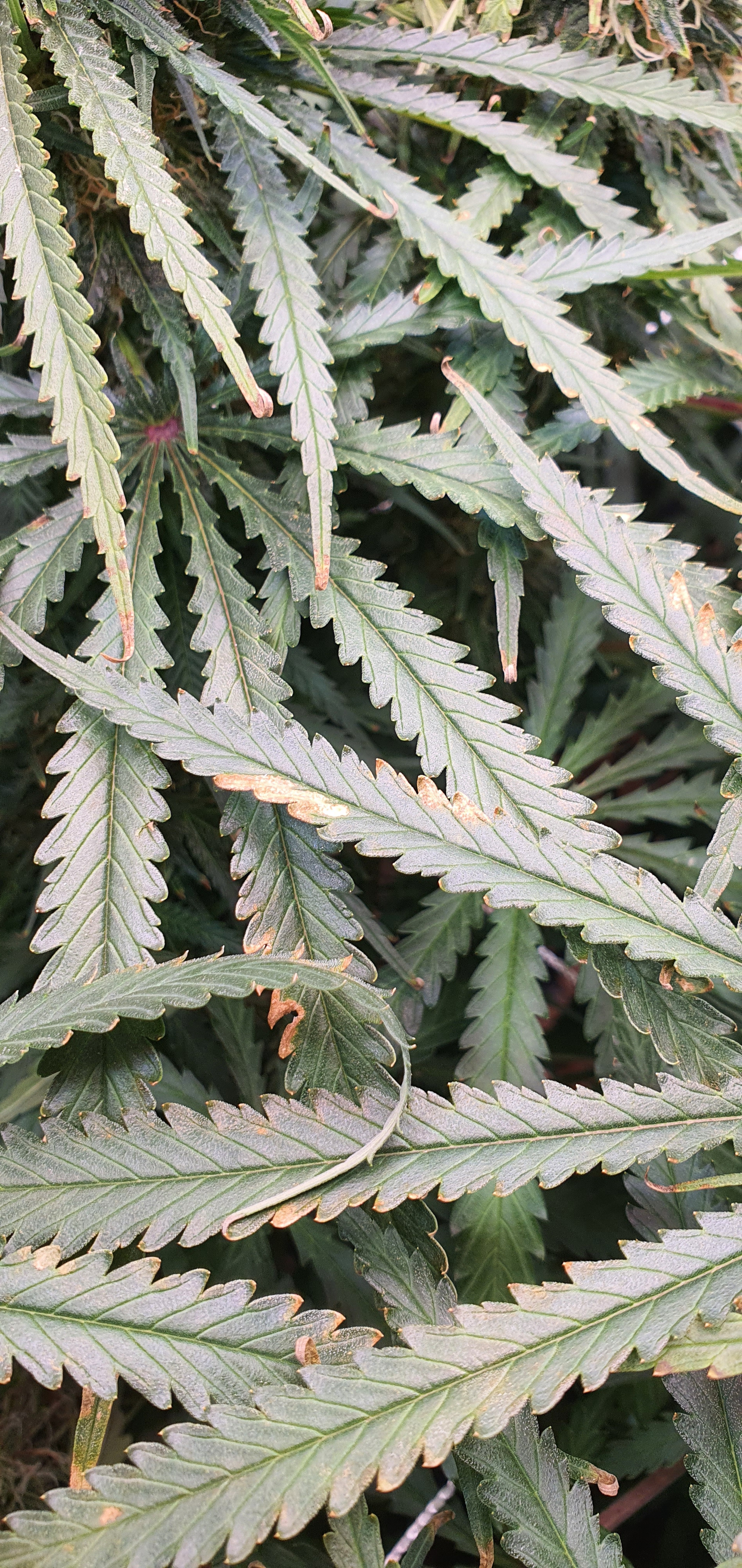 Brown spots, not rust like a Cal problem..haven't seen these before. Checked the nute tank..pH crept up to over 7....shit...emptied corrected and gave them a big flush...fingers crossed