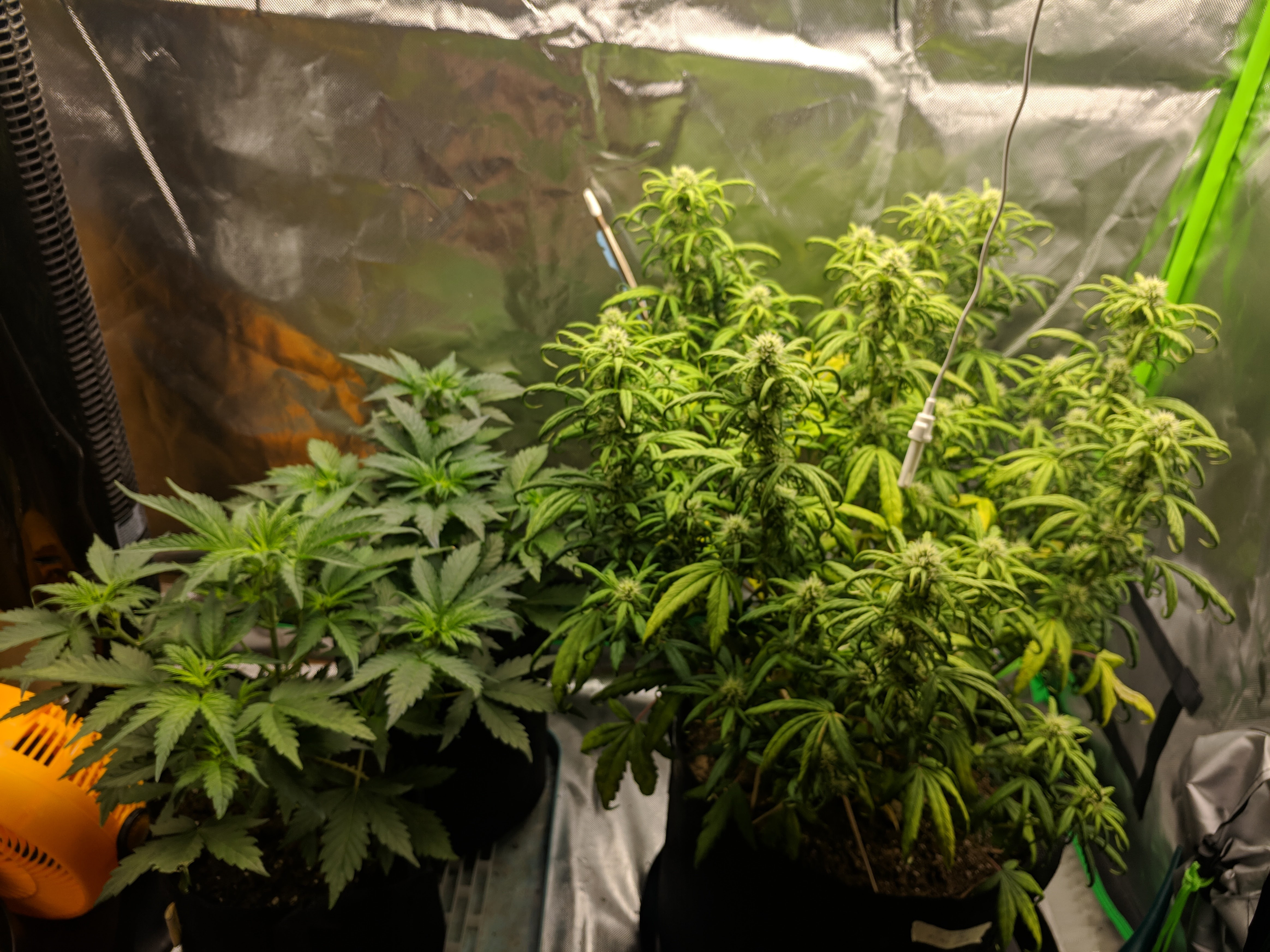 The one at the back left that is the lighter colour showing severe nute def on the highest fan leaves is a Thai x with the sativas in the front. It also has the tallest buds. The one at the back right I am still not sure what it is but it has the thickest Budd.. it's a mutant so working out what it is has confused me. I have never been able to take these plants to the end of a harvest window in great condition yet as I've only grown outdoors and struggled to get the quality I needed for that.