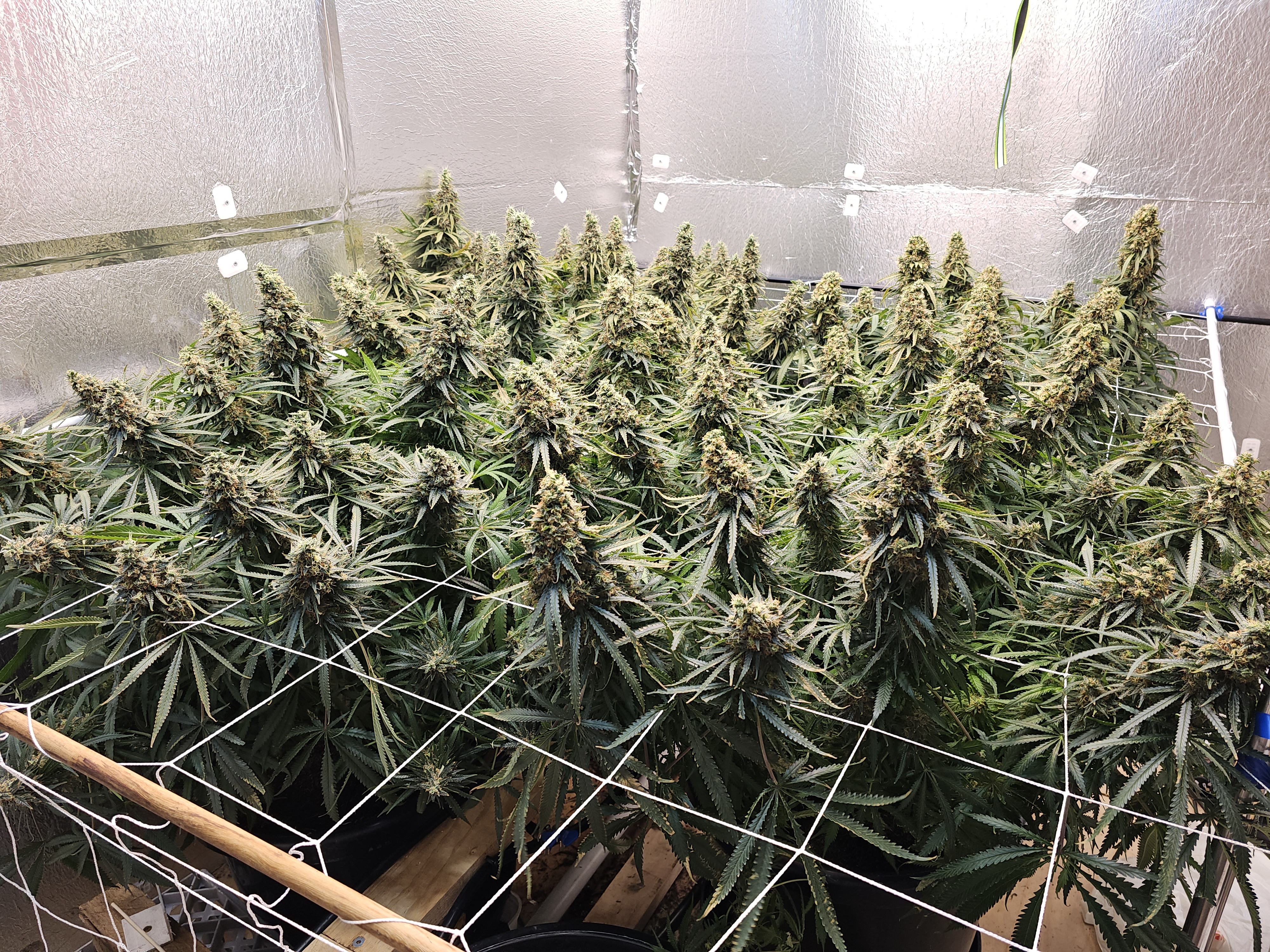 Flower Room: 11' x 7' x 7.5'H, 480w AC, 13gal/day dehumidifier, 1.5gal ultrasonic humidifier, 60gal (27gal usable) nute tank, 16" pedestal fan & 18" wall fan. Lighting and climate automated. Hand watering.