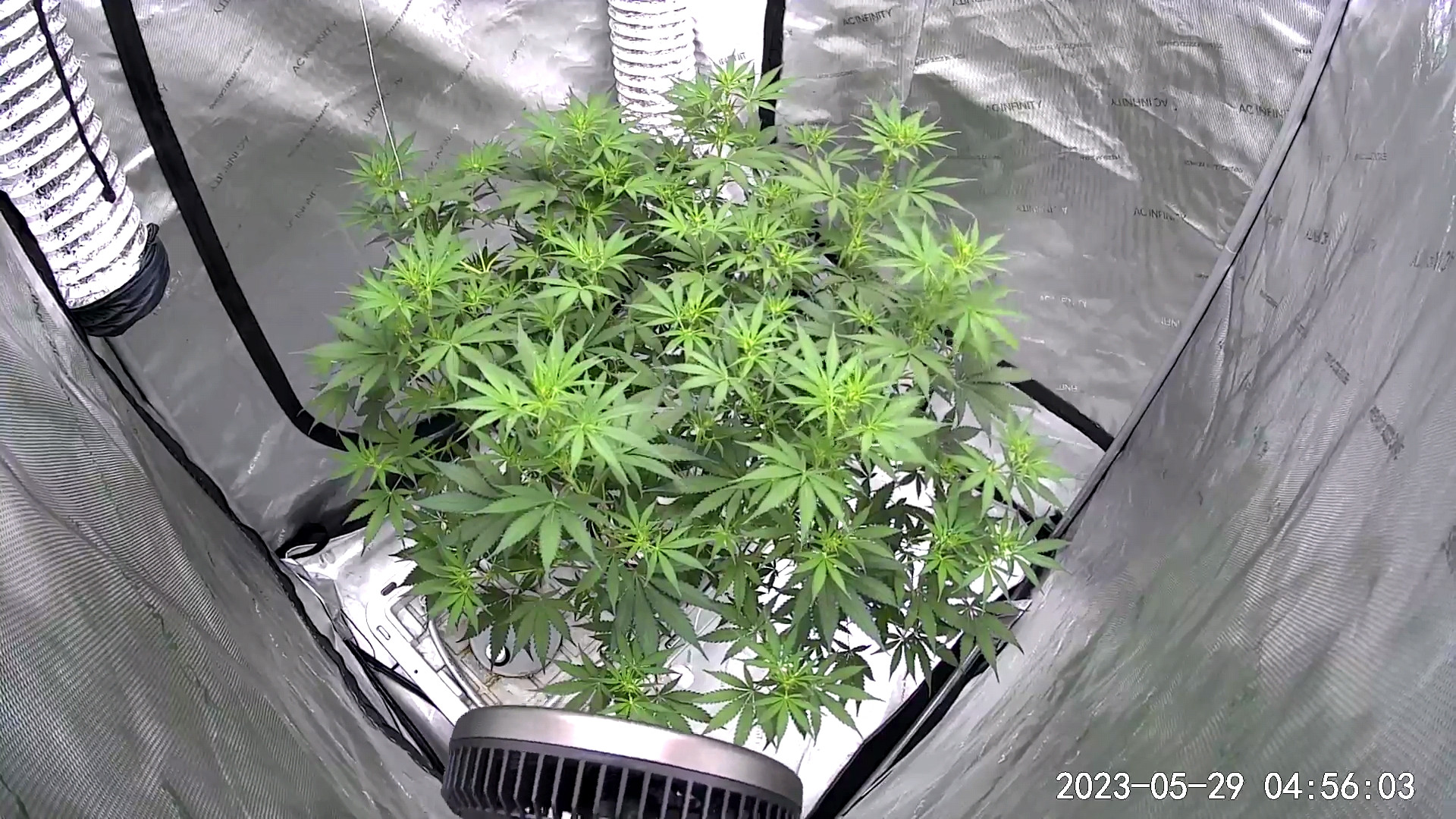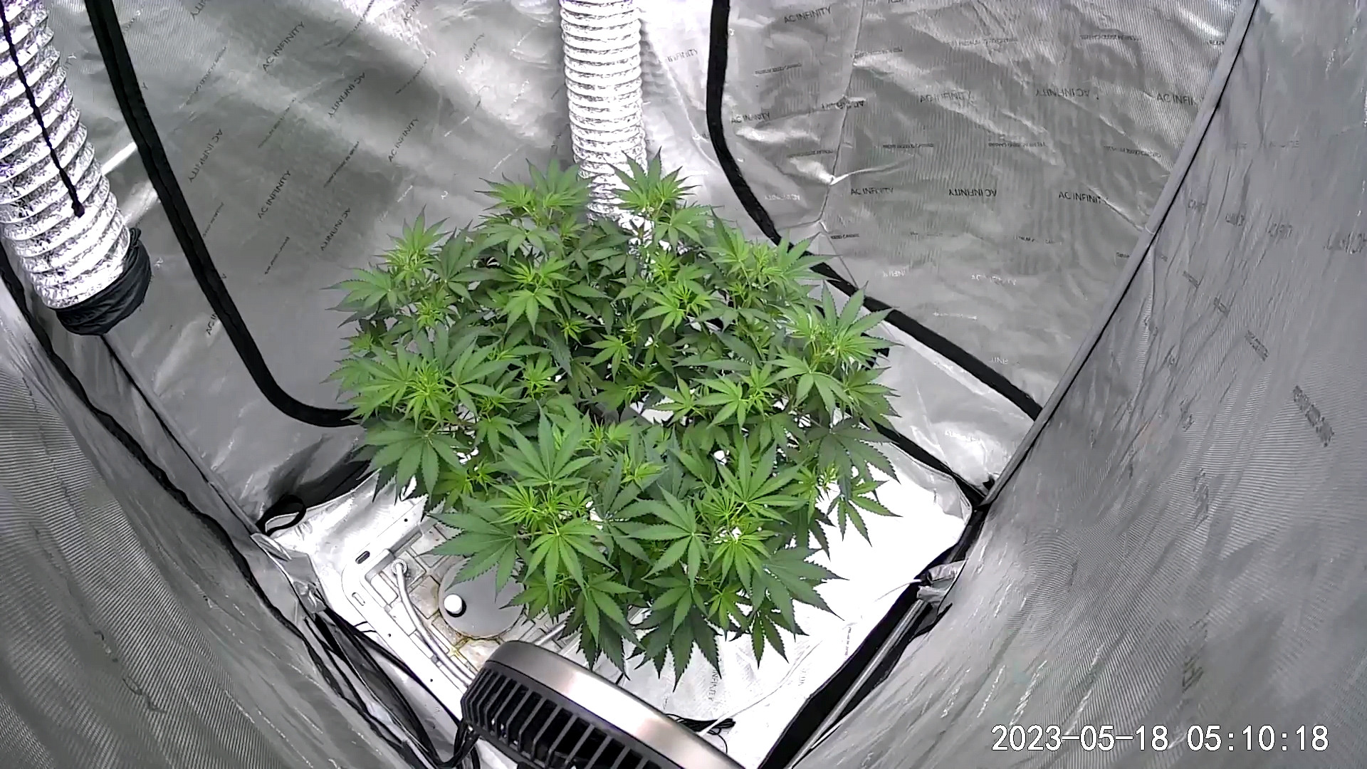 Flower Room: 11' x 7' x 7.5'H, 480w AC, 13gal/day dehumidifier, 1.5gal ultrasonic humidifier, 60gal (27gal usable) nute tank, 16" pedestal fan & 18" wall fan. Lighting and climate automated. Hand watering.