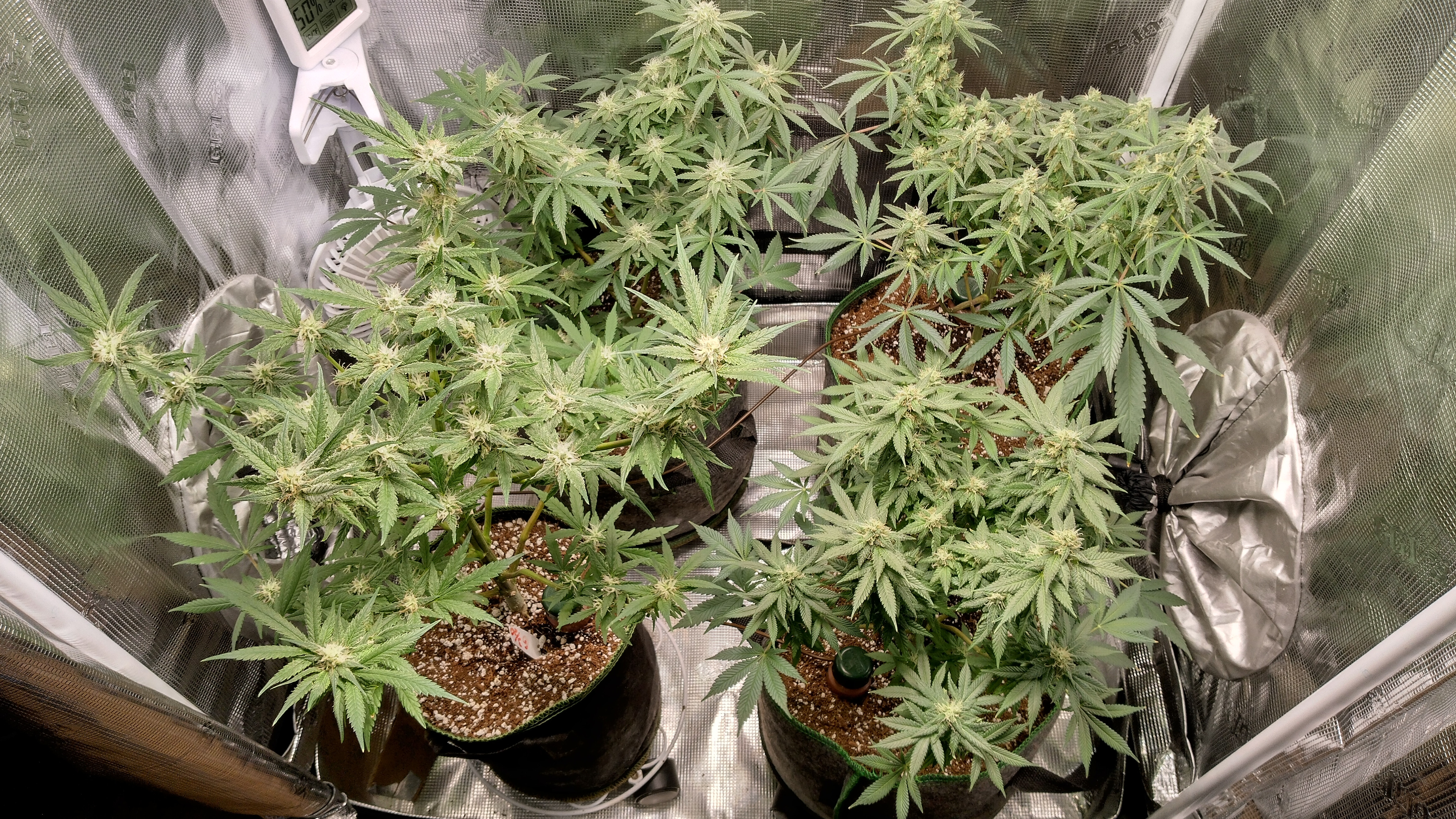47days from seed 14days in flower. 2 OG Kush 3gal fabric, my mix of soil. All seems to be going fine, did my last of the leaf removal today won't be doing much more. No training, no topping this time around. Gave them 1tbls of unsulferated molasses yesterday in 1/2 gal water each. Serving them 3-12-6 bloom everyother watering.