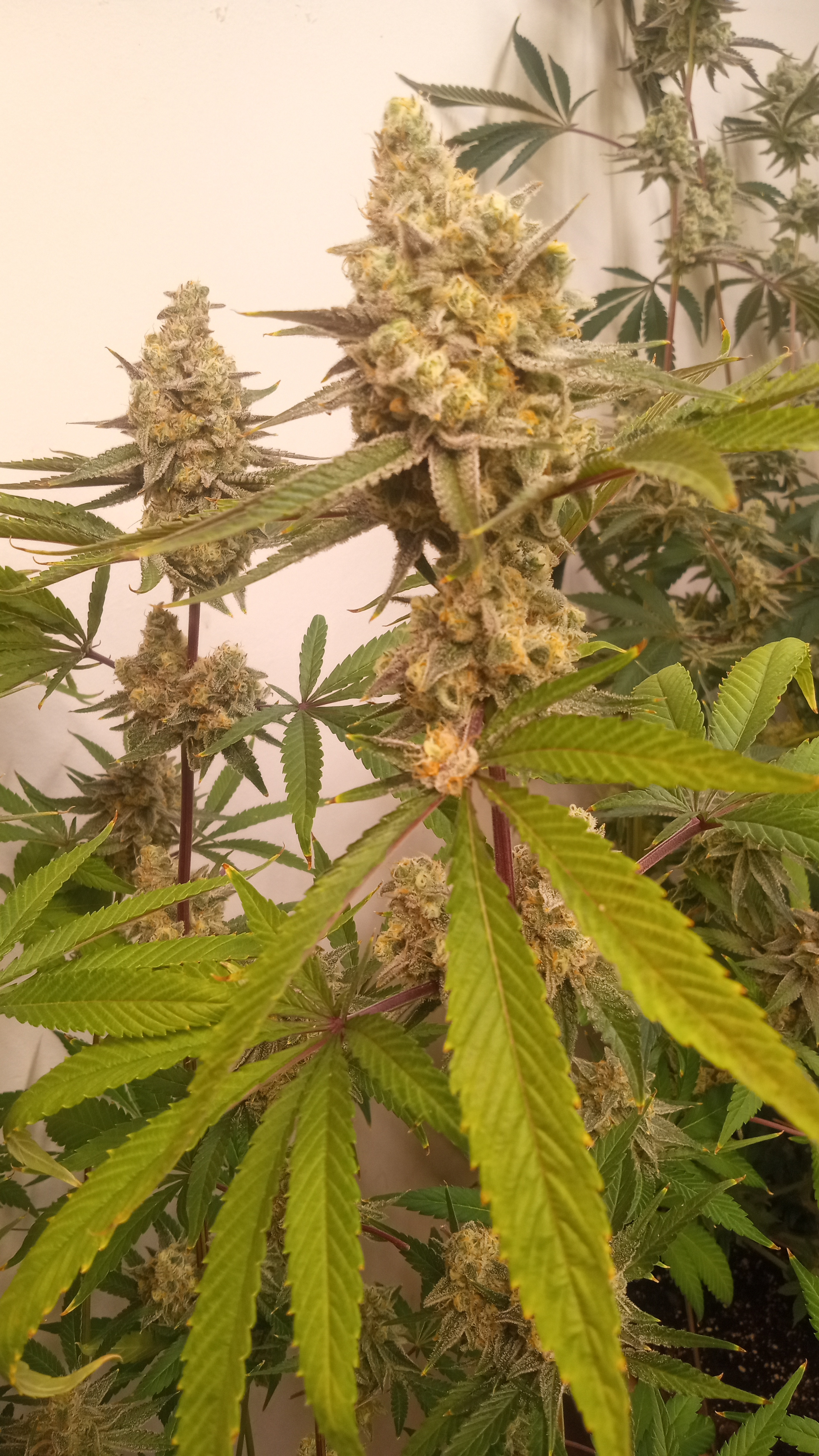 The fat centre front is an Orange Zkittles x Sour Diesel photoperiod, also drinking heaps. Topping it this week for cloning. It will be a big clone going into an aeroponics cloning bucket along with a few other lower branches for clones. I done almost zero training on this one but about to start...3 weeks too late but she'll recover.