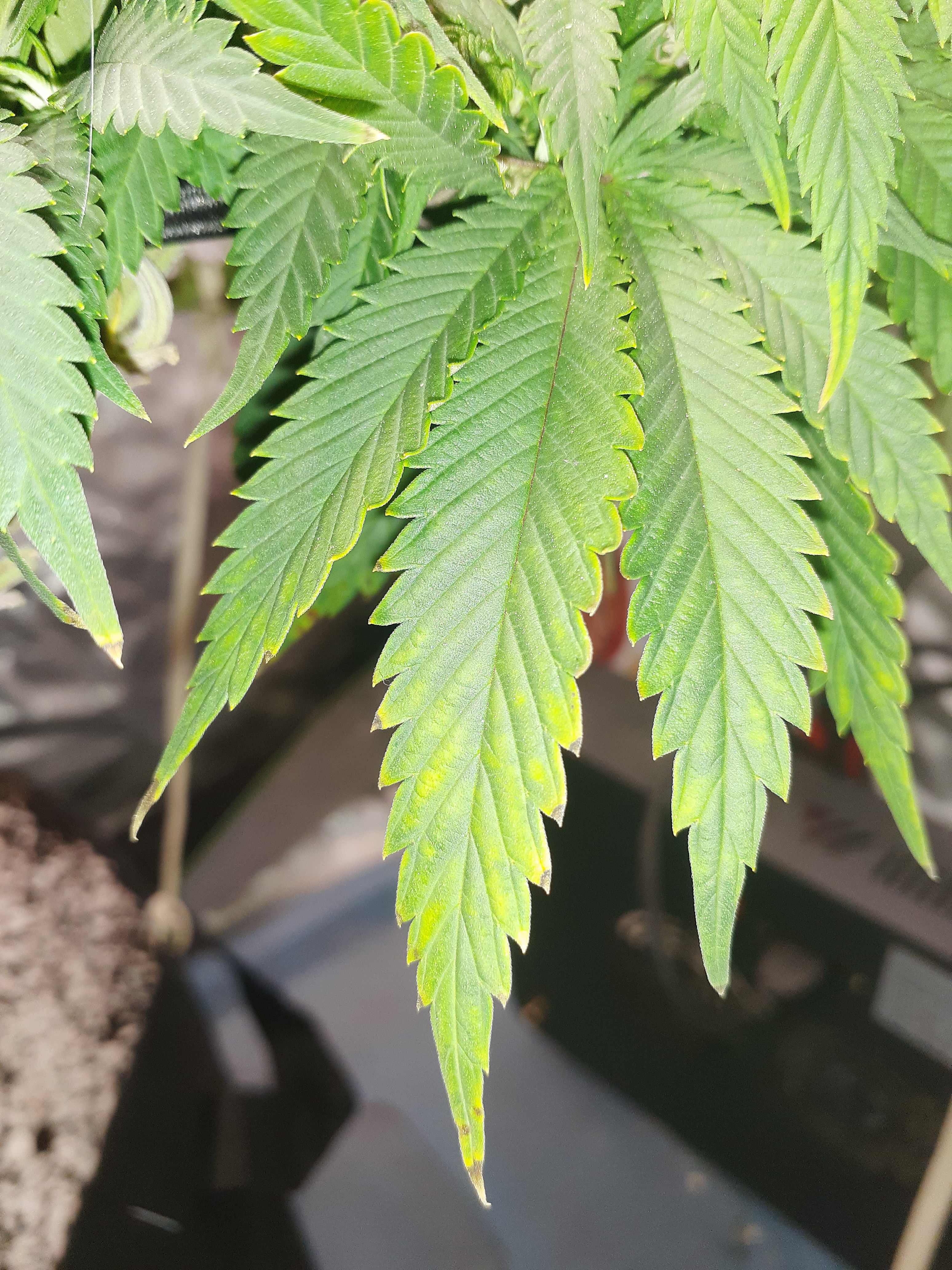 So my grow started, most things are going well. After re potting from a 3 to 5 gallon, my seed momma started showing lower leaf stress. Any diagnosis. I can share all my ppm. Ph etc. This one has me stumped.