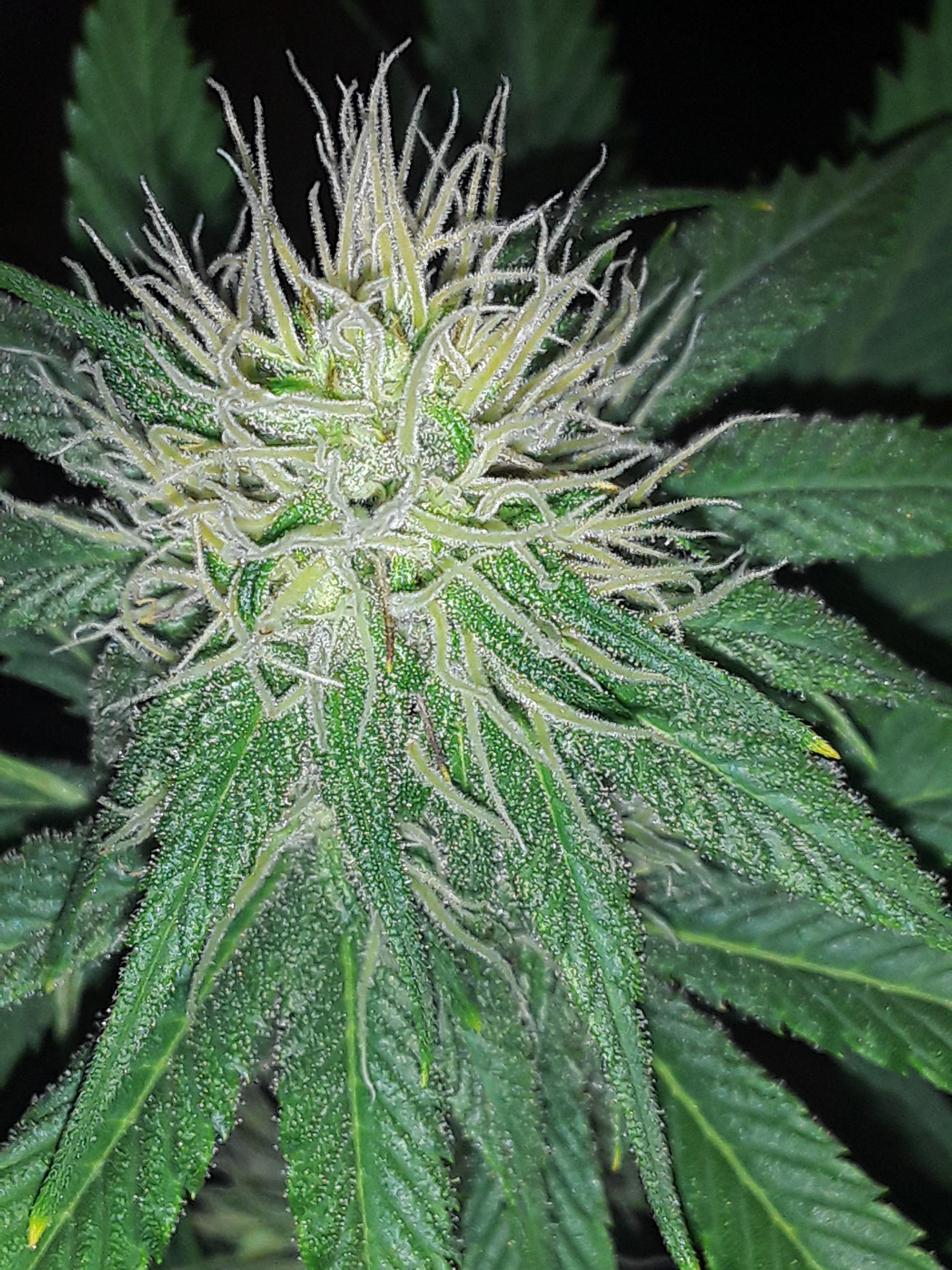 White Widow auto got a haircut again today. Just as I did a few weeks ago, I’ve left her a hula skirt of fan leaves and primarily thinned her out from the top down and always leaving at least one fan leaf at the furthest tip of every branch/cola. Still not sure about those large single finger leaves in the kolas. I can’t find anything online if those perform as a fan leaf (root driver) or sugar leaf (resin driver). So I try to let them be since they really aren’t blocking light from lower bud sites.
