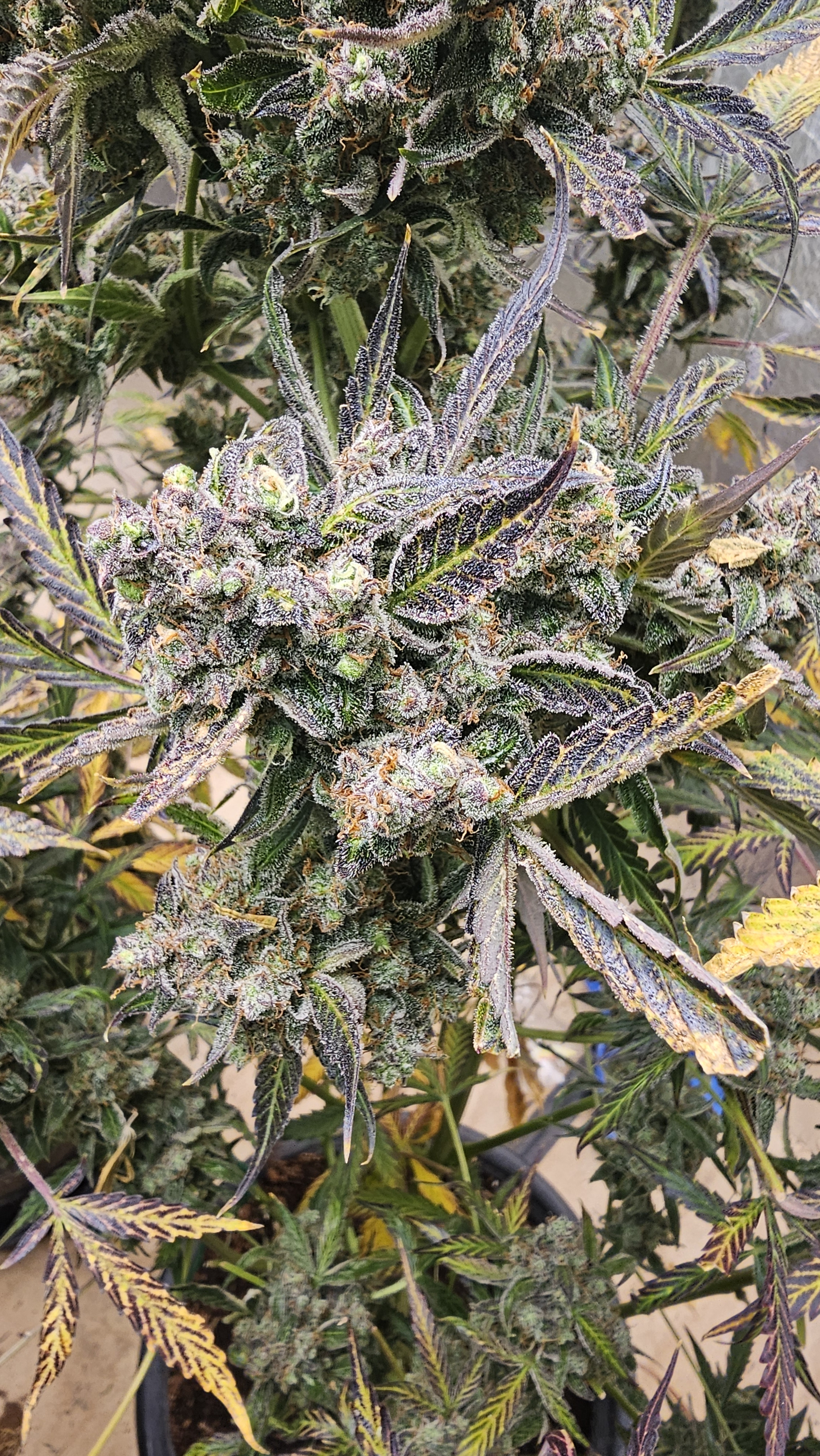 4 weeks from spouting. Had a little trouble. The Evo light at same PPFD as the S24 caused light burn at 600 PPFD. Had to dial it down to 500. It's slight, but I caught it in time. You can barley see it in the pics. I'm flipping in the next 48 hours and will not be using lst. They are compact and bushy. No need. GG4 whole other ballgame. I see these stretching minimal. Thirsty. Gallon every 24 hours. Last 2 waterings plain water. Don't want buildup. Next watering 1 tsp terp tea bloom.2 Photos