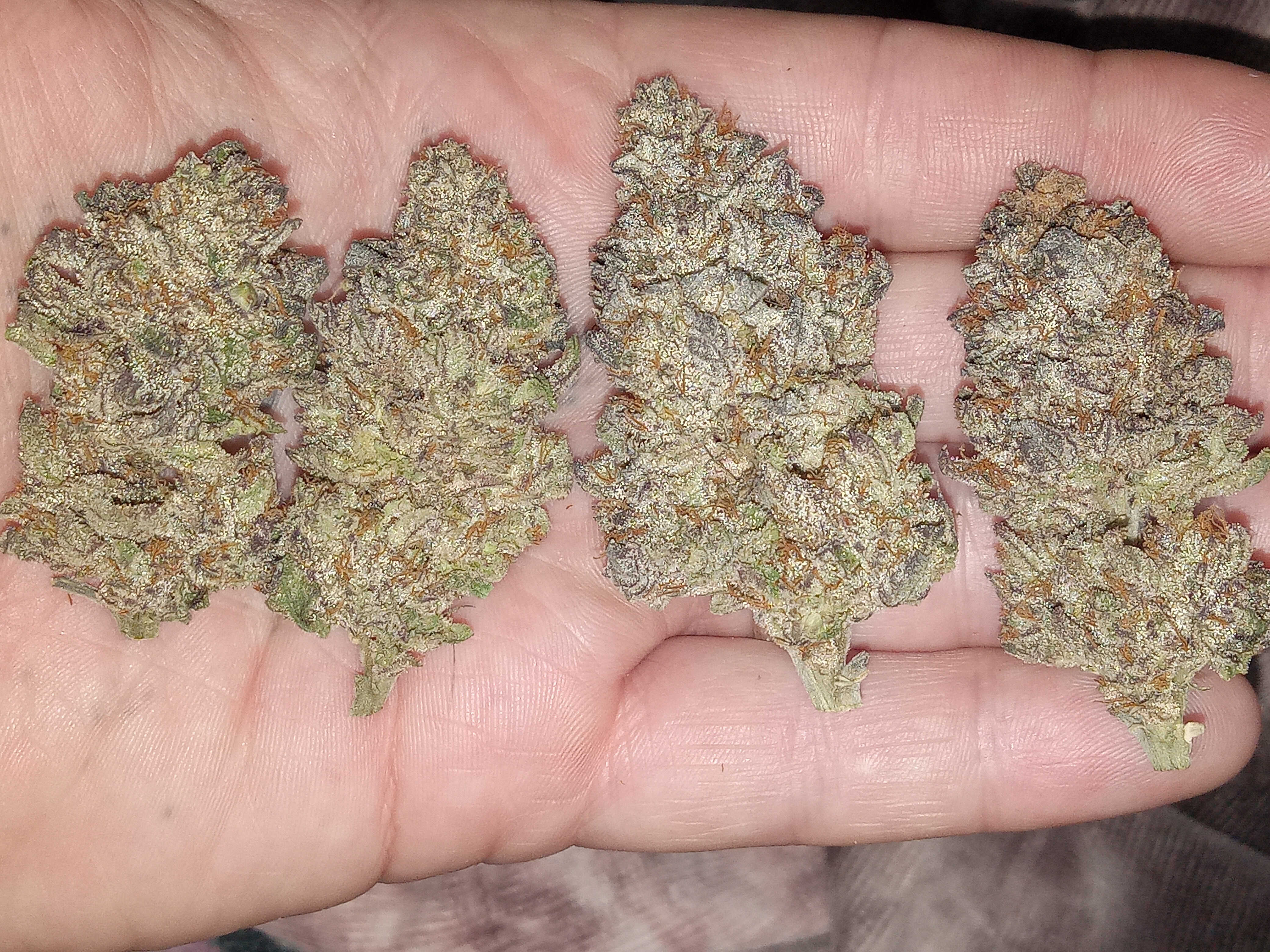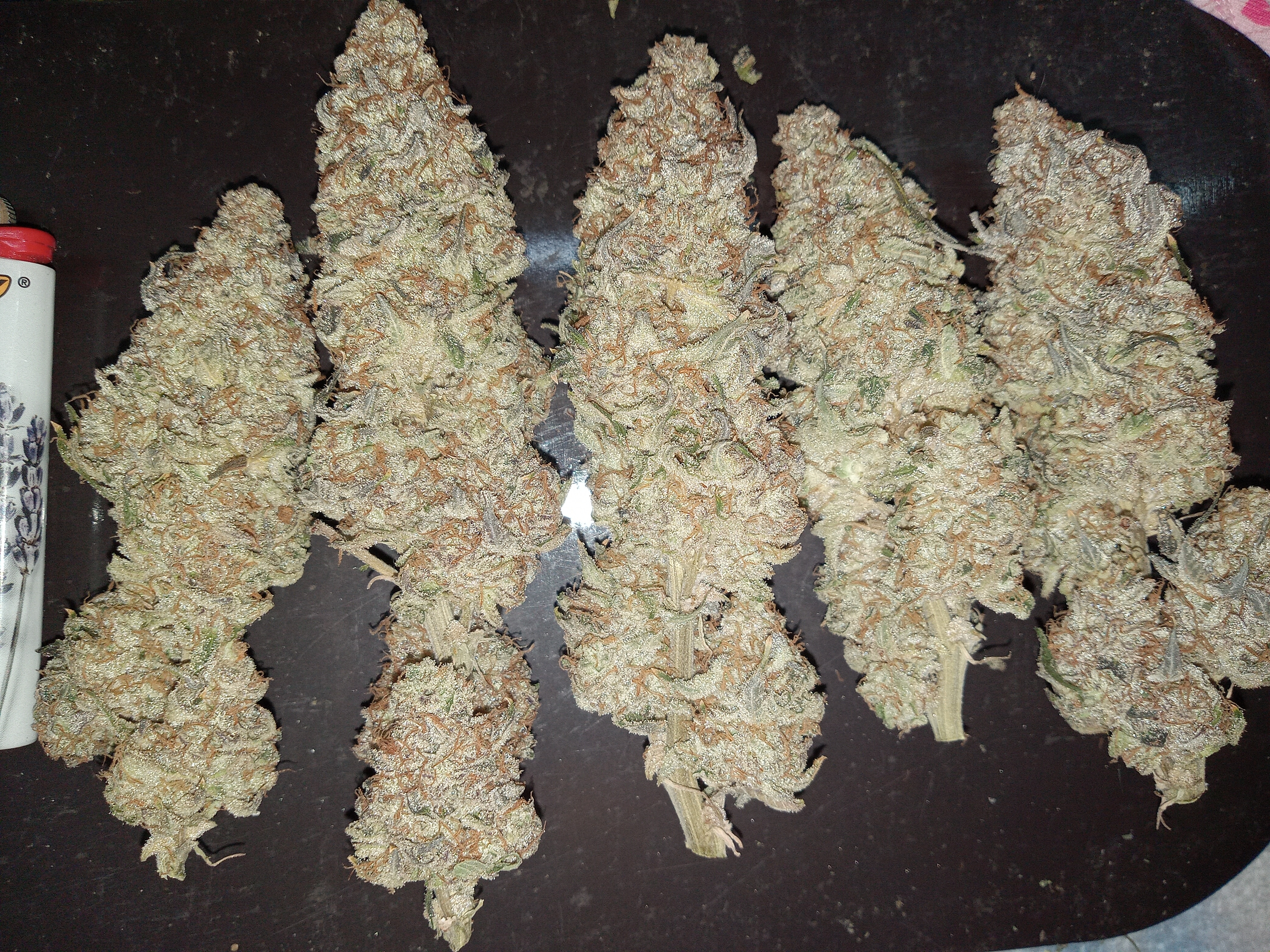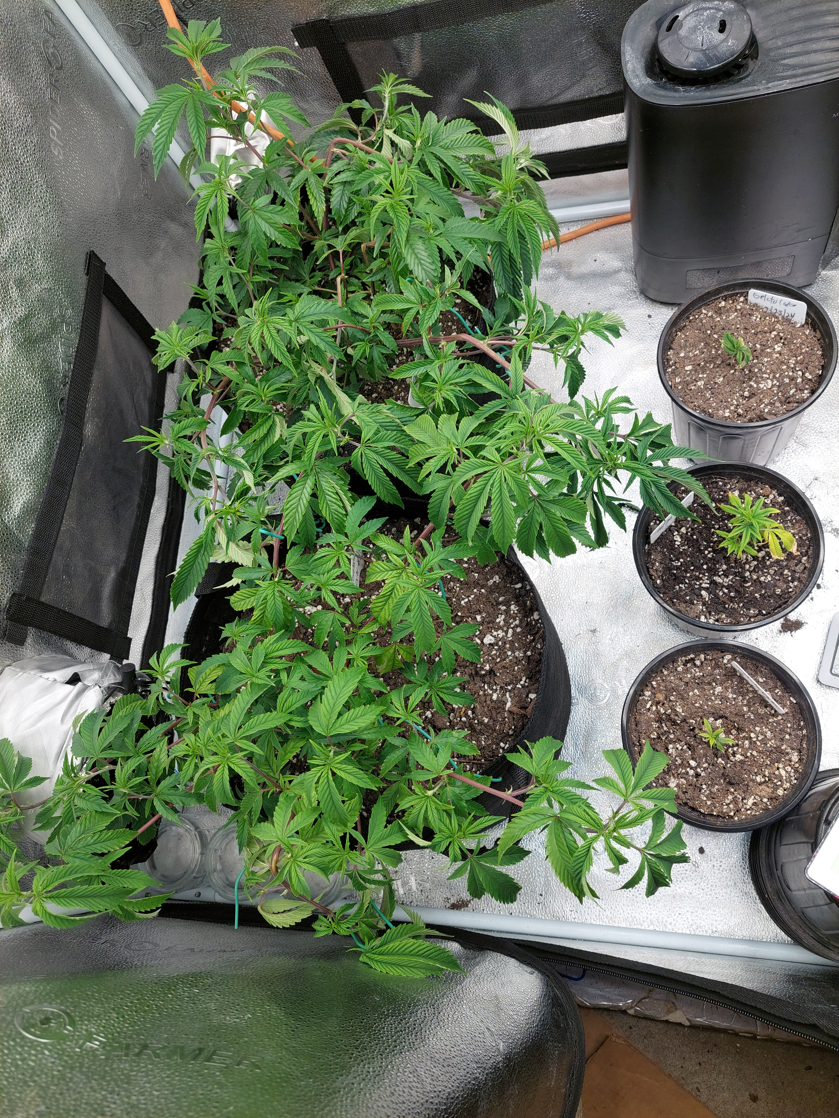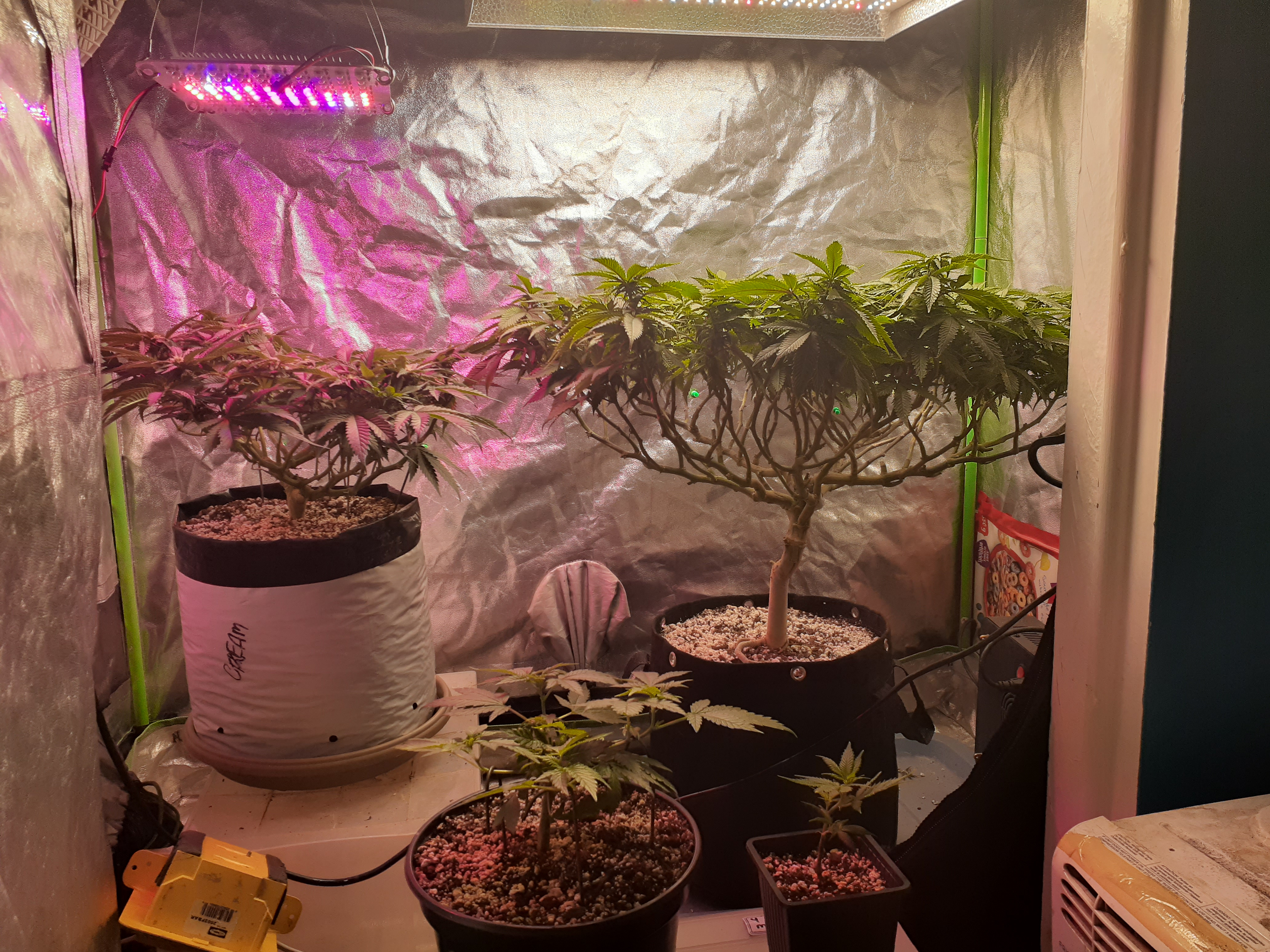 Five weeks into flower. Having trouble masking the odor in the house even with the 24-hour carbon filter moving tent air outside. The Chemdawgs (middle) are particularly dank!