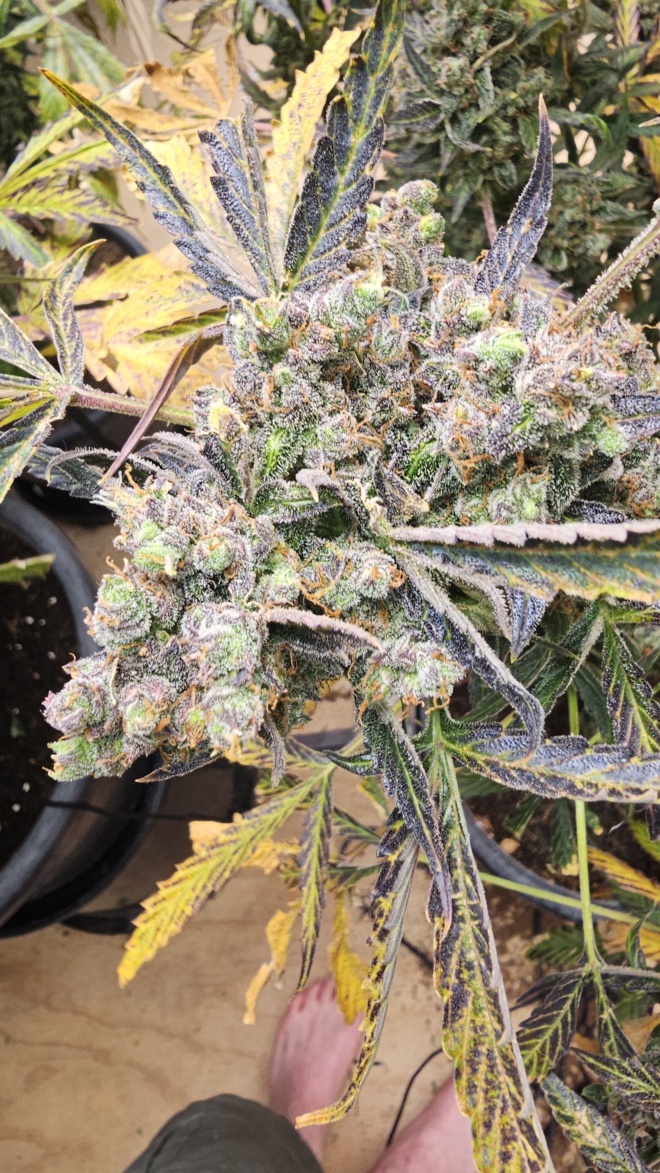 4 weeks from spouting. Had a little trouble. The Evo light at same PPFD as the S24 caused light burn at 600 PPFD. Had to dial it down to 500. It's slight, but I caught it in time. You can barley see it in the pics. I'm flipping in the next 48 hours and will not be using lst. They are compact and bushy. No need. GG4 whole other ballgame. I see these stretching minimal. Thirsty. Gallon every 24 hours. Last 2 waterings plain water. Don't want buildup. Next watering 1 tsp terp tea bloom.2 Photos