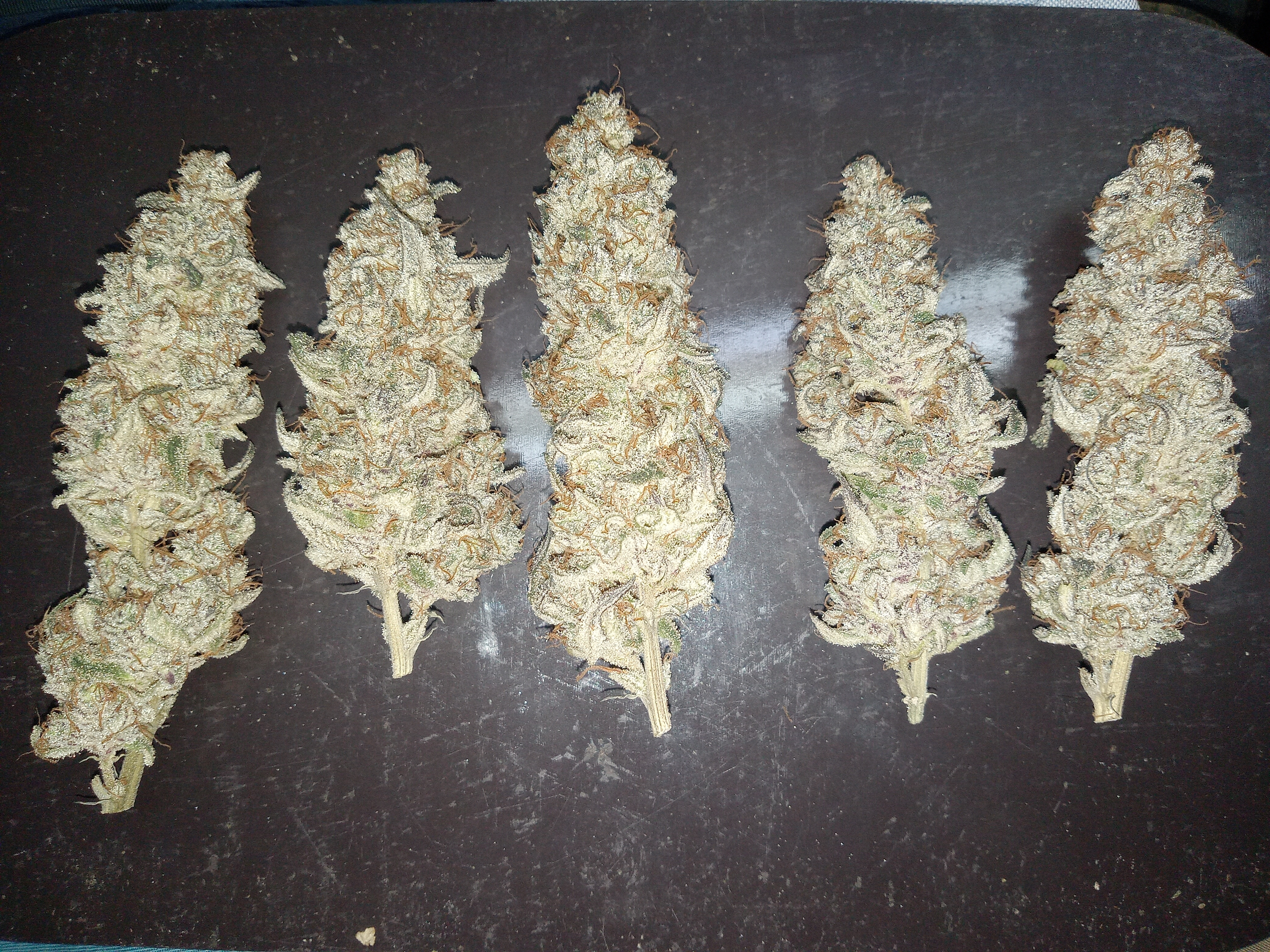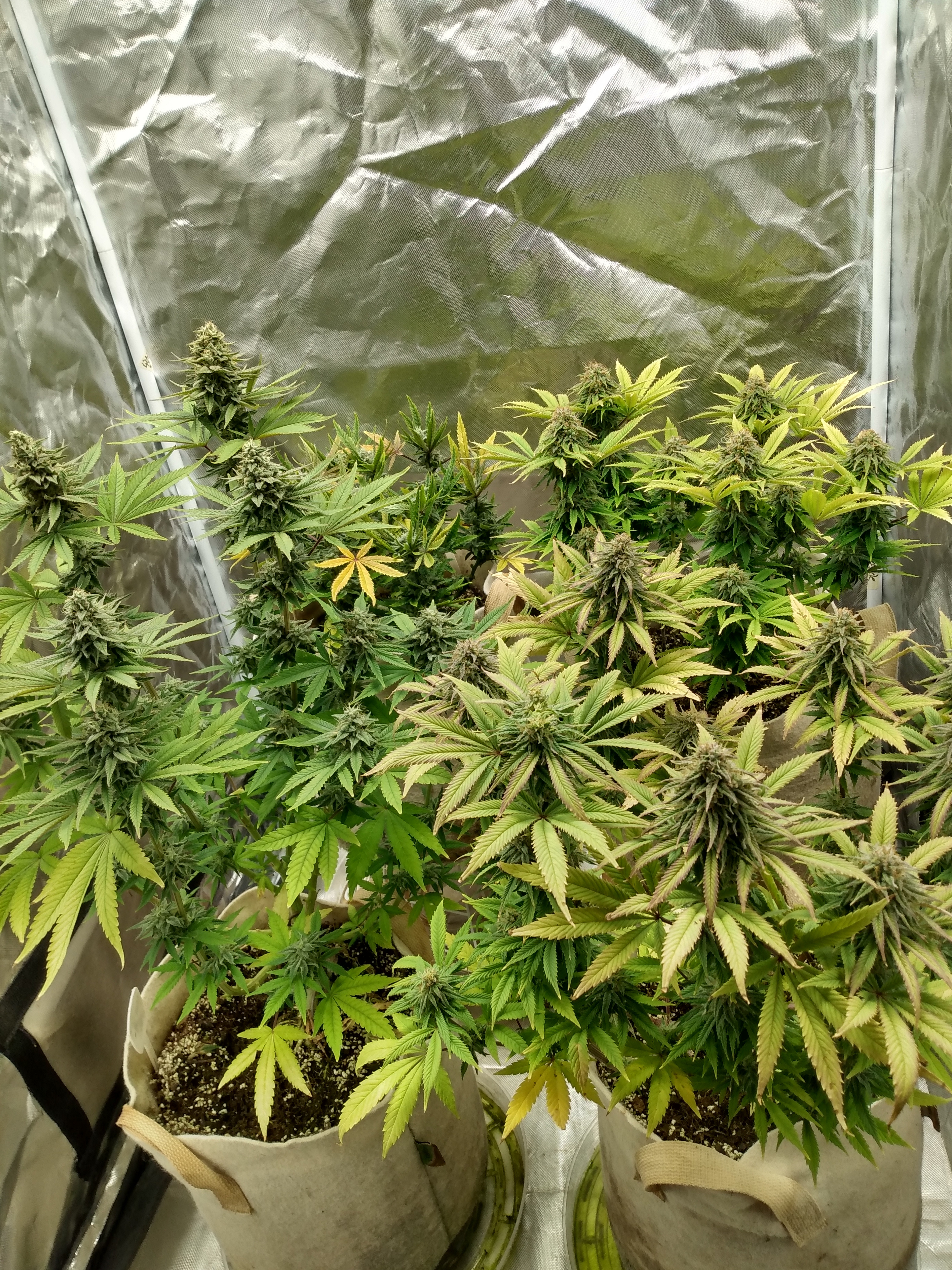 Five weeks into flower. Having trouble masking the odor in the house even with the 24-hour carbon filter moving tent air outside. The Chemdawgs (middle) are particularly dank!