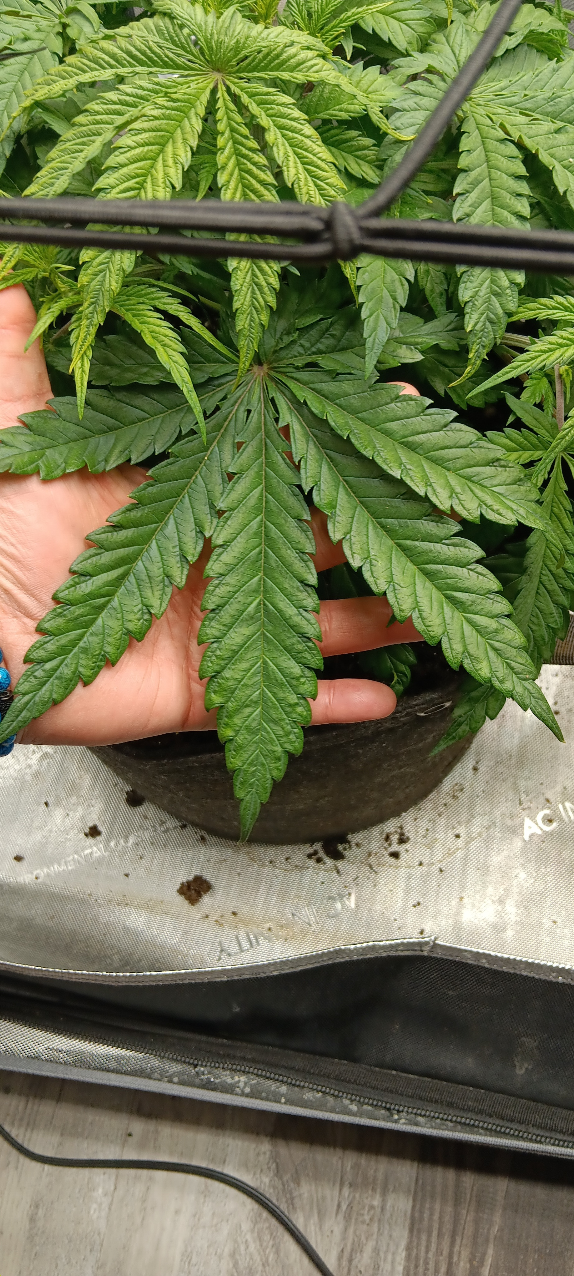 4 weeks from spouting. Had a little trouble. The Evo light at same PPFD as the S24 caused light burn at 600 PPFD. Had to dial it down to 500. It's slight, but I caught it in time. You can barley see it in the pics. I'm flipping in the next 48 hours and will not be using lst. They are compact and bushy. No need. GG4 whole other ballgame. I see these stretching minimal. Thirsty. Gallon every 24 hours. Last 2 waterings plain water. Don't want buildup. Next watering 1 tsp terp tea bloom.2 Photos
