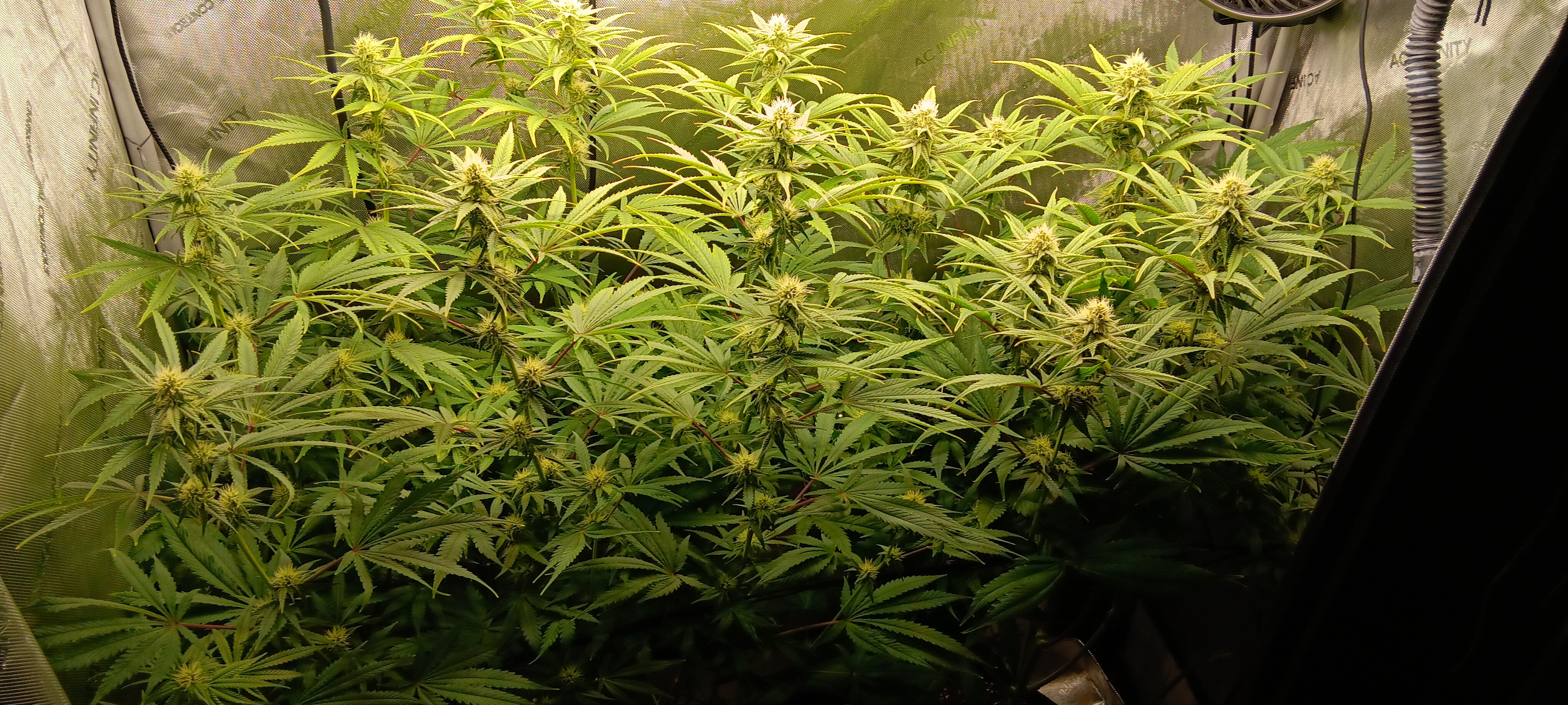 Flower Room: 11' x 7' x 7.5'H, 480w AC, 13gal/day dehumidifier, 1.5gal ultrasonic humidifier, 60gal (27gal usable) nute tank, 16" pedestal fan & 18" wall fan. Lighting and climate automated. Hand watering.