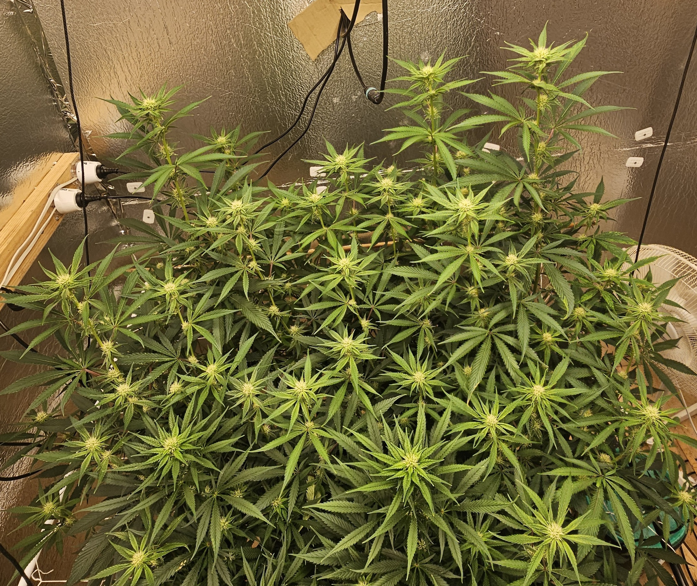 Flower Room: 11' x 7' x 7.5'H, 480w AC, 13gal/day dehumidifier, 1.5gal ultrasonic humidifier, 60gal (27gal usable) nute tank, 16" pedestal fan & 18" wall fan. Lighting and climate automated. Hand watering.