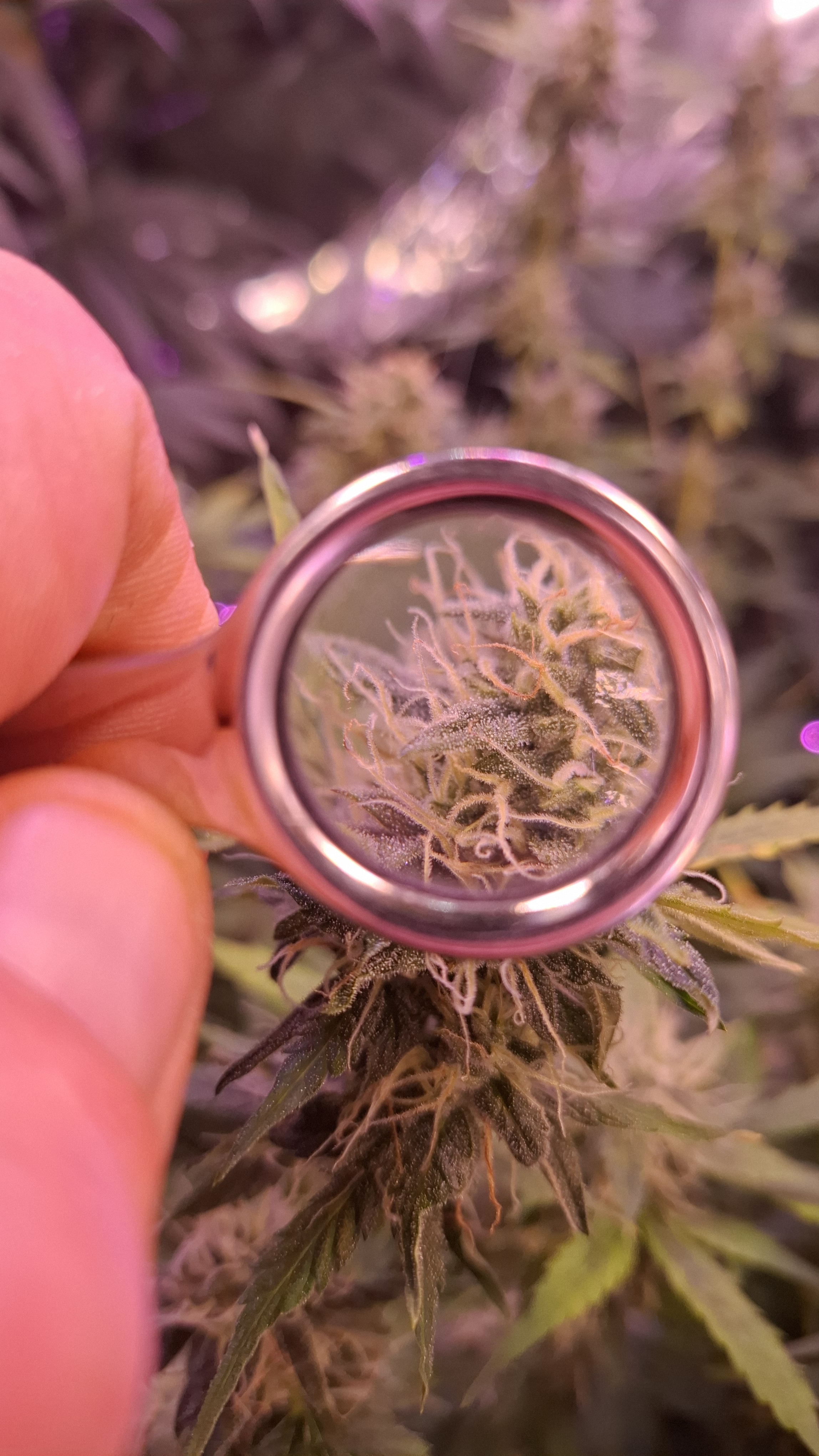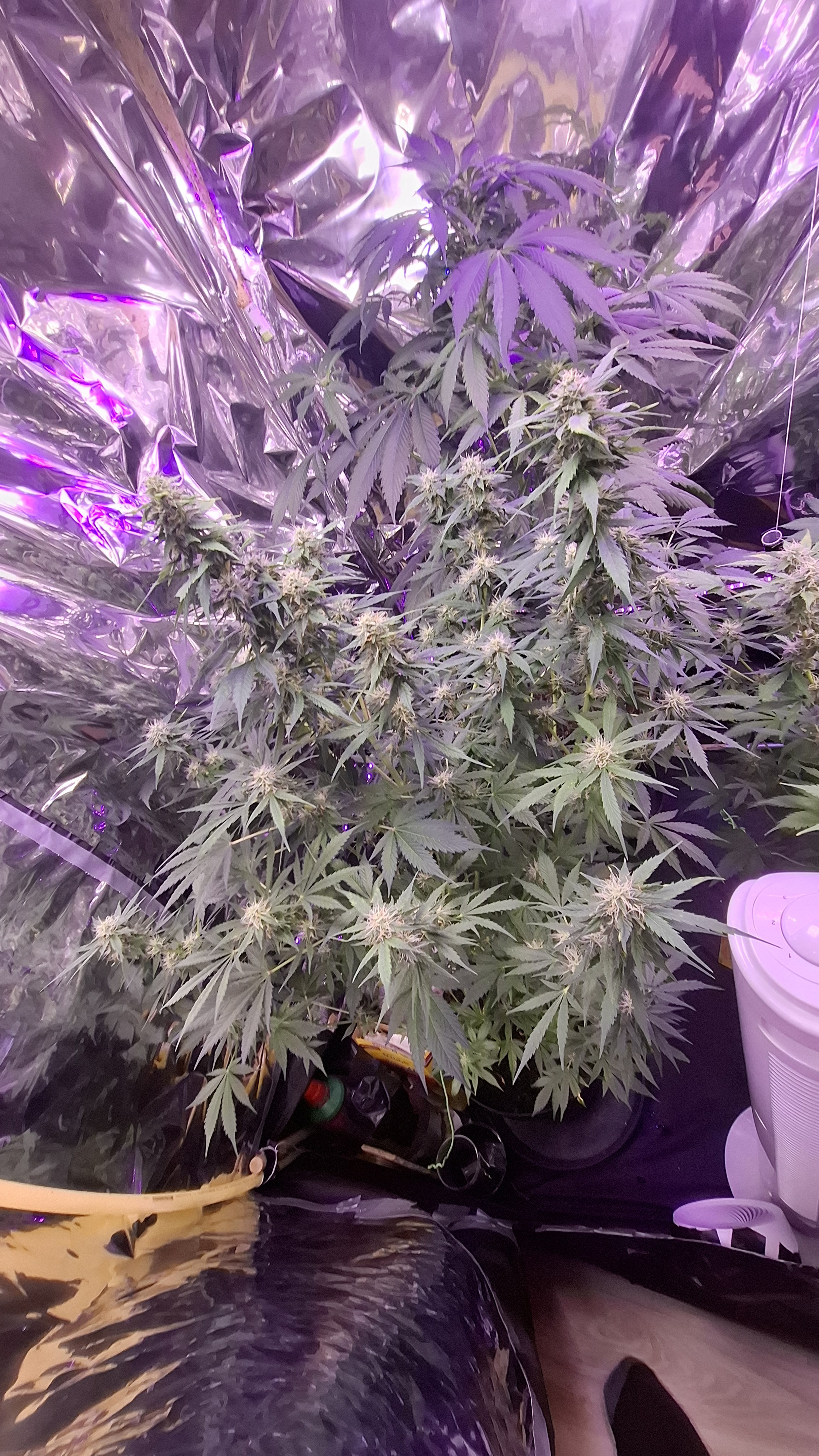 Gotta check the trichomes outside the tent. Better under natural light. That yellow light won't let you see the amber trichomes. But yeah. Kinda look ready to me