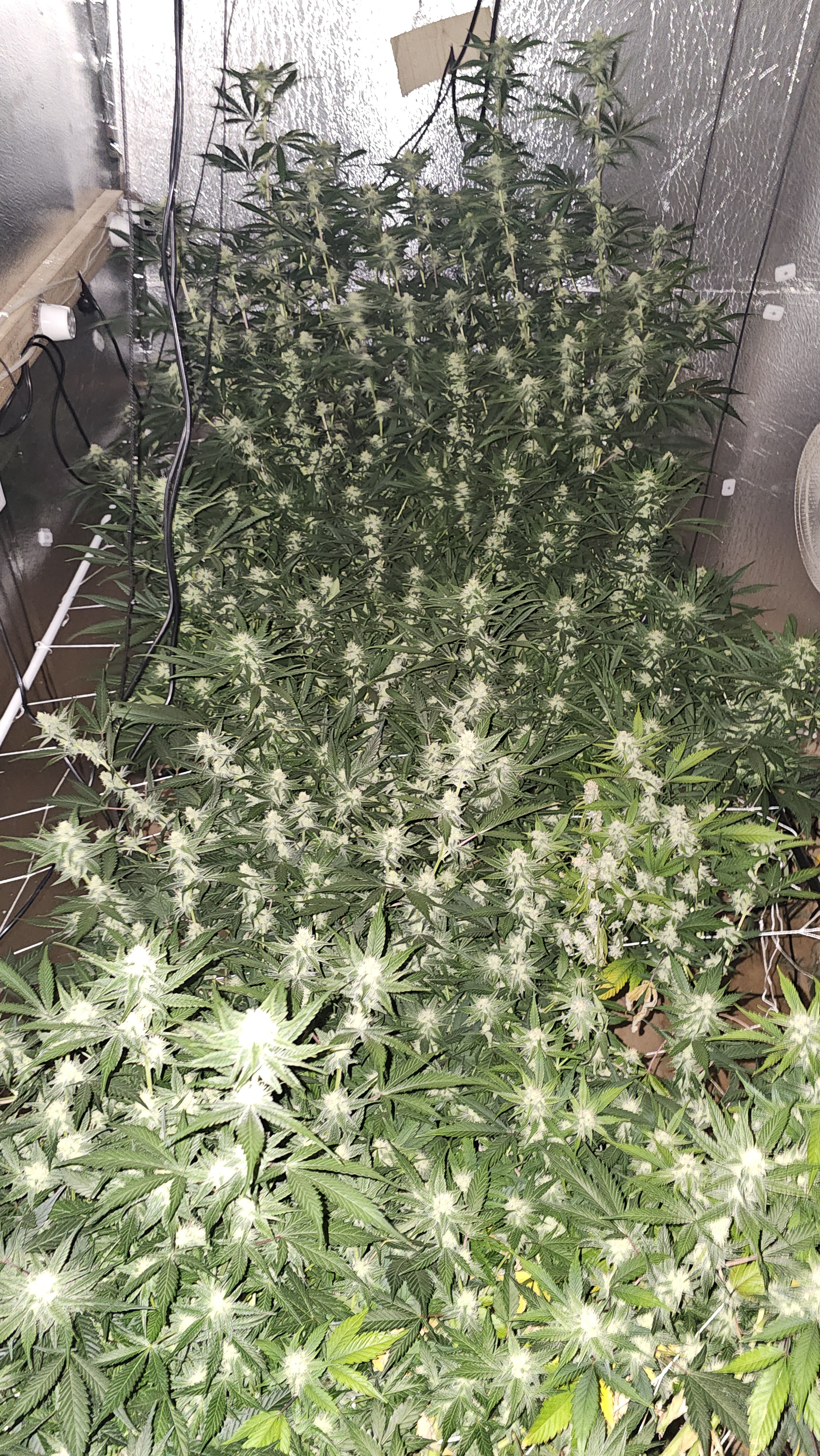 Flower Room: 11' x 7' x 7.5'H, 480w AC, 13gal/day dehumidifier, 1.5gal ultrasonic humidifier, 60gal (27gal usable) nute tank, 16" pedestal fan & 18" wall fan. Lighting and climate automated. Hand watering.